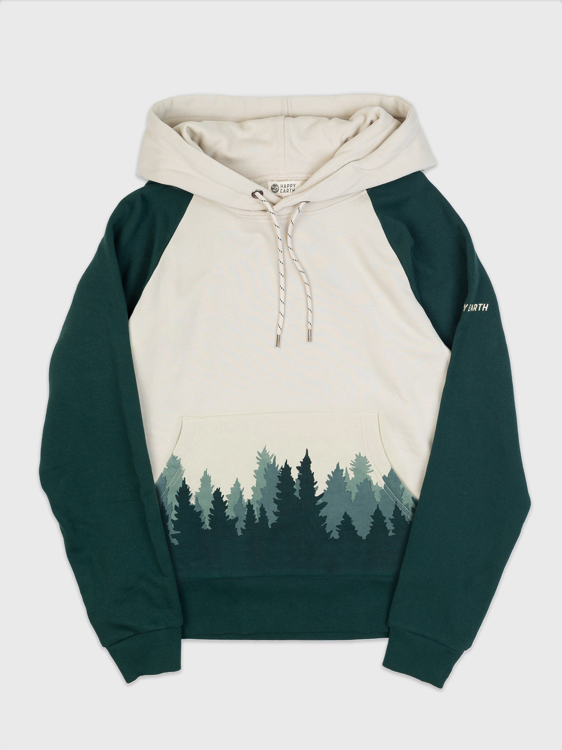 A forest of firs decorates this hoodie's extra-roomy pocket. The green and beige of the fabric create a disappearing effect, as the forest fades into the mist.
