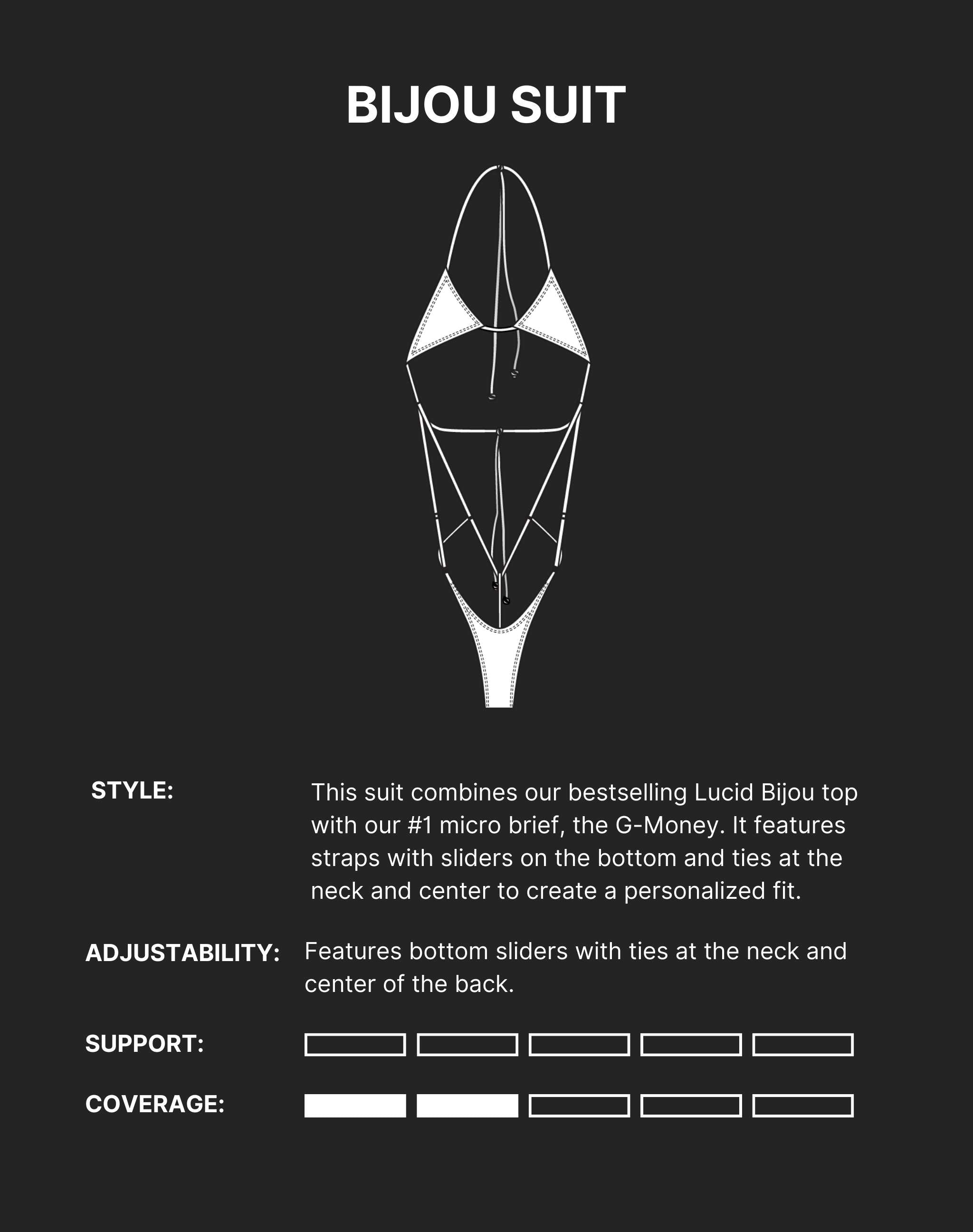 Unleash your inner goddess with the Bijou Onesie One Piece Swimsuit, designed to make you feel fierce, sexy, and unstoppable. This bold and daring swimsuit combines our bestselling Lucid Bijou top with the iconic G-Money micro brief, offering unparalleled style and confidence.