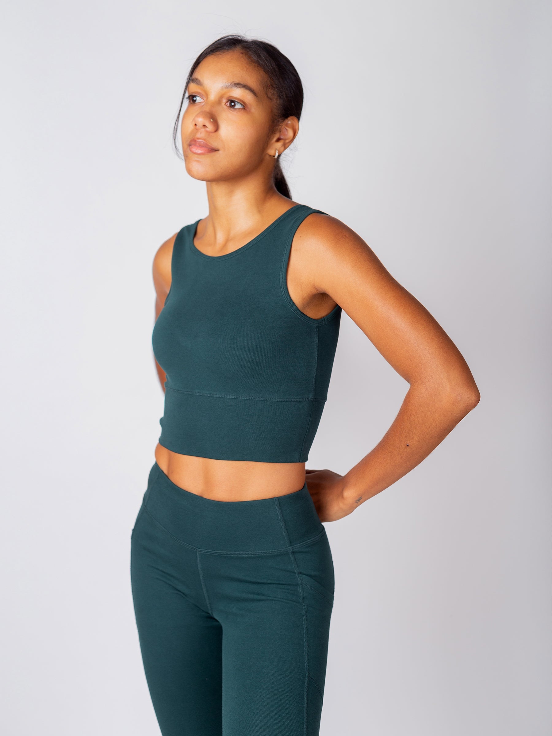 In a world of polyester and nylon, we're breaking the trend with our eco-conscious performance fabric crafted from ribbed organic cotton. In Monstera teal.