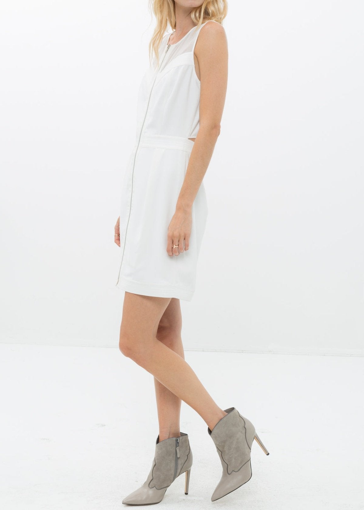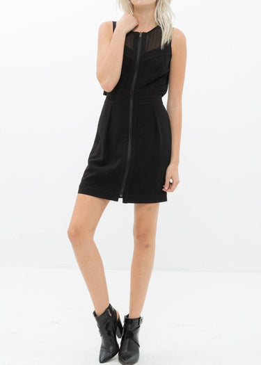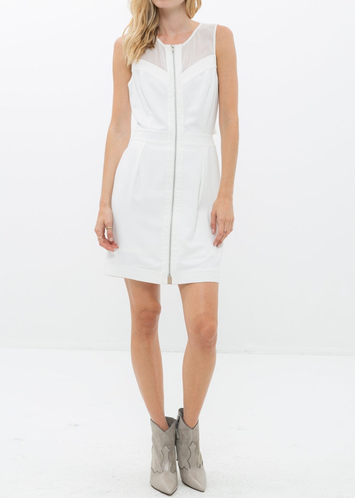 A sleeveless dress adorned with delicate sheer mesh and a front zipper closure.