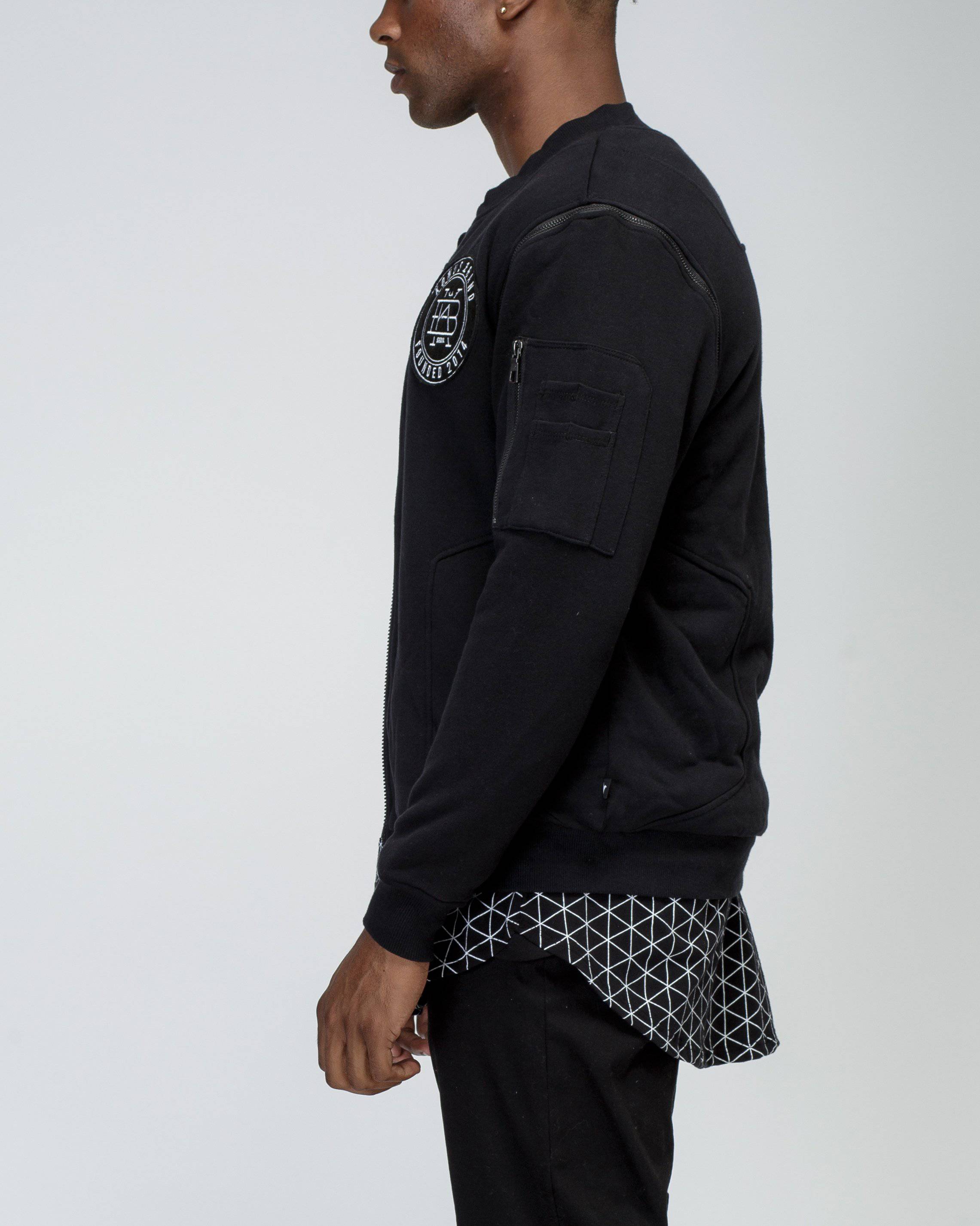 French terry bomber jacket with a zipper pocket on left sleeve, embroidery patch