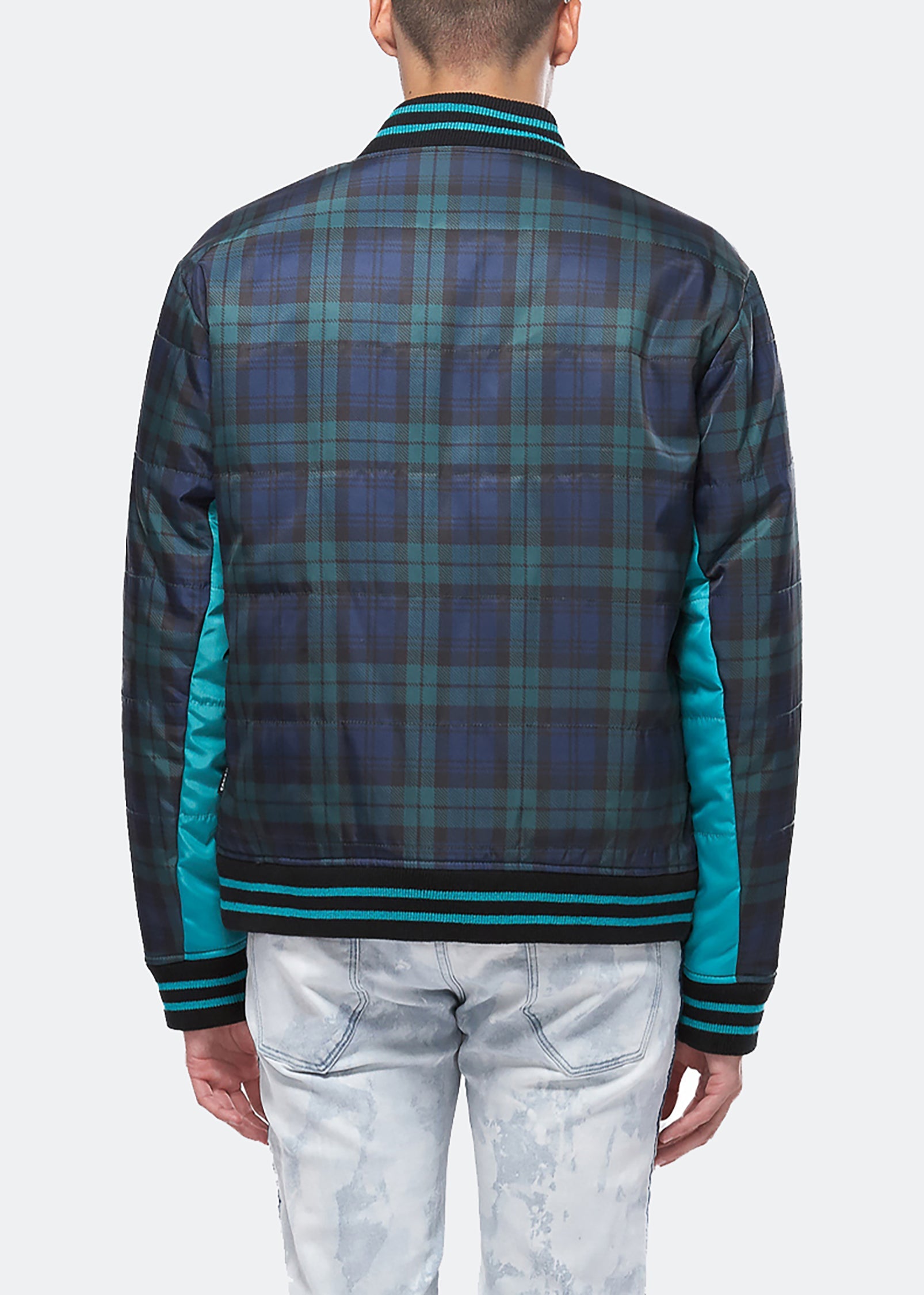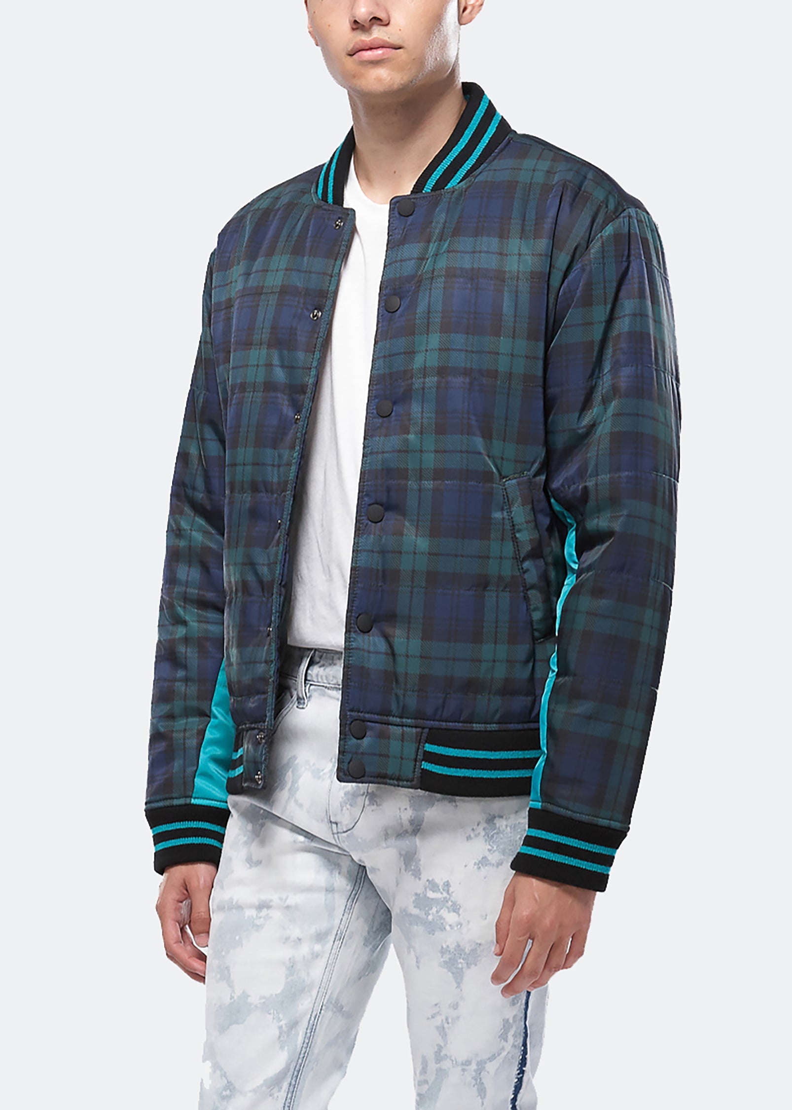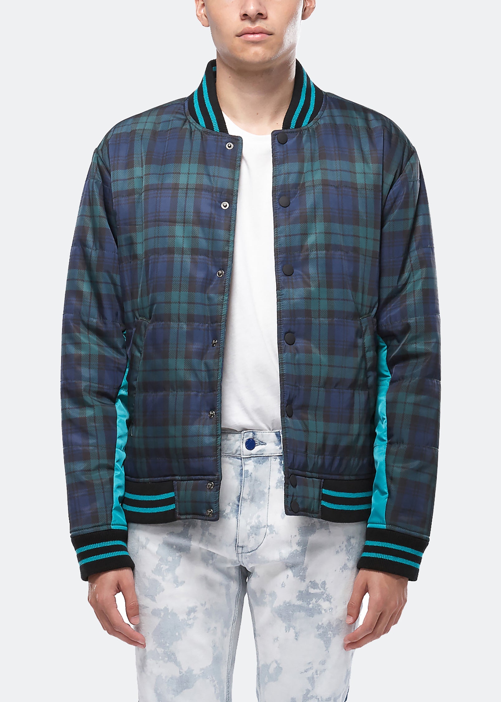 Light-filled and quilted bomber jacket with snap button closure features contrast color paneling under sleeves and custom striped ribbing at the collar, cuffs, and waist.