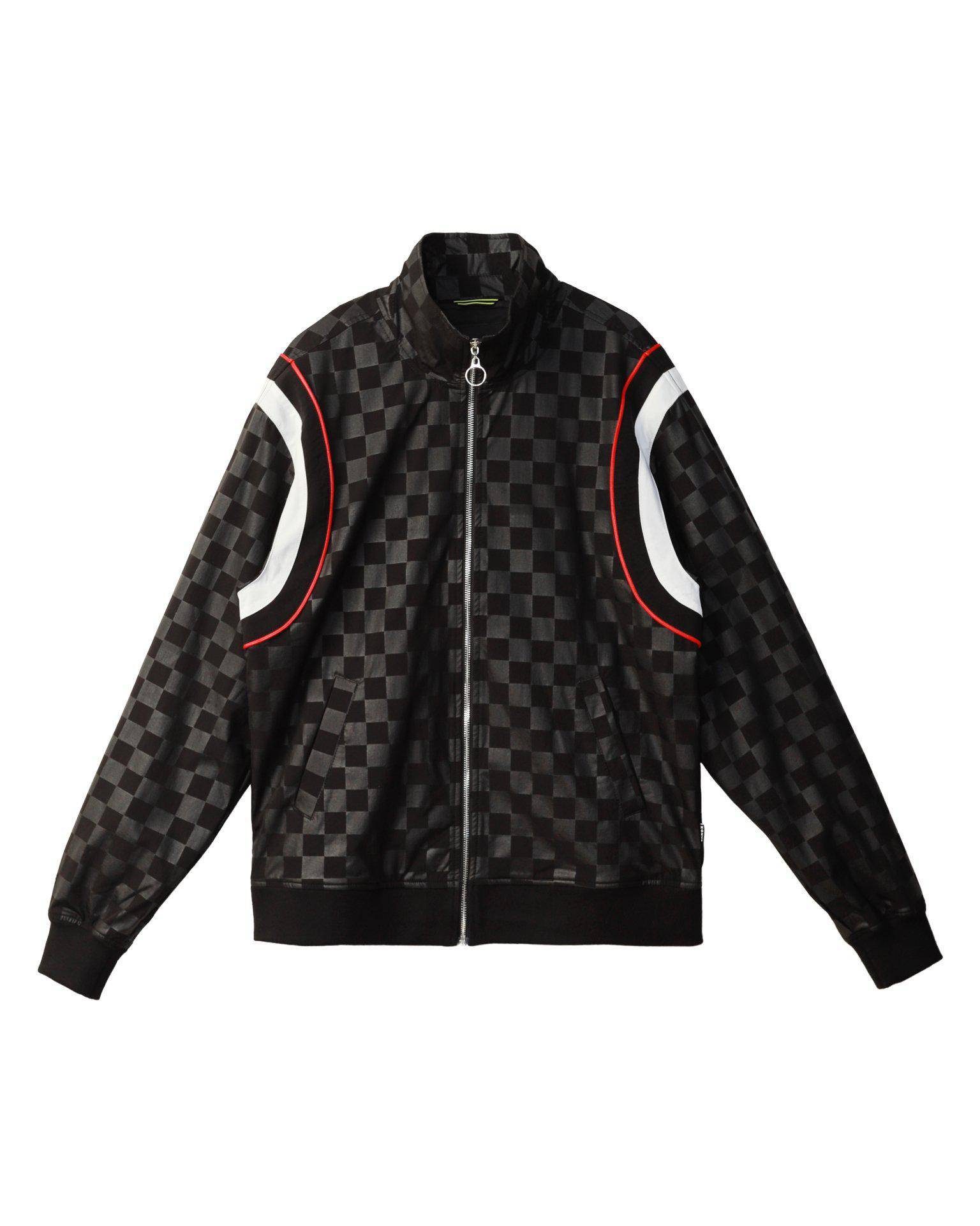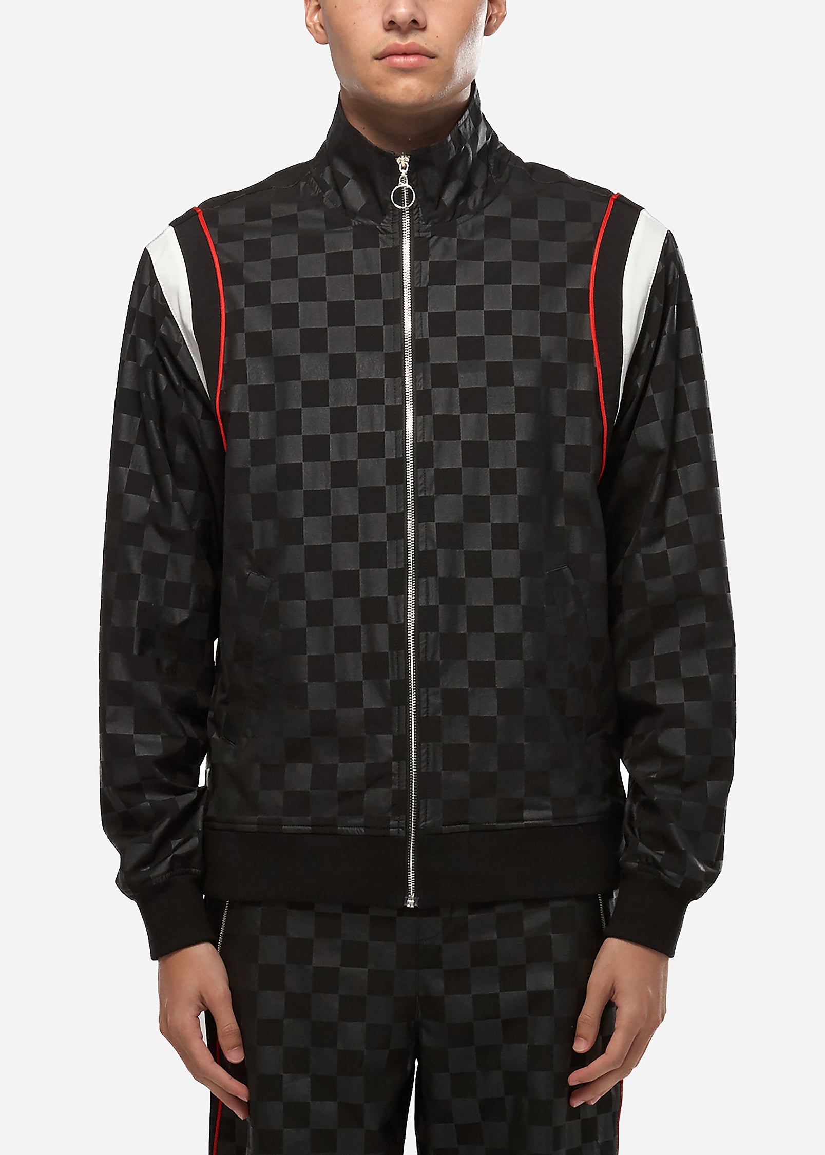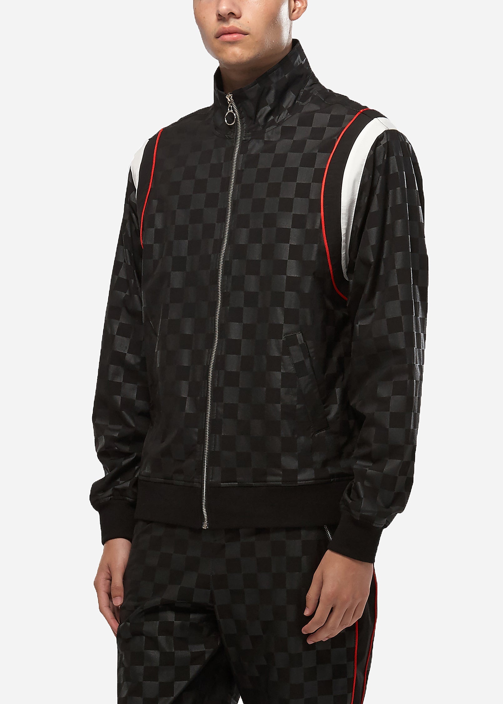 Windbreaker jacket in custom tonal checker printed fabric with contrast color fabric patch detail around armhole with red piping