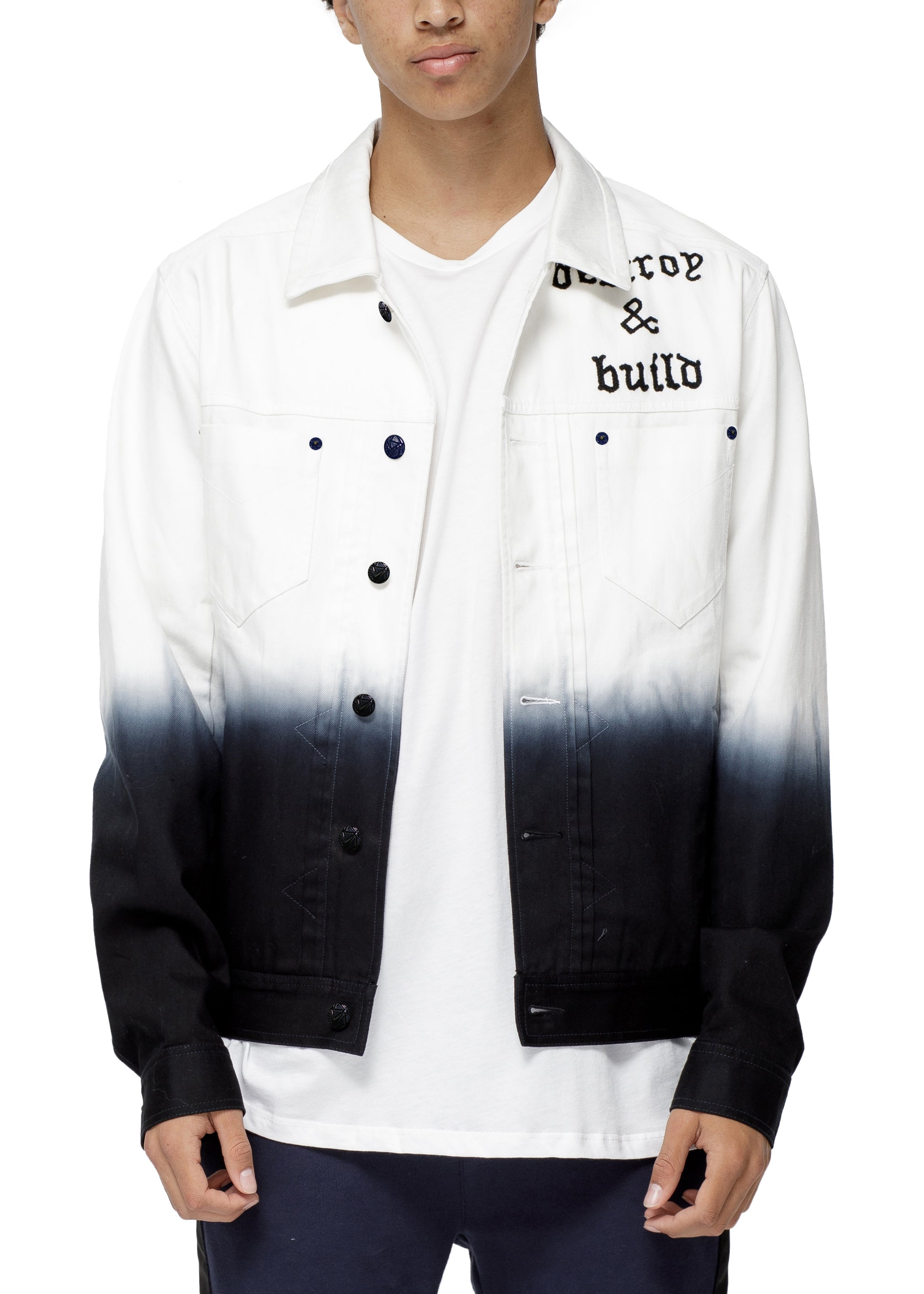 Crafted with durable bull denim, this trucker jacket has a striking dip-dye ombre effect in contrasting black. Featuring a chain stitch embroidered design, it's a versatile and stylish addition to any wardrobe.