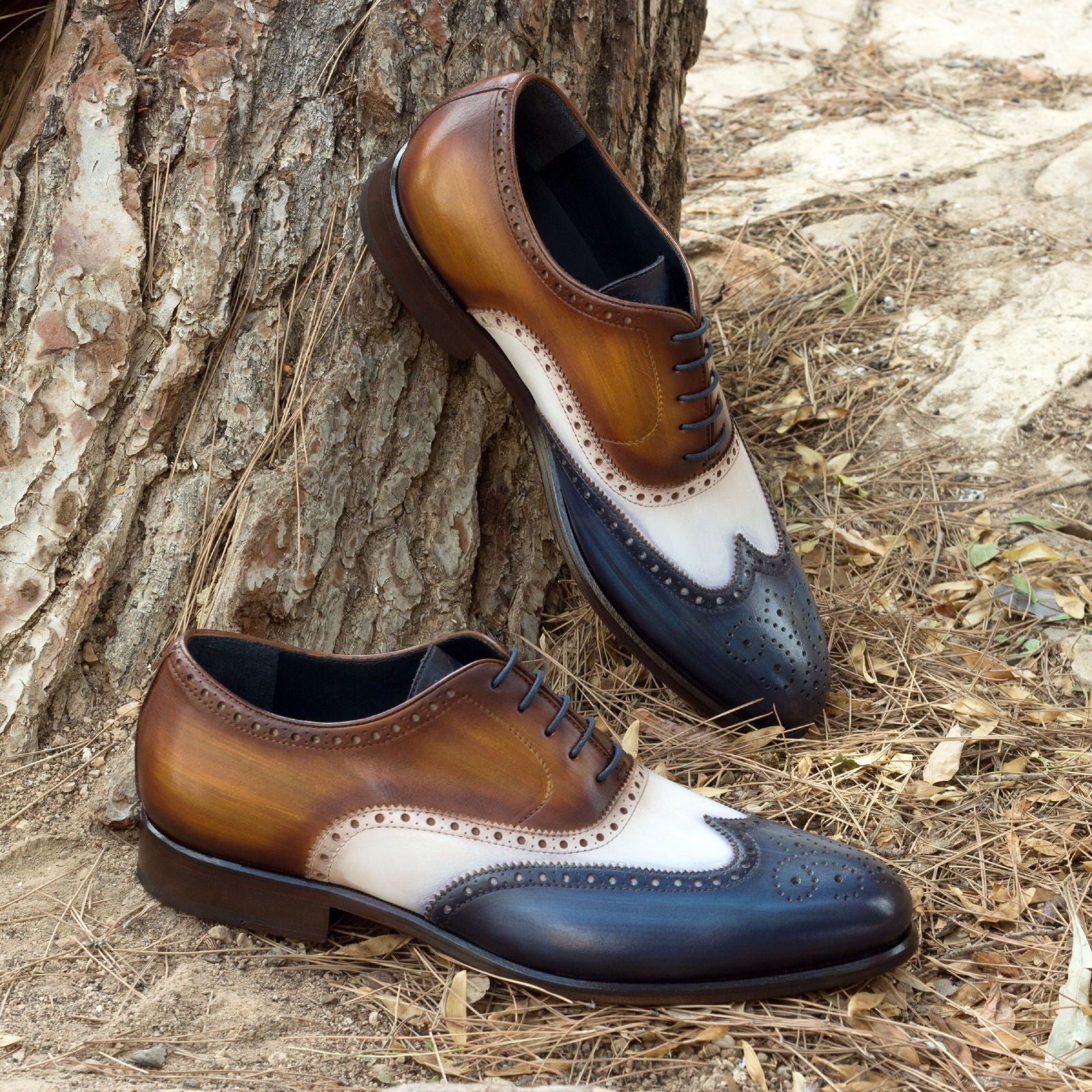 Upper Materials: white box calf + denim crust patina + cognac crust patina