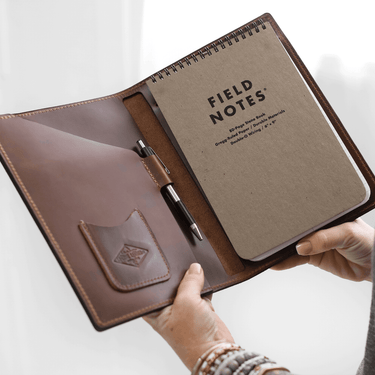 Just when you thought your regular old spiral bound notebook was enough! This Steno Pad was designed just to prove you wrong! It is perfect for our office junkies who need more than just our classic leather journal cover! This comes all included with a Field Notes Steno Pad, two hidden sleeves and one open sleeve with an attached pen loop, and a card slot! Everything you need to keep your hands free during a hectic work day! To keep it classy we also have the option to add our Lifetime Leather plaque! Who wouldn't want to flash this baby around the office!