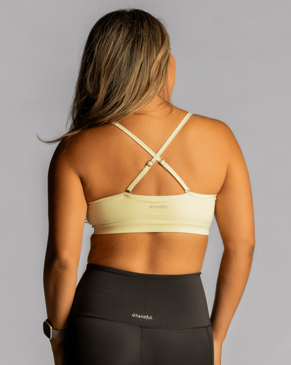 The Handful Adjustable Bra is a washable soft, versatile, wear-everywhere chafe-free moisture-wicking bra featuring pockets, removable pads, and straps that can be worn in three ways. It is the original do-it-all, all-day-long adjustable bra!