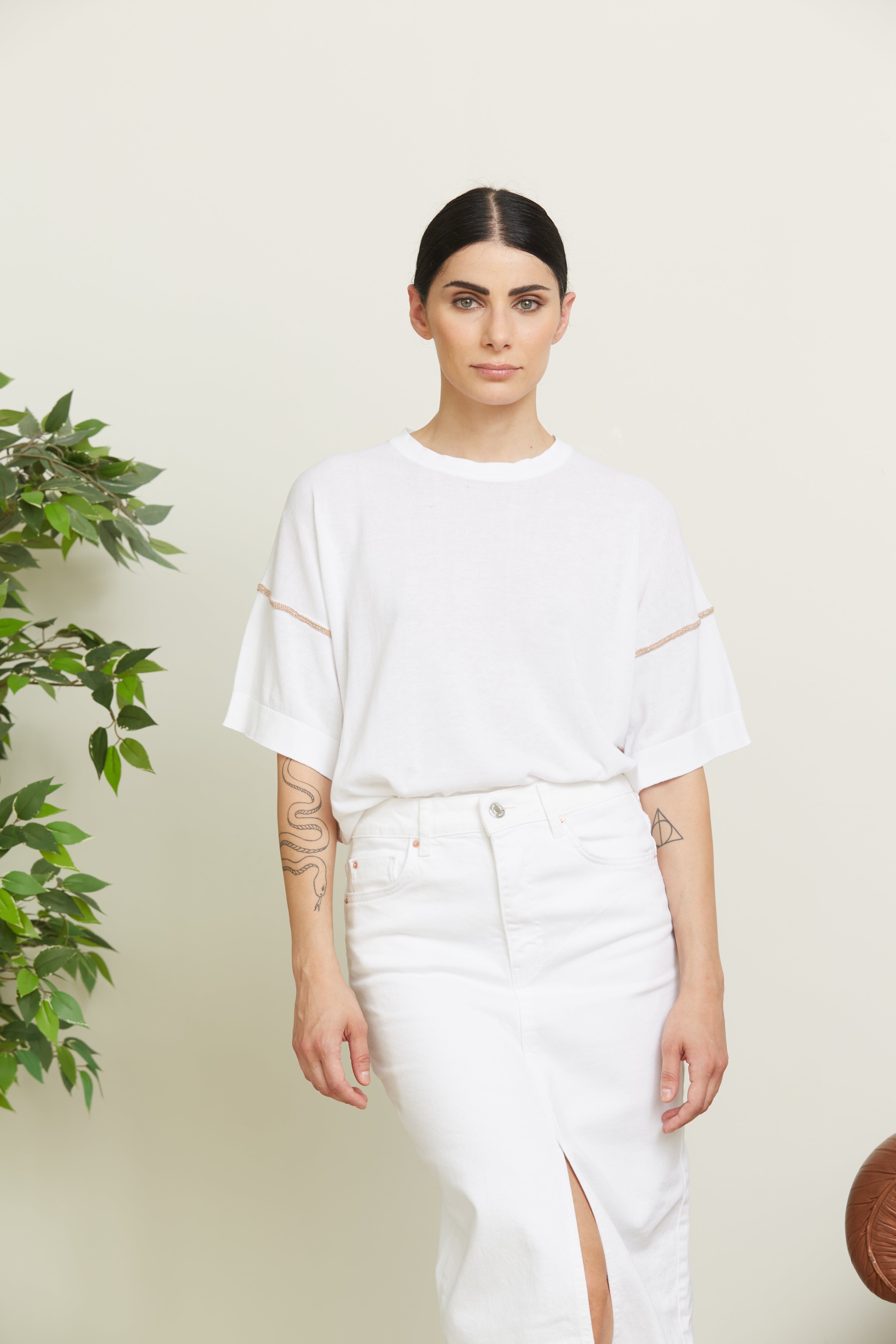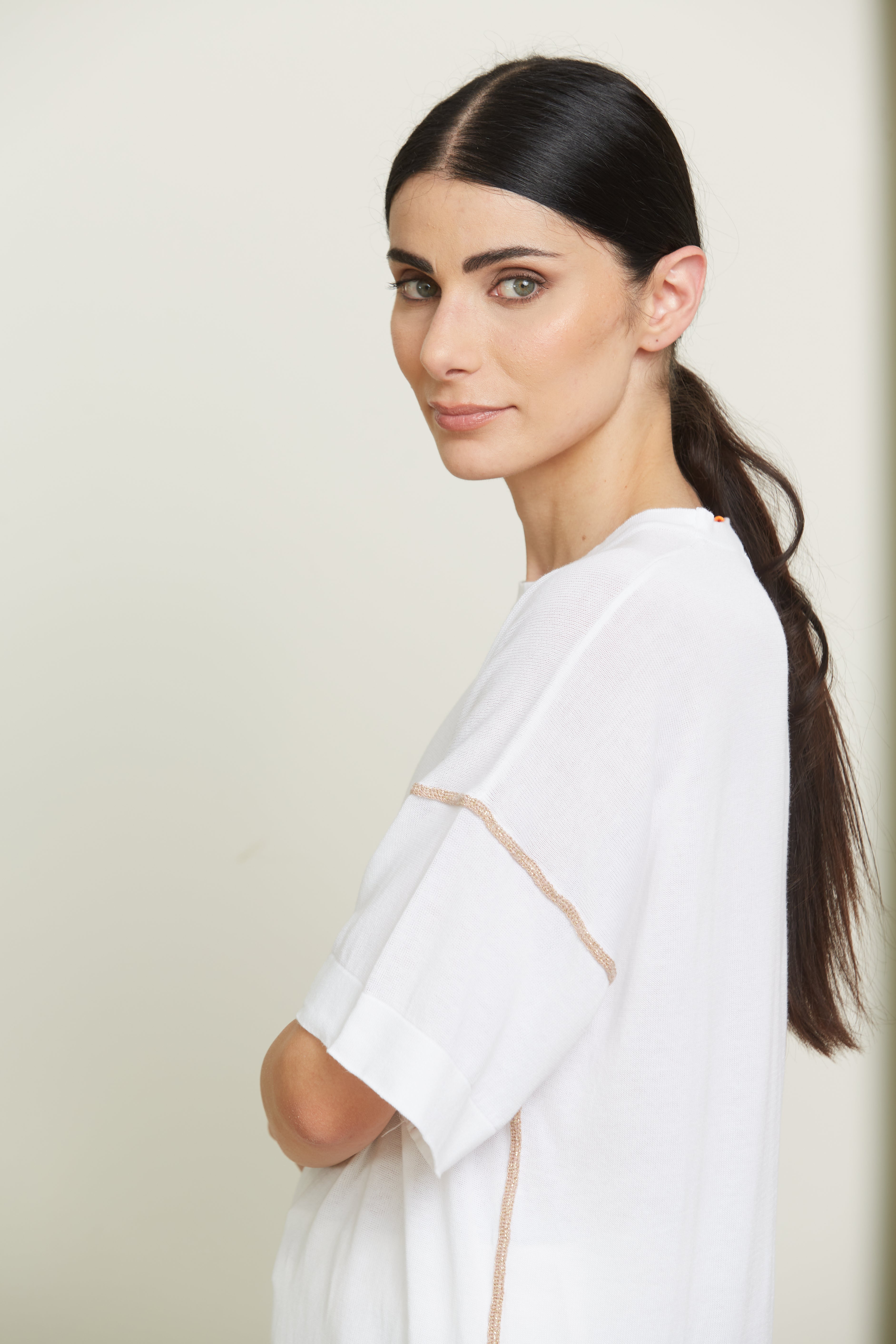 Half sleeve crew neck, comfort fit with visible lurex stitching.