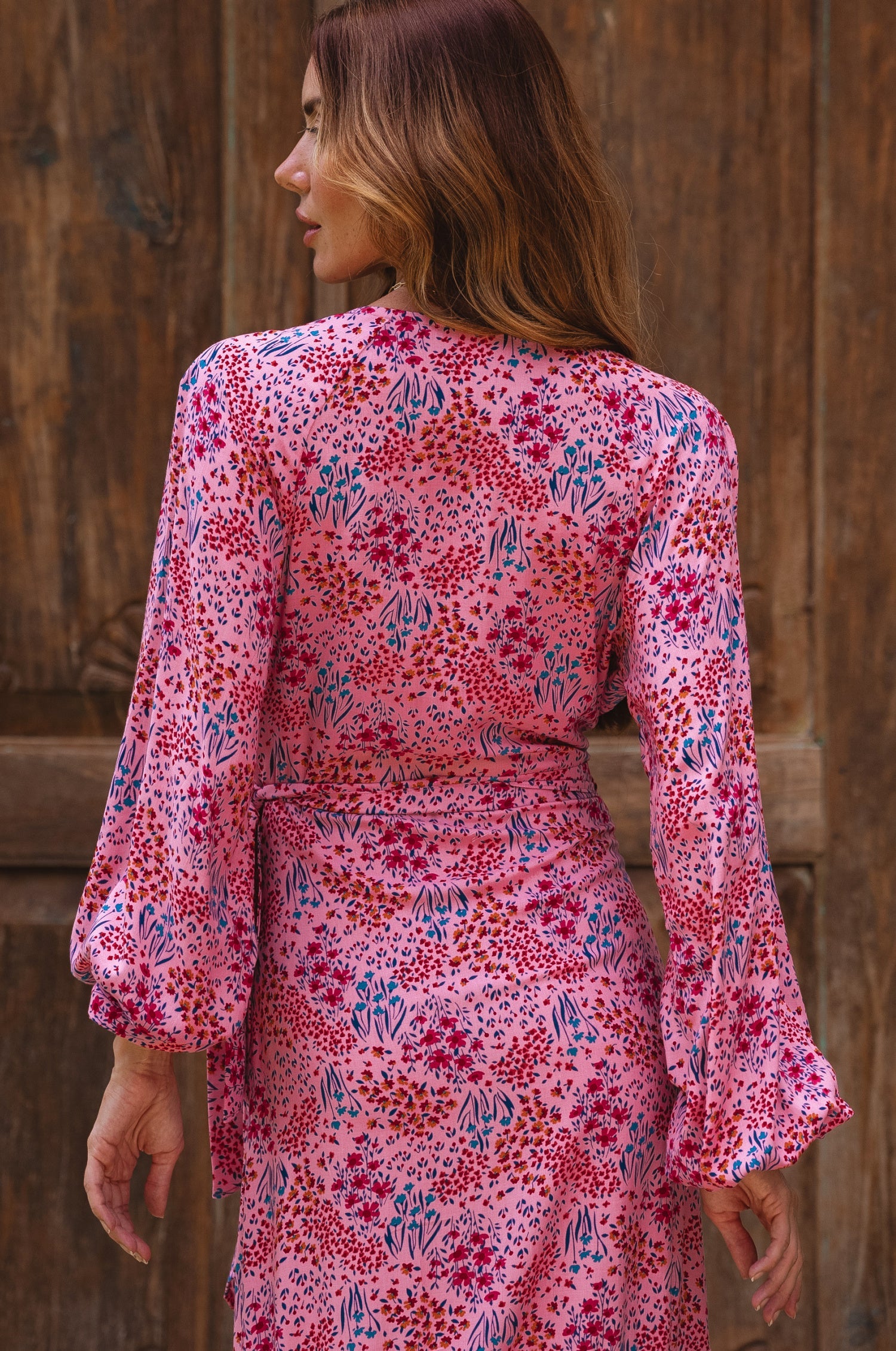 Our versatile Golden Hour midi dress is handcrafted from high quality rayon into a wrap silhouette. Detailed with pretty folds along the neckline and ruffles on the hemline it is destined to become your new favorite every-day piece.