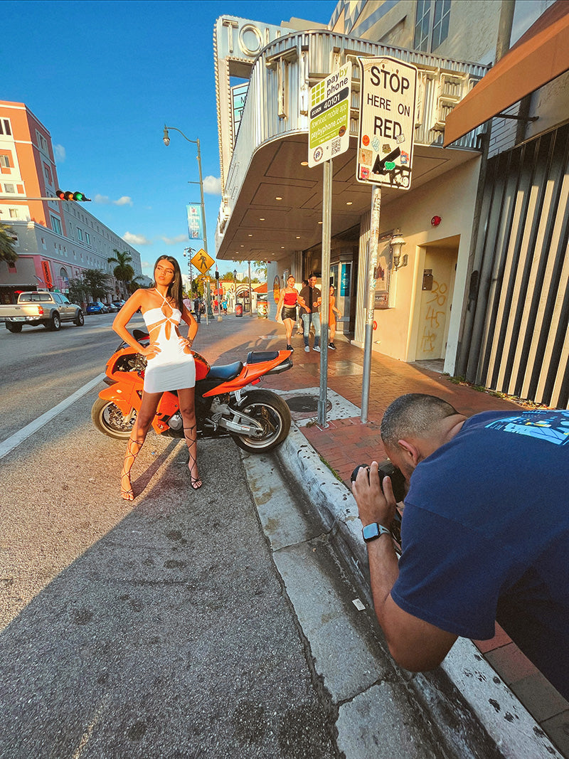 Strappless type dress with thin strips to collect top, crossed waist, round cut and pantie high shot pantie