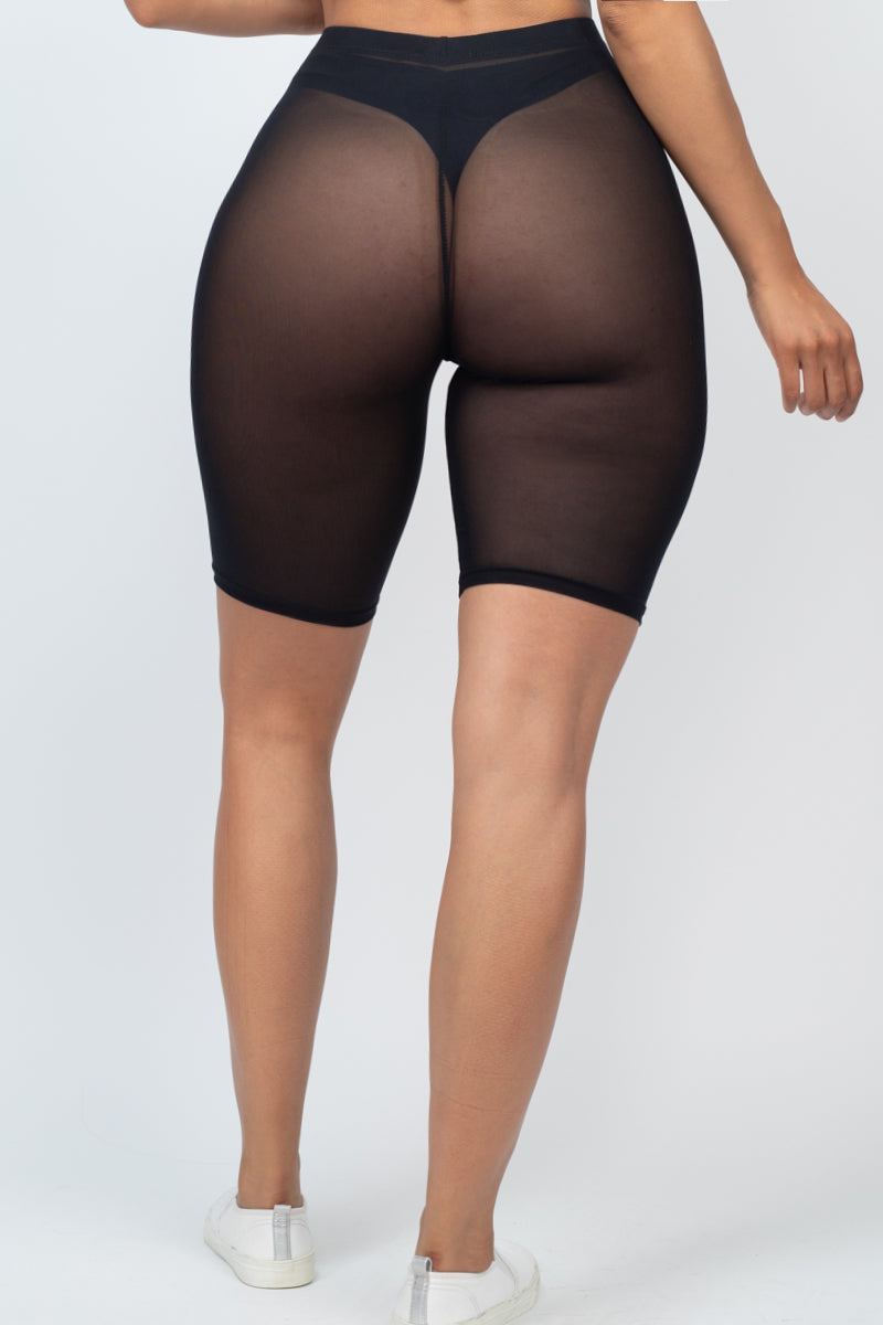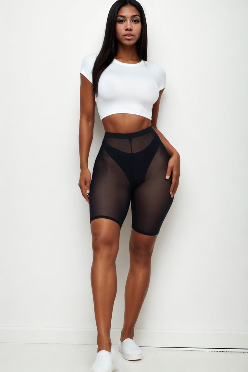 mesh biker shorts, high-waisted shorts, sheer shorts, breathable fabric, fashion-forward, lightweight, street style, layering shorts, trendy wear