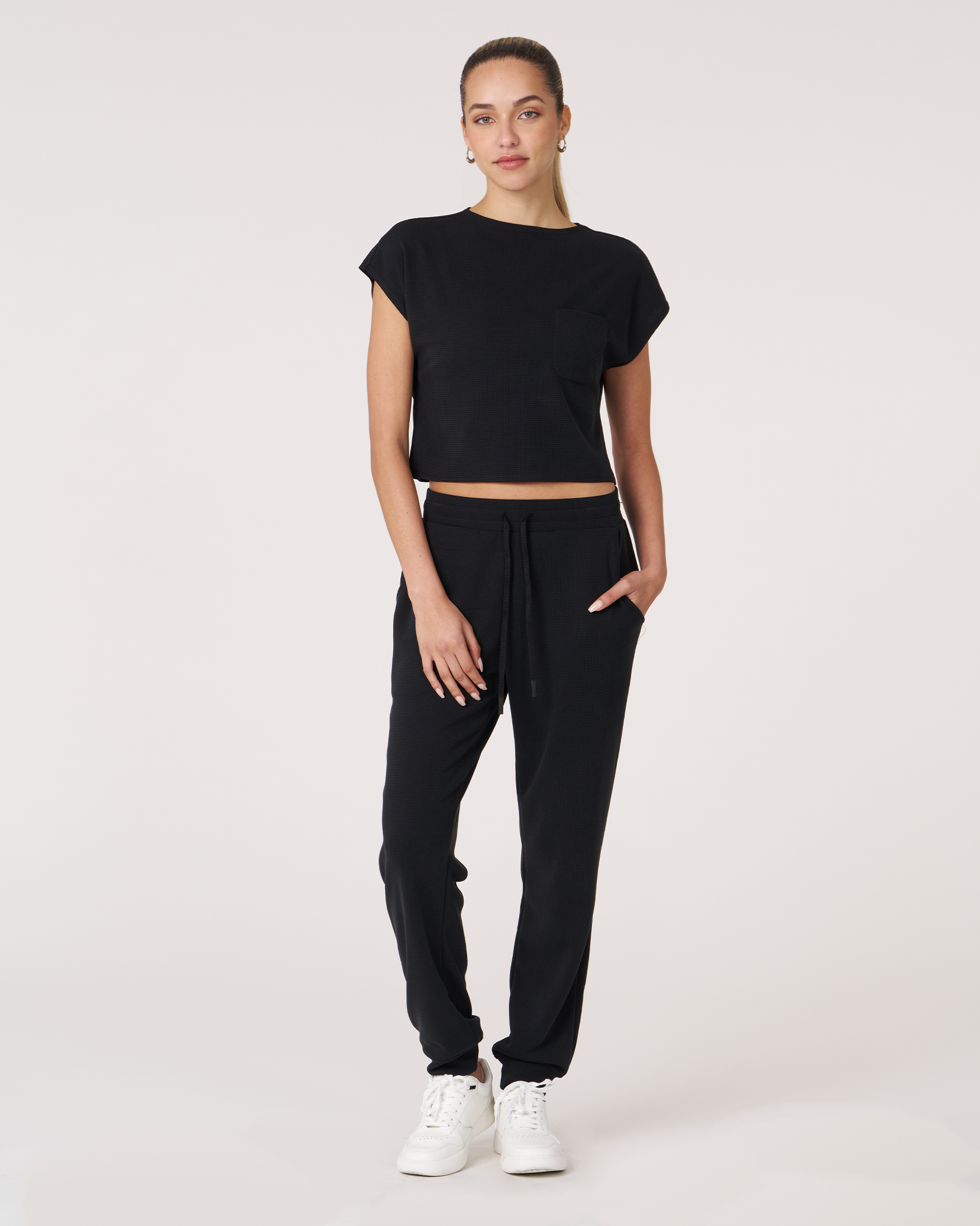 Unwind in style in our Retreat Pocket Waffle Tee. This perfect crop length tee features a pocket and super short sleeves - ideal for travel, errands, or weekend lounging. The waffle-knit exterior has a cotton-like feel for comfort and sweat-wicking interior to keep you cool and dry. Lightweight and drapey, it's made from a luxurious blend of 49% Modal, 45% polyester, 6% Spandex.