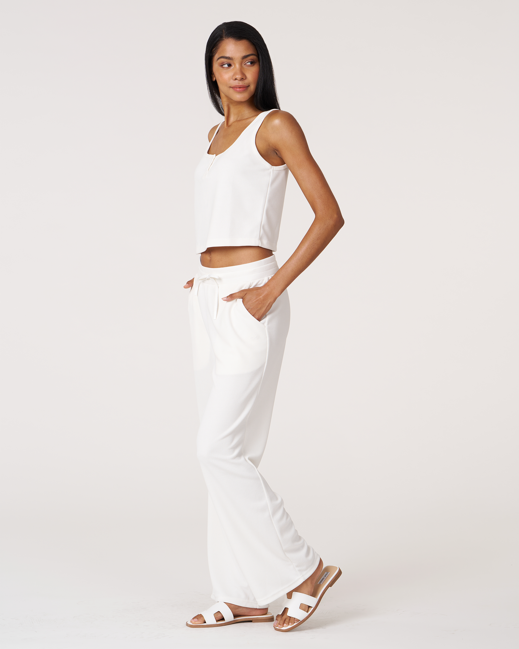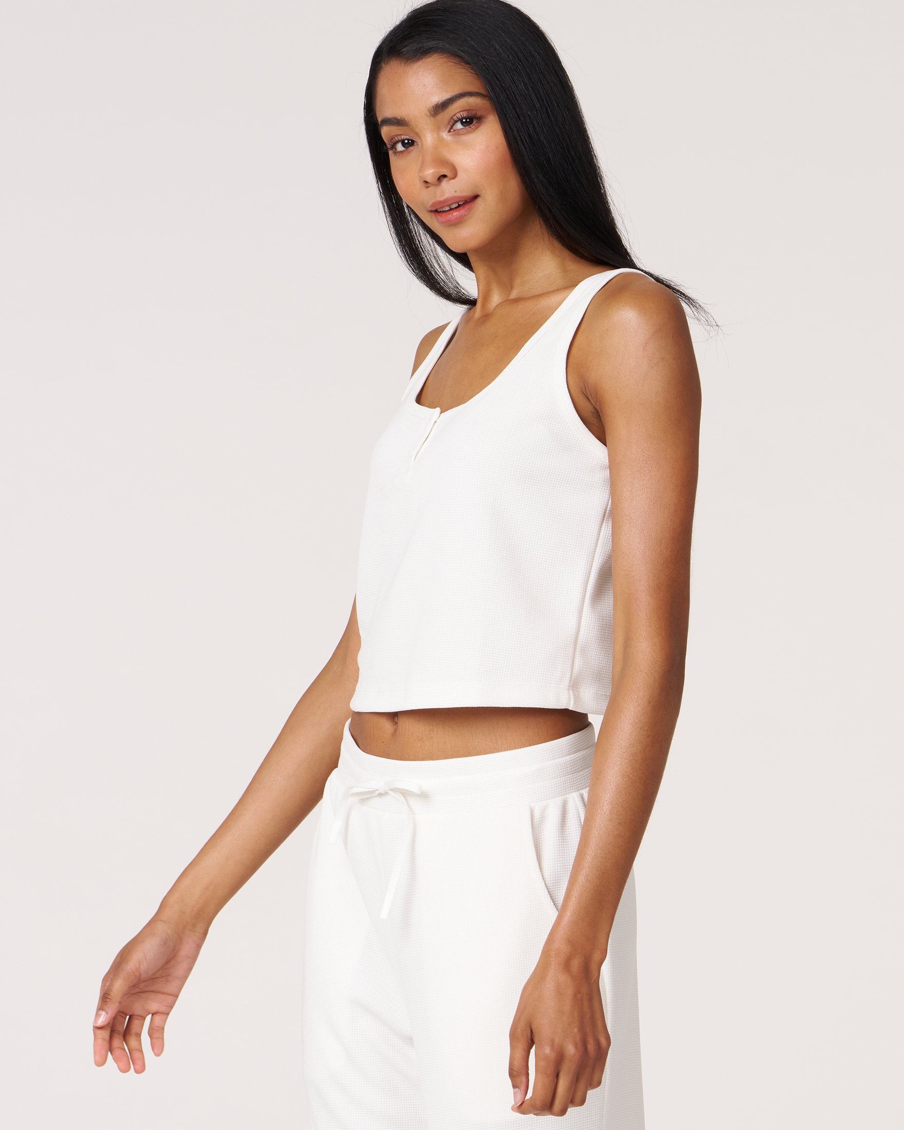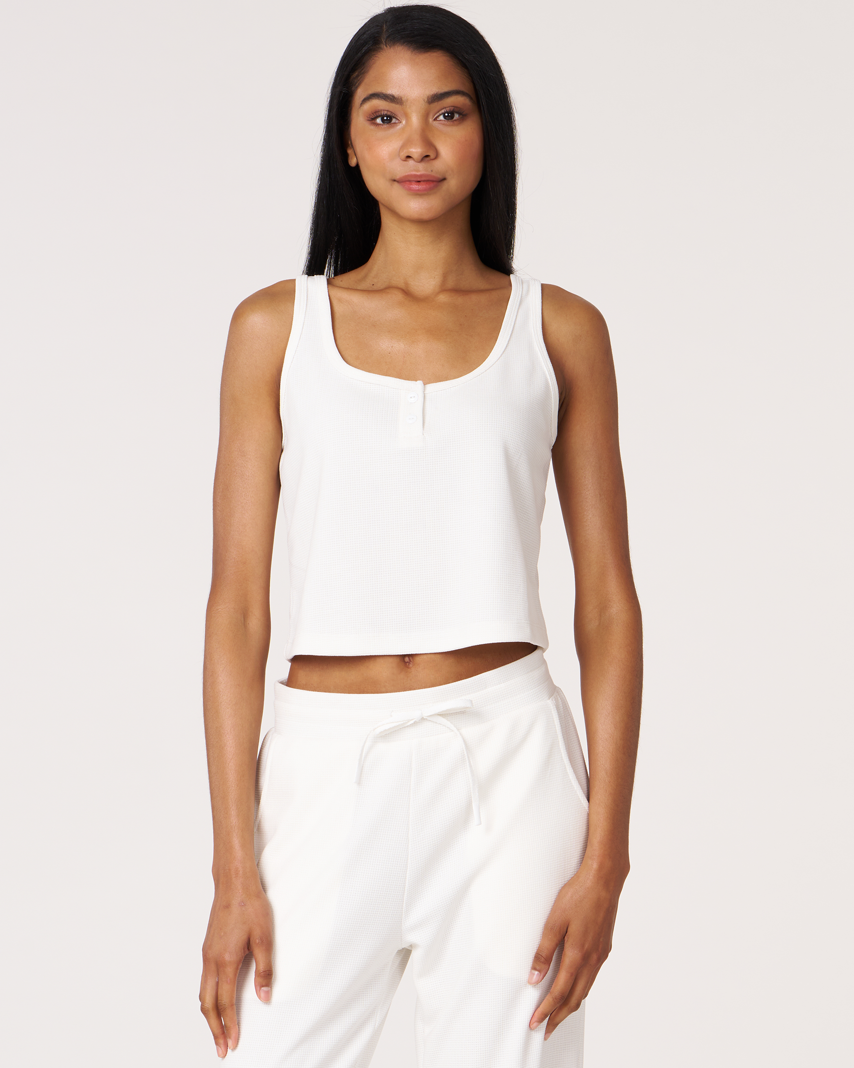 Unwind in style in our Retreat Pocket Waffle Tank. This perfect crop length tank features a button down and a flattering square neck - ideal for travel, errands, or weekend lounging. The waffle-knit exterior has a cotton-like feel for comfort and sweat-wicking interior to keep you cool and dry. Lightweight and drapey, it's made from a luxurious blend of 49% Modal, 45% polyester, 6% Spandex.