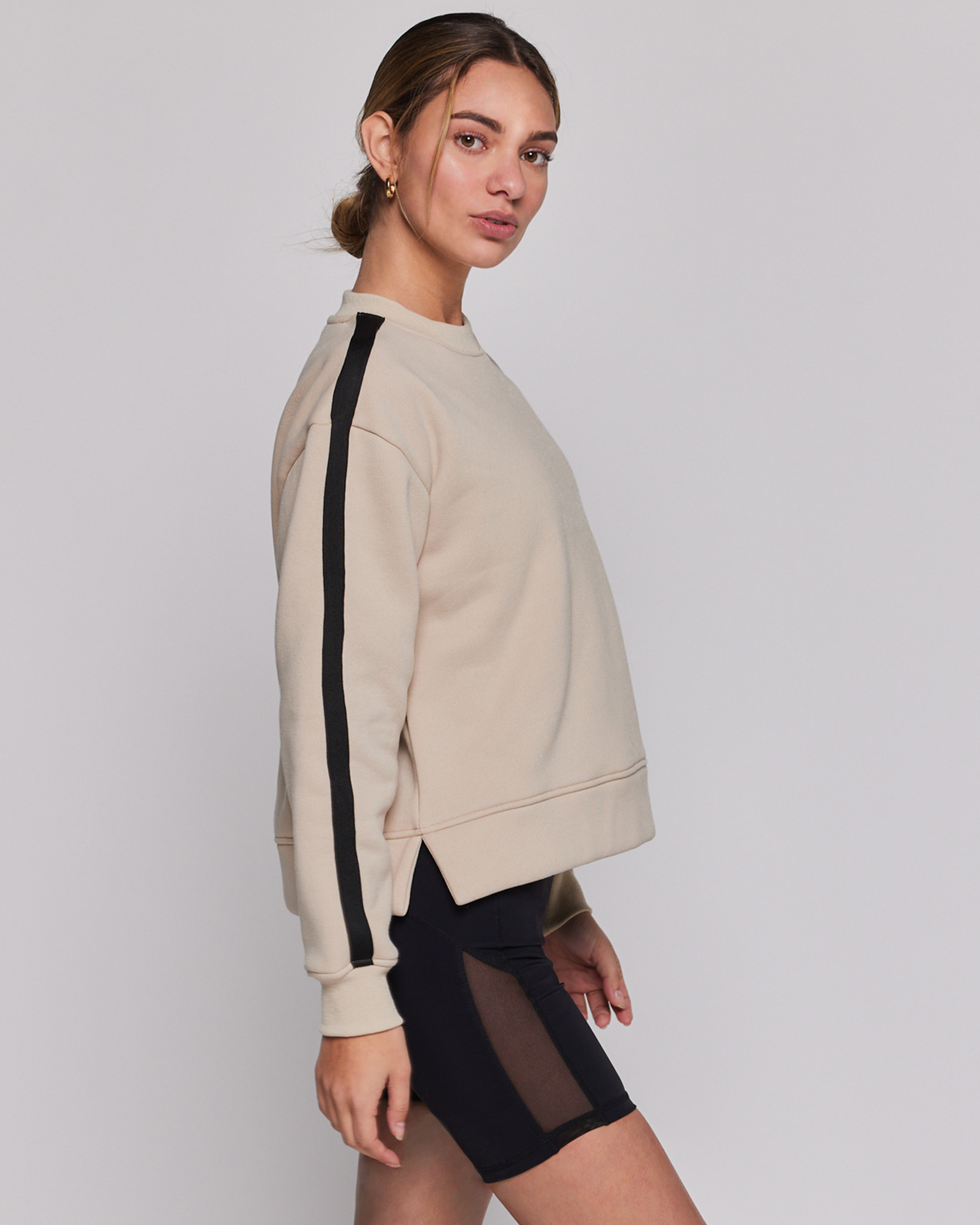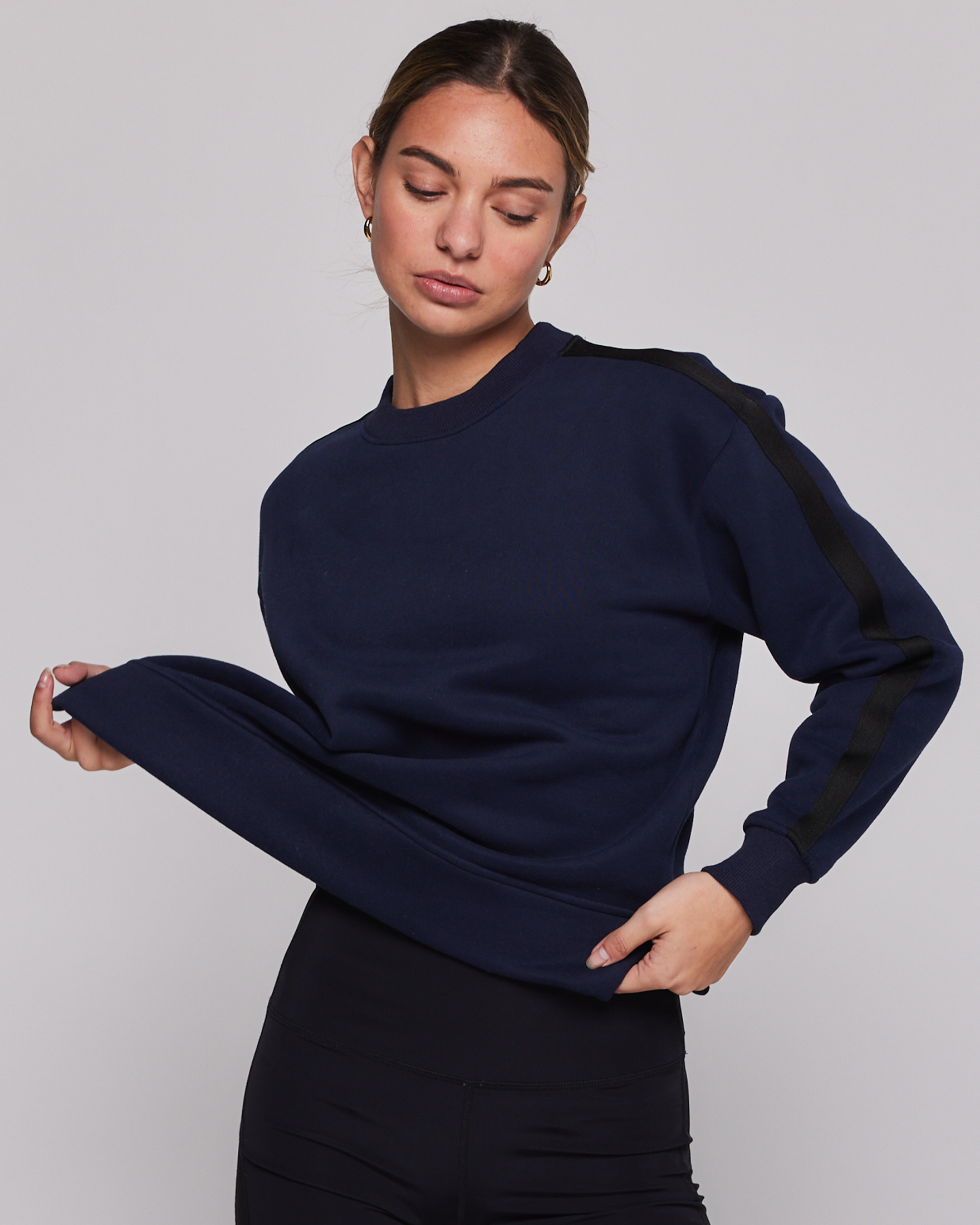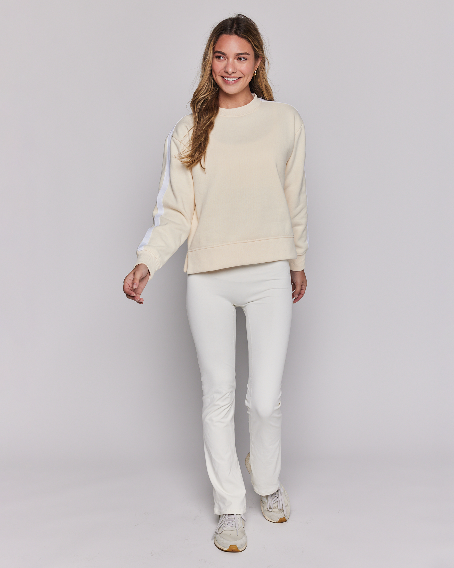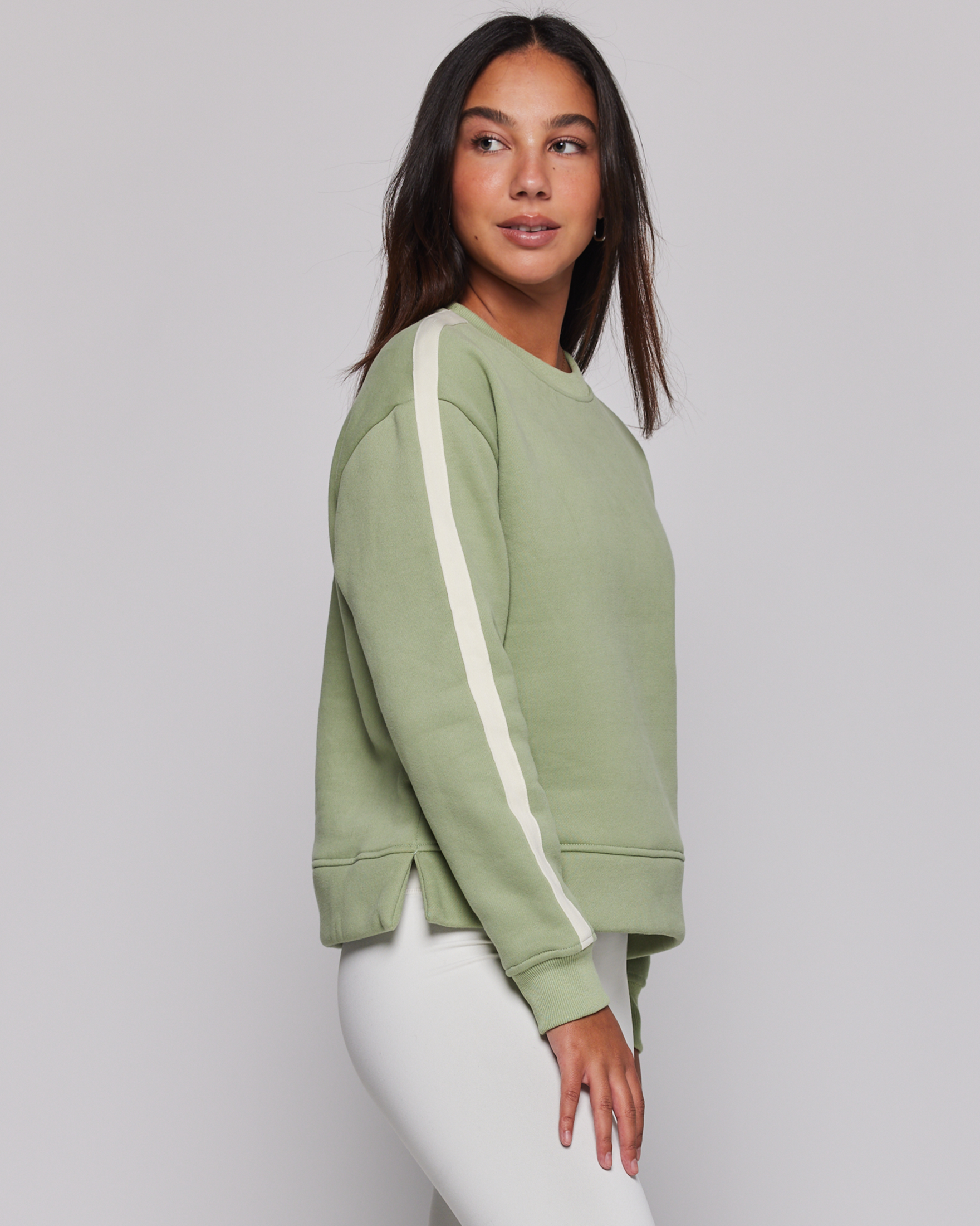 Plush fleeced crewneck sweater featuring stripes for a sporty and everyday look. Wear as an outer layer to and from practice, pair with your favorite leggings or jeans, and wear with sweats for comfy lounging.