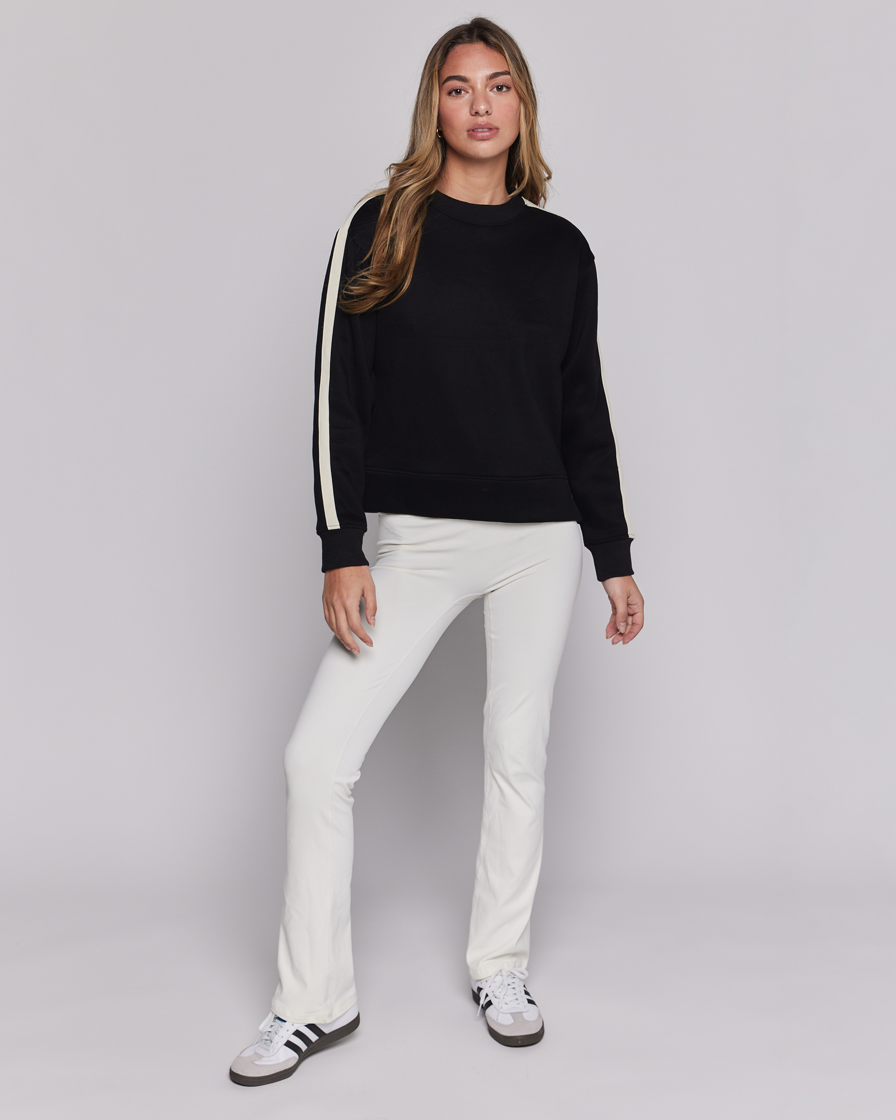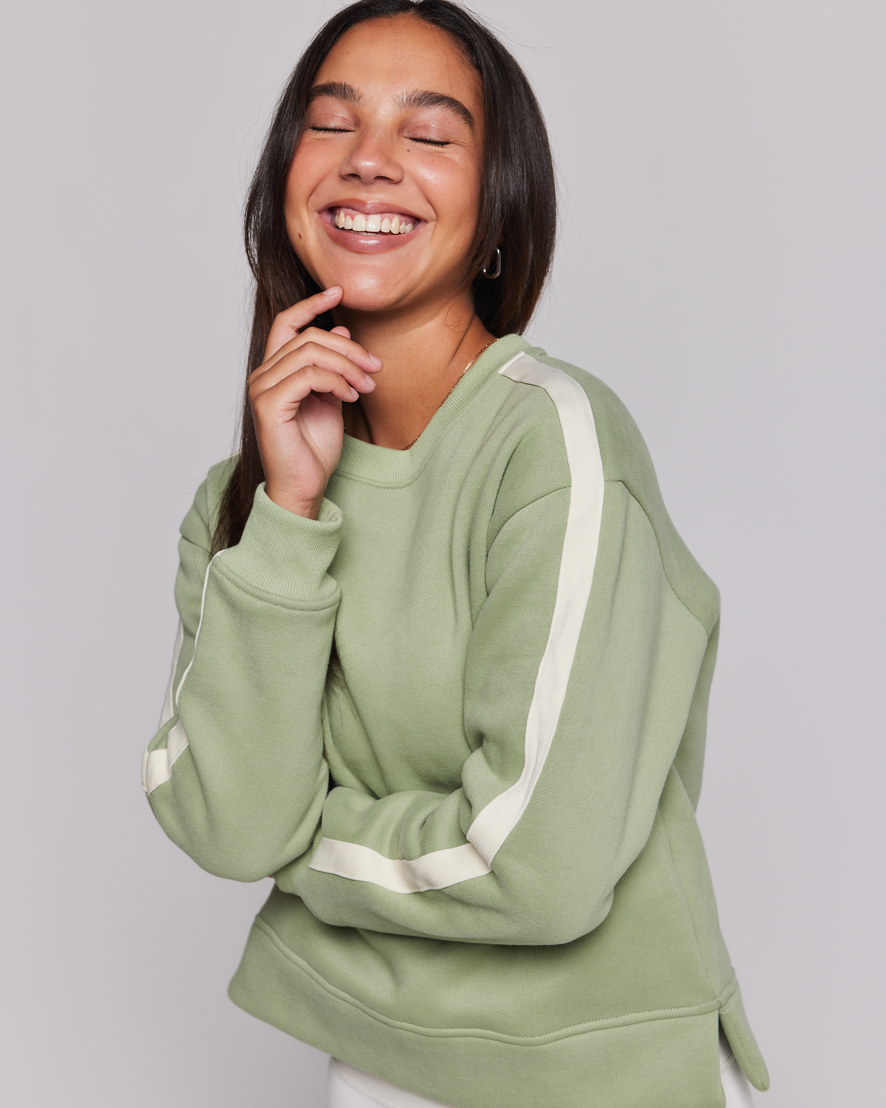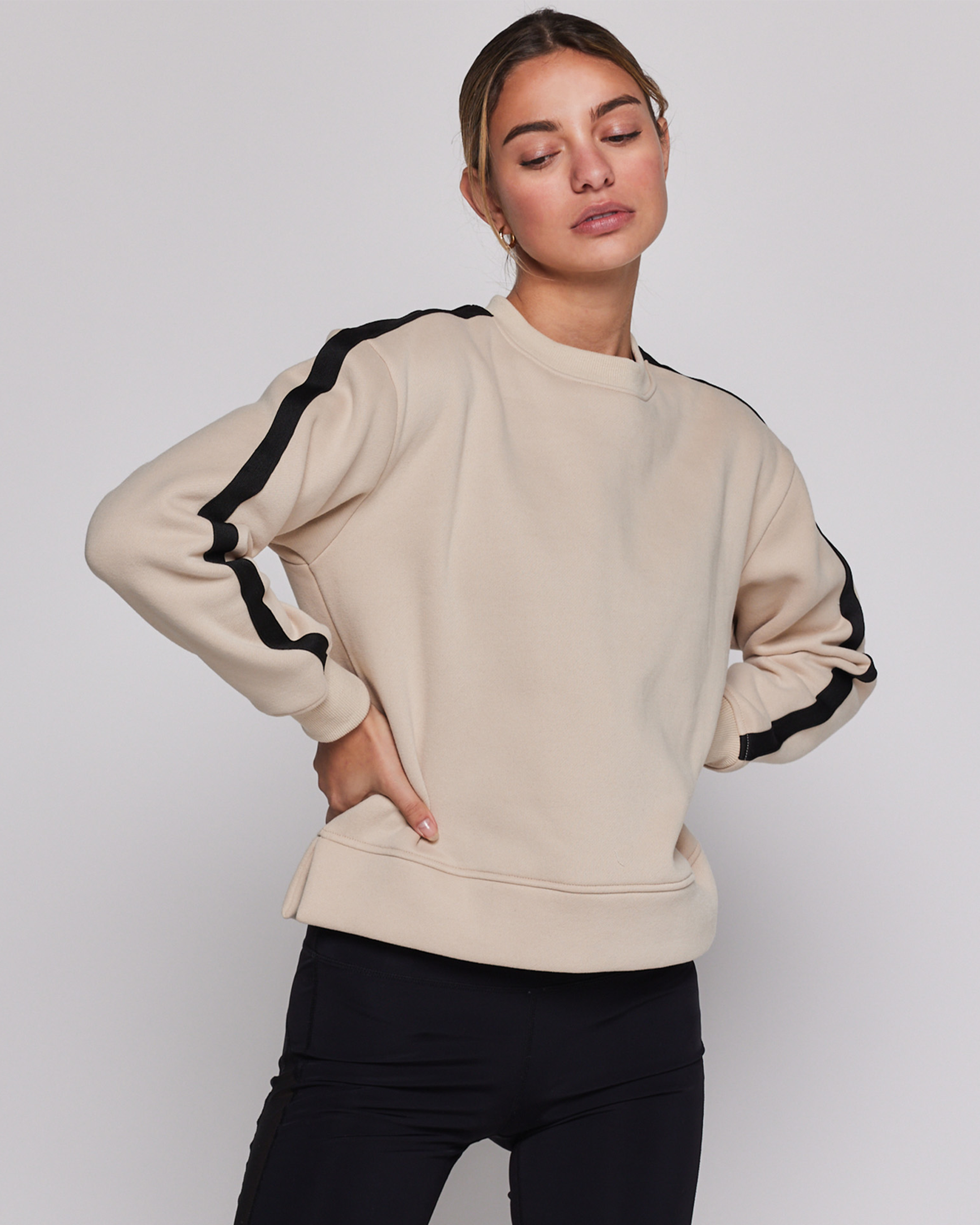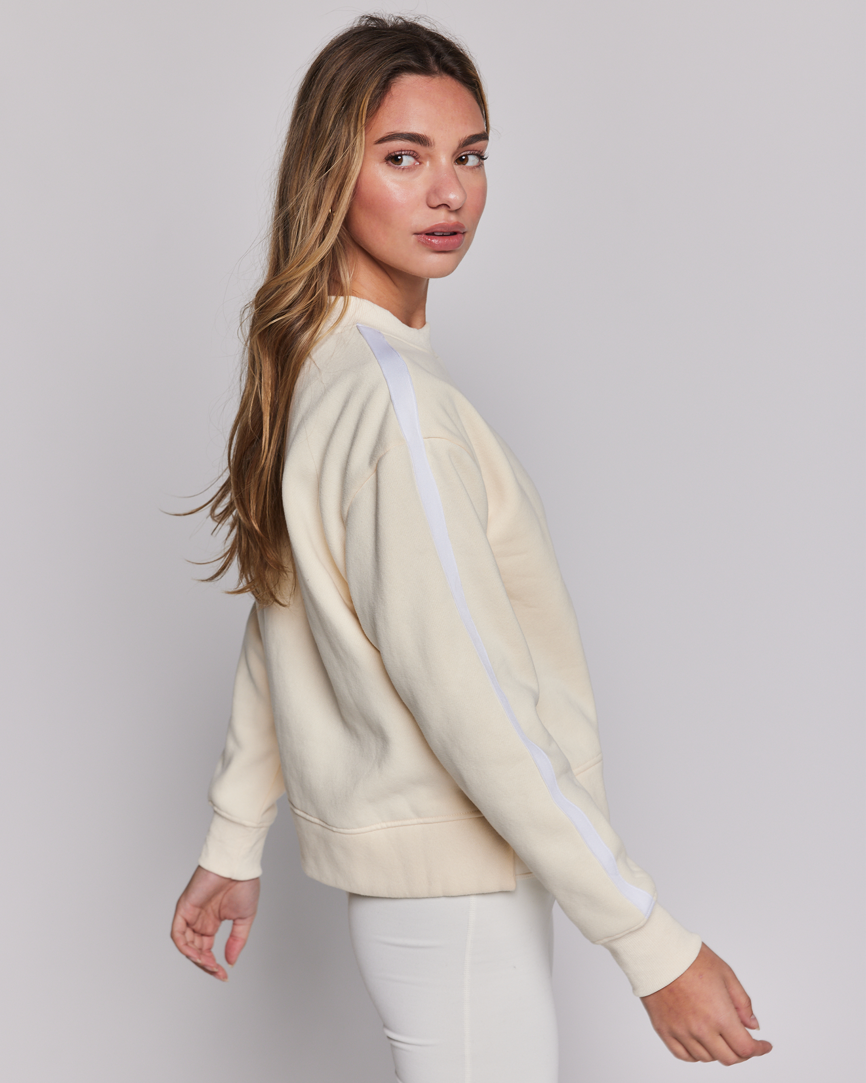 Plush fleeced crewneck sweater featuring stripes for a sporty and everyday look. Wear as an outer layer to and from practice, pair with your favorite leggings or jeans, and wear with sweats for comfy lounging.