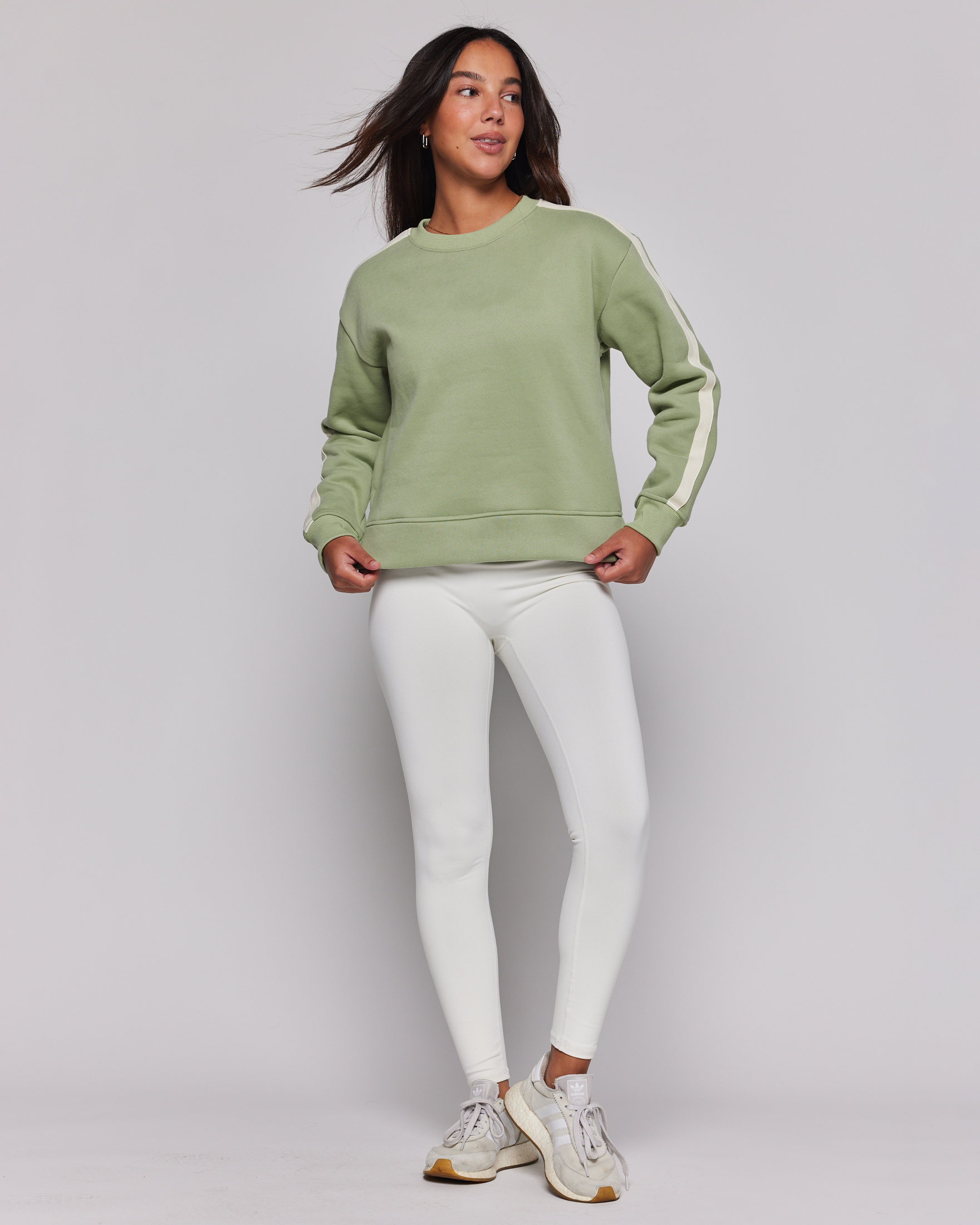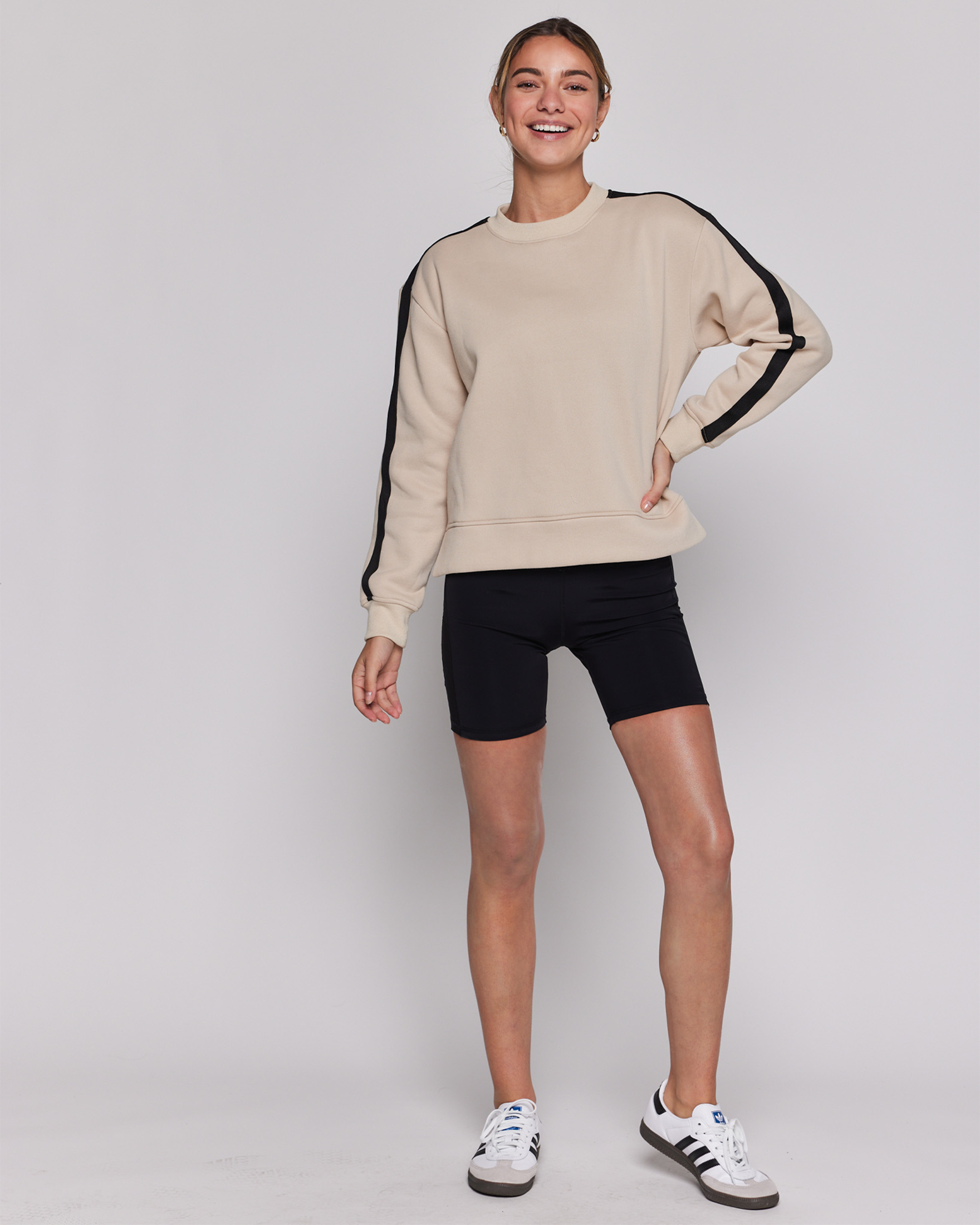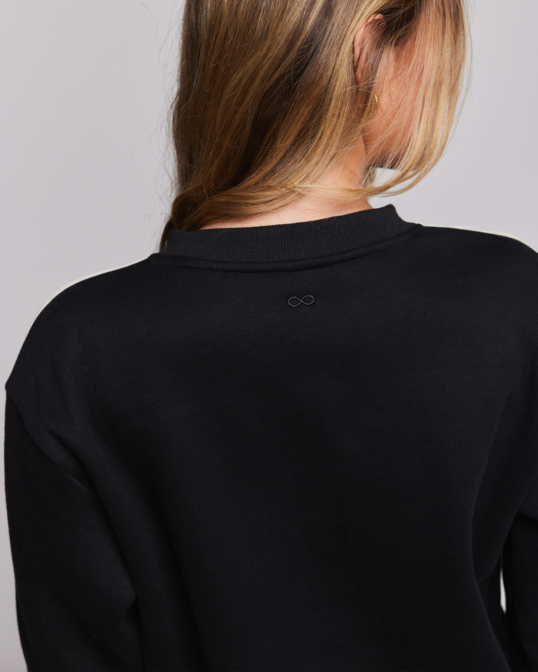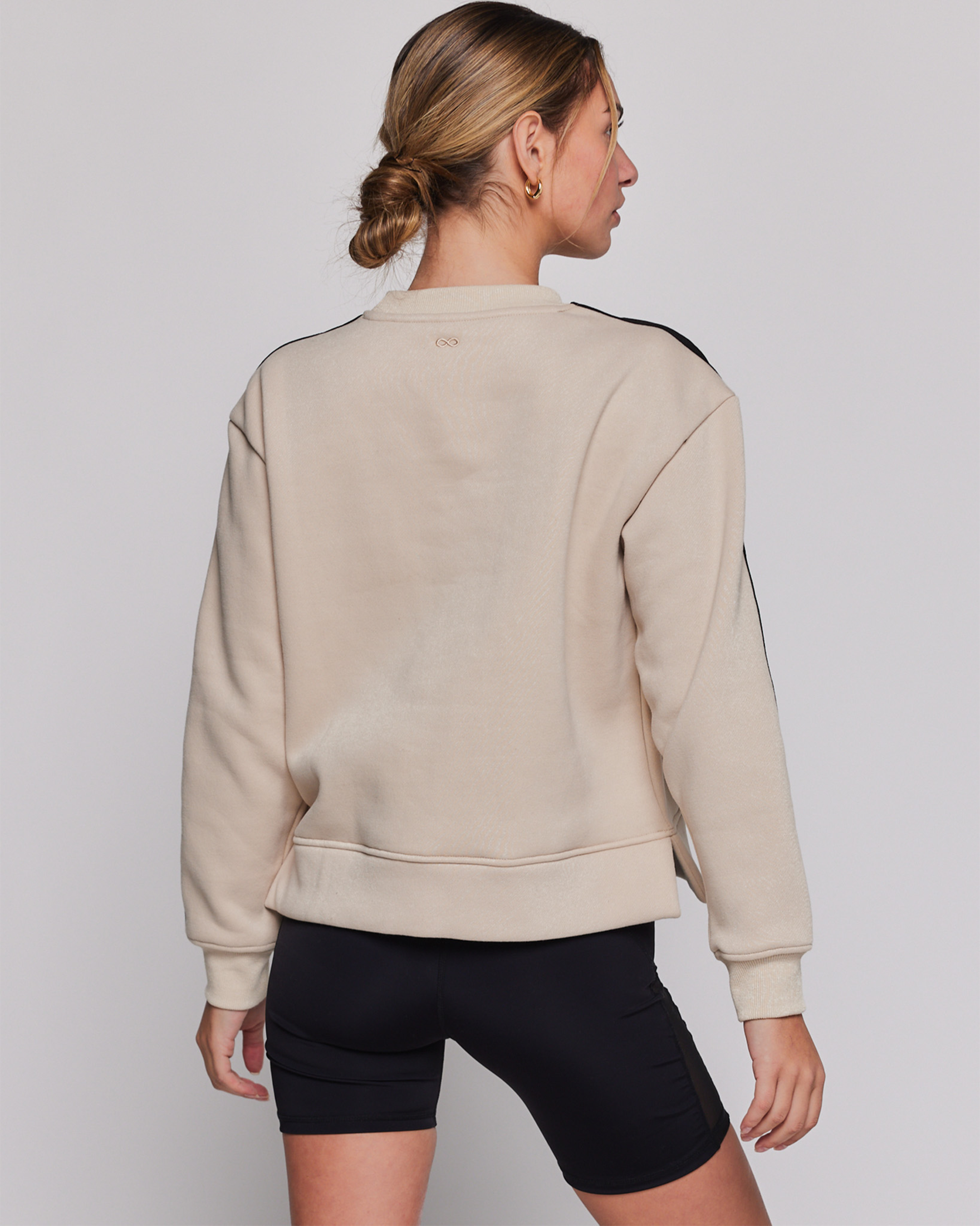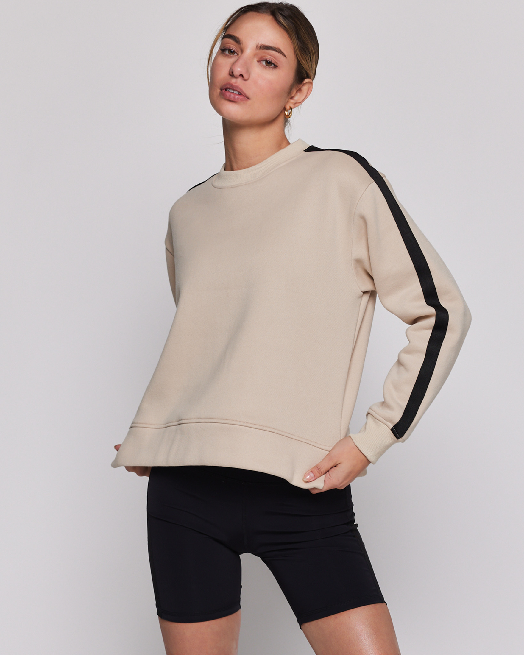 Plush fleeced crewneck sweater featuring stripes for a sporty and everyday look. Wear as an outer layer to and from practice, pair with your favorite leggings or jeans, and wear with sweats for comfy lounging.
