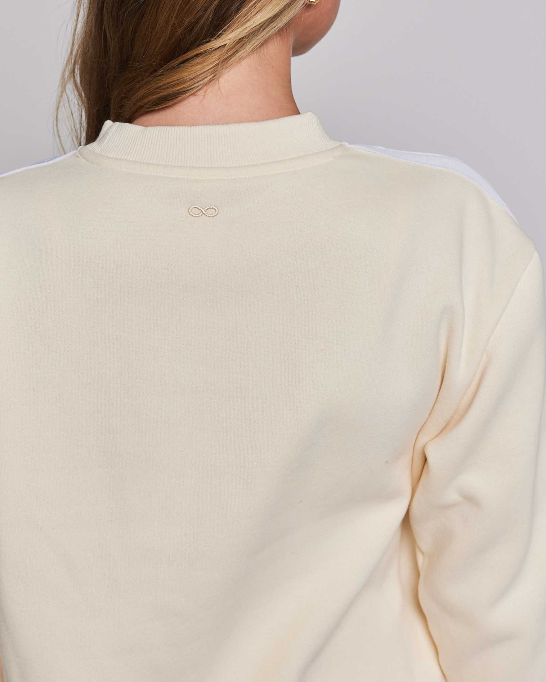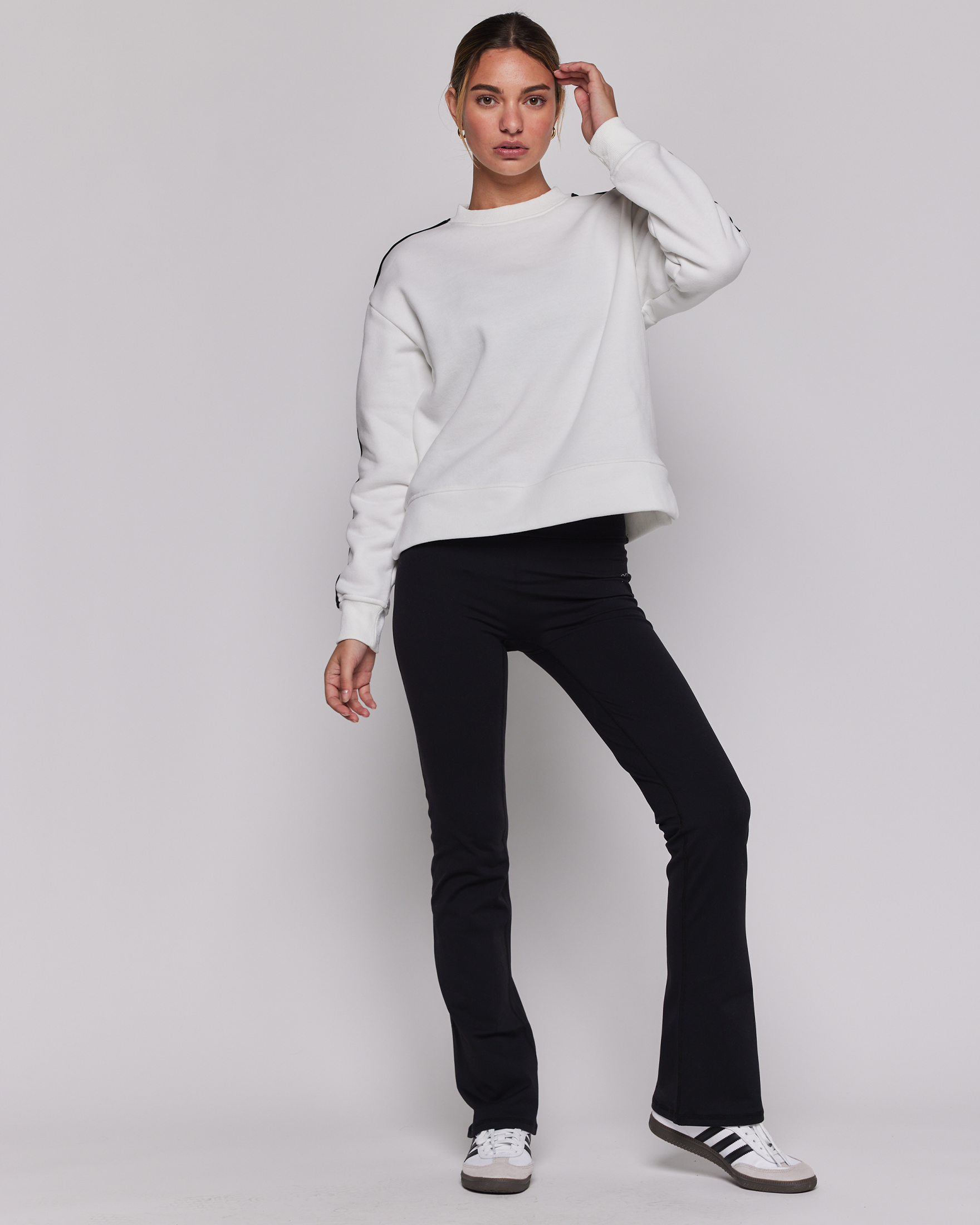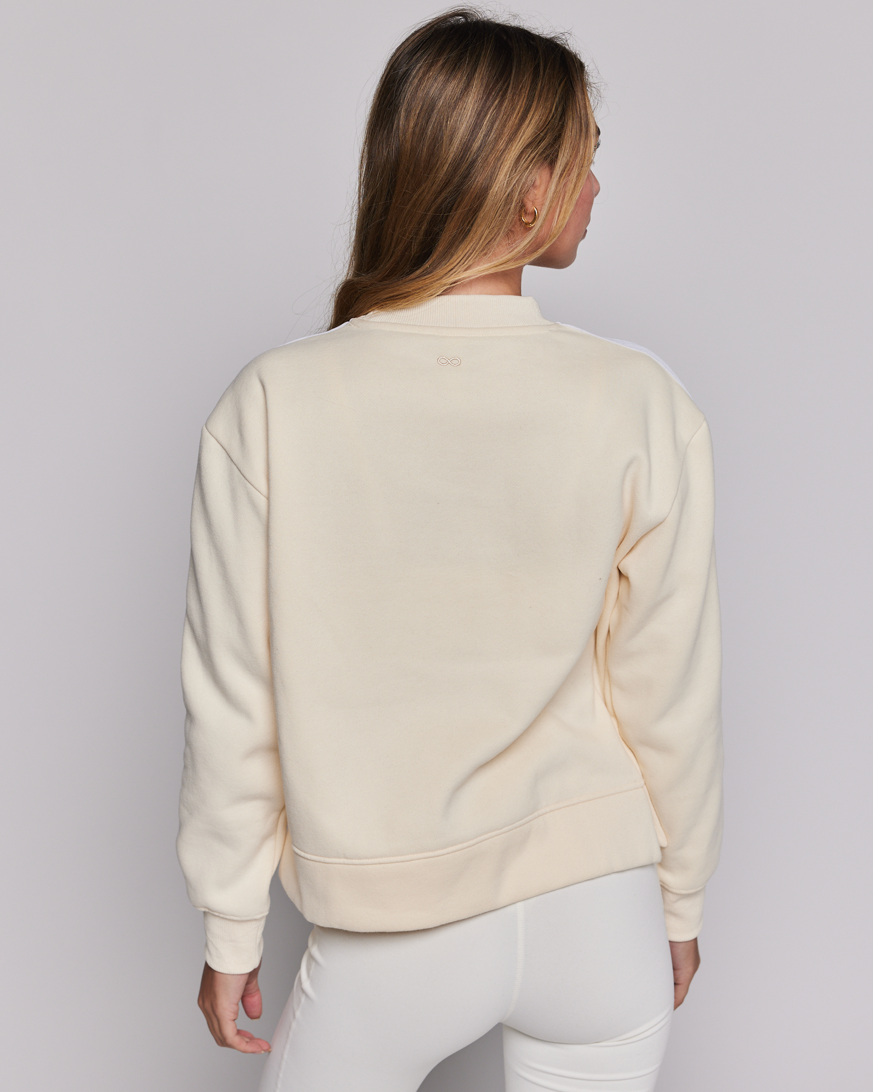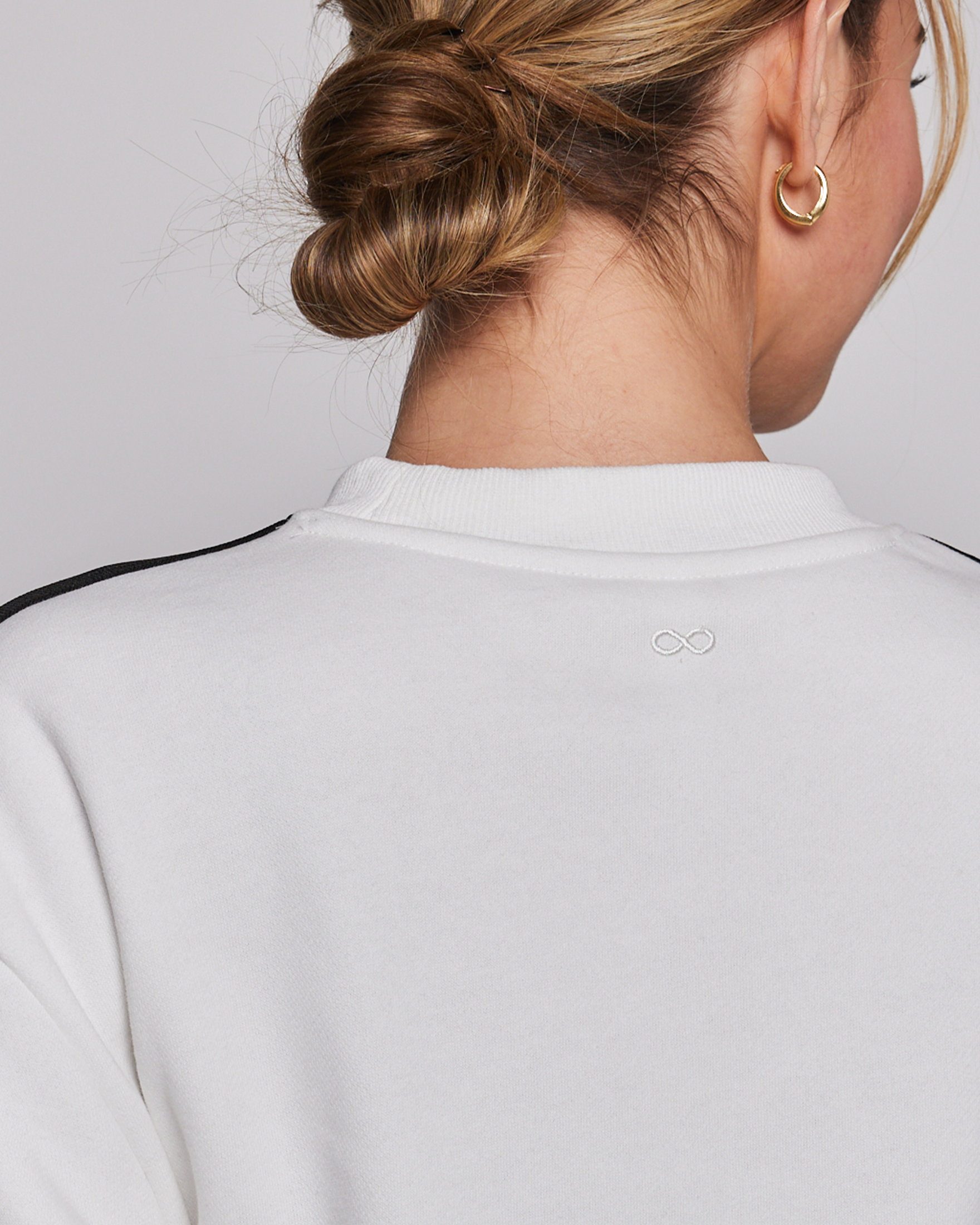 Plush fleeced crewneck sweater featuring stripes for a sporty and everyday look. Wear as an outer layer to and from practice, pair with your favorite leggings or jeans, and wear with sweats for comfy lounging.