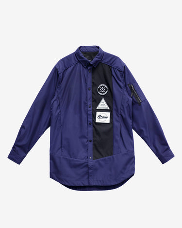 Crafted from water repellent fabric, this long shirt jacket features a contrast color panel on the chest adorned with intricate embroidery.