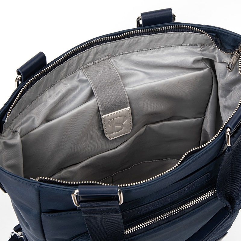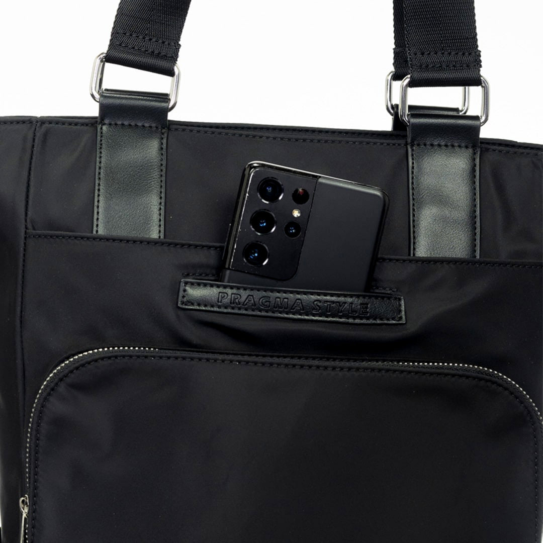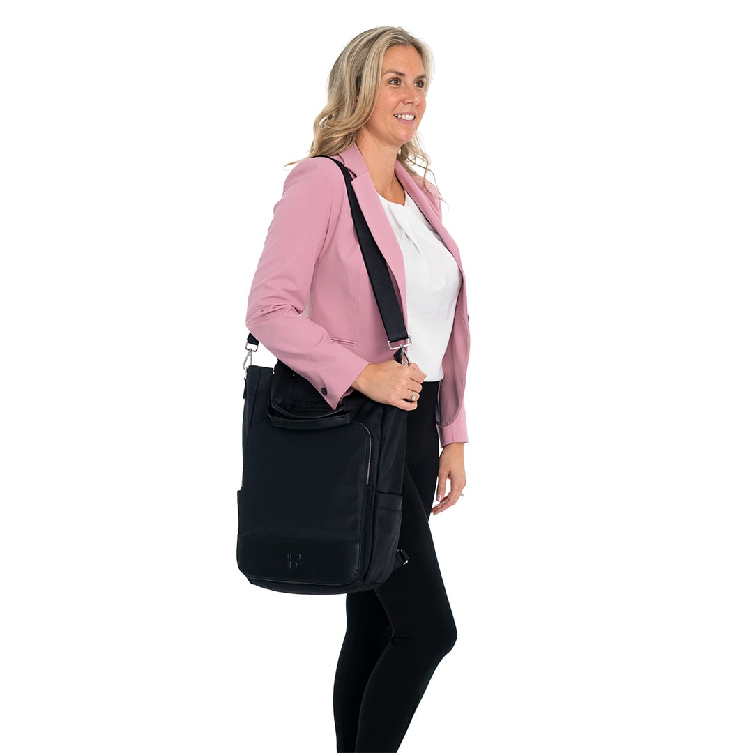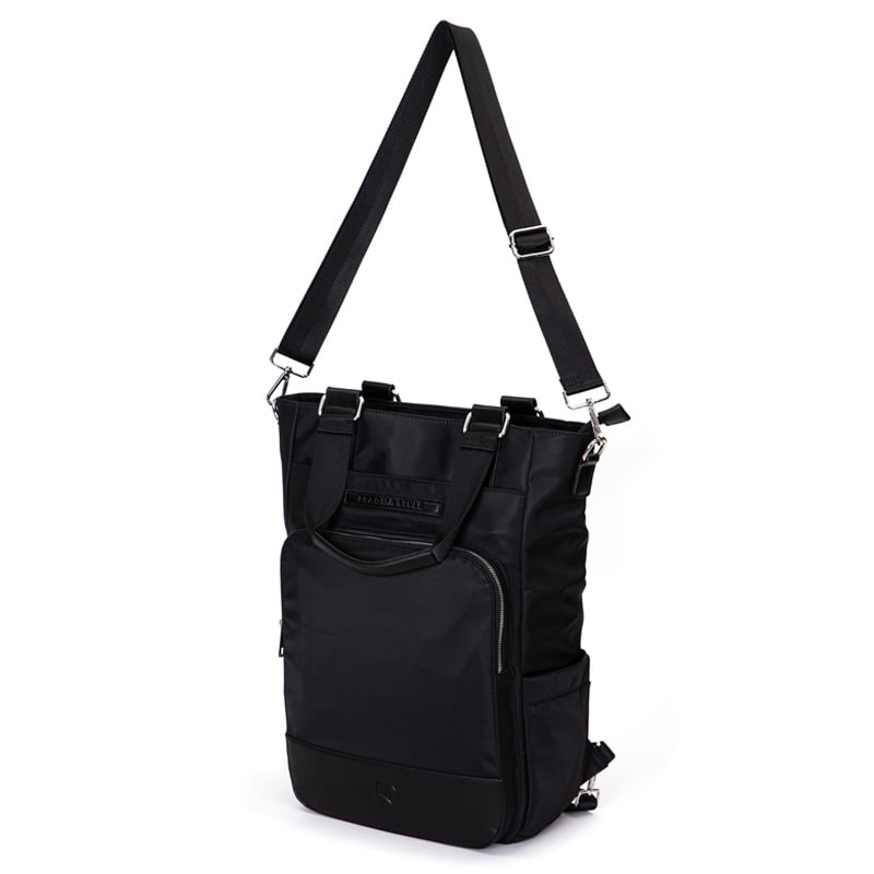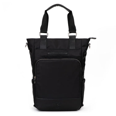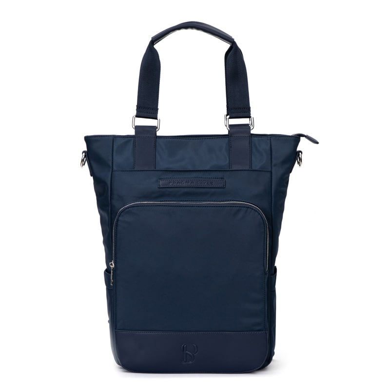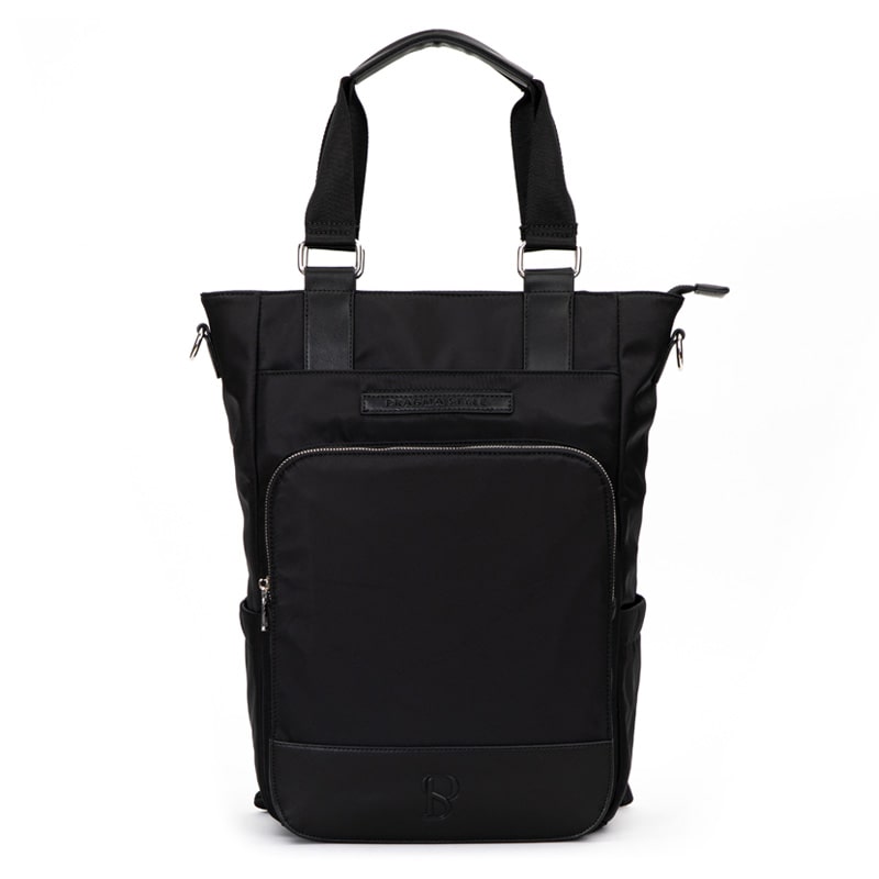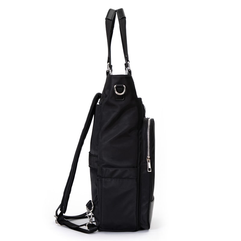 This bag is specifically designed to hold a 15-inch laptop. It offers four carrying styles. You can tuck its backpack straps into the rear compartment and remove its shoulder strap. A secret magnetic pocket at the front lets you keep your phone within arm's reach. The main compartment has a zipper, a padded laptop space, an RFID pocket, a translucent waterproof pocket, two pen holders, a key hook, and two side pockets. A spacious front pocket can hold magazines outside, and two expandable bottle holders are also present. All these features make this bag perfect for work or travel.