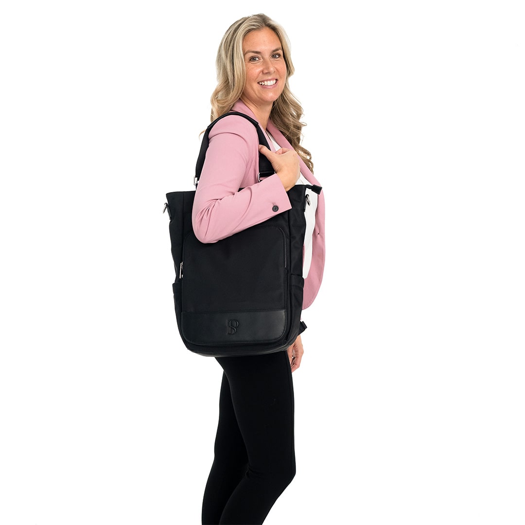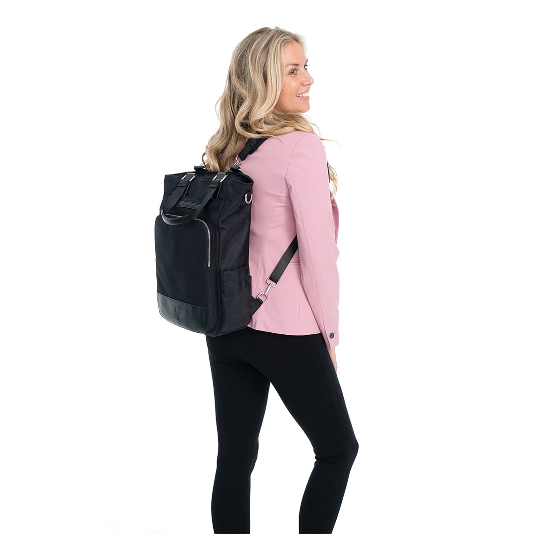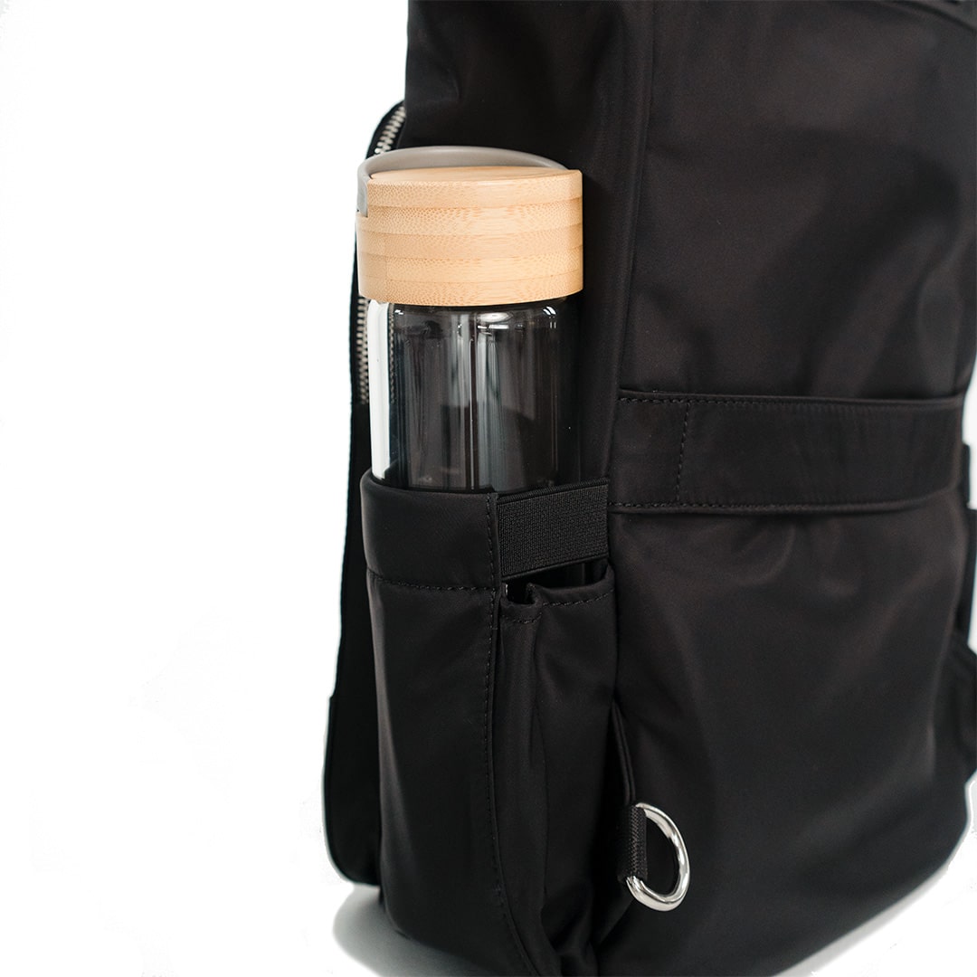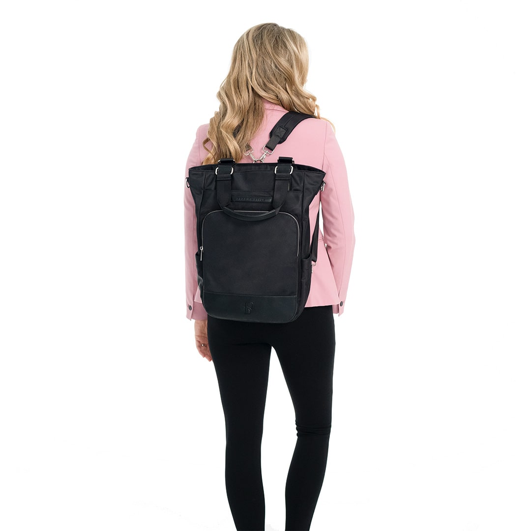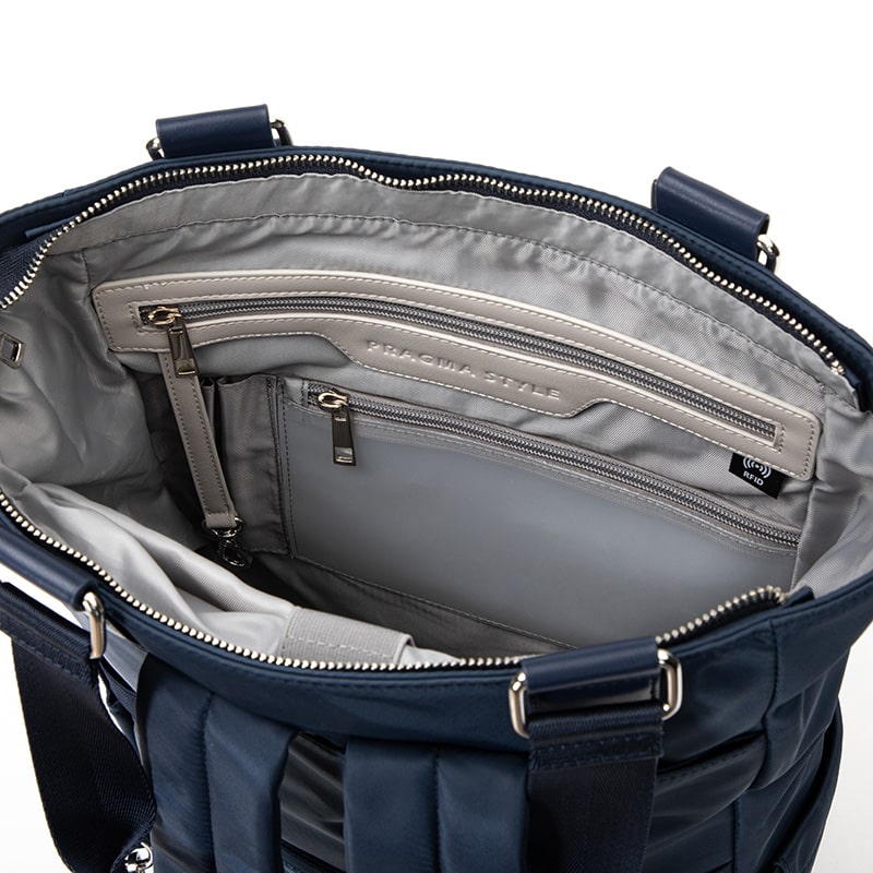 This bag is specifically designed to hold a 15-inch laptop. It offers four carrying styles. You can tuck its backpack straps into the rear compartment and remove its shoulder strap. A secret magnetic pocket at the front lets you keep your phone within arm's reach. The main compartment has a zipper, a padded laptop space, an RFID pocket, a translucent waterproof pocket, two pen holders, a key hook, and two side pockets. A spacious front pocket can hold magazines outside, and two expandable bottle holders are also present. All these features make this bag perfect for work or travel.