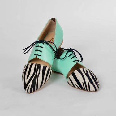 Embark on a stylish journey with Nomad, featuring black and white zebra print on genuine calfhide paired with pastel mint leather.