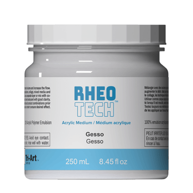 Rheotechs Acrylic Gesso is made with 100% acrylic and contains calcium carbonate for the best strength, adhesion, coverage and flexibility. It creates a slightly porous ground, suitable for both acrylic and oil paints. Rheotech Gesso dries to a matte, white, opaque finish with a slight tooth that can be sanded to provide a smoother surface. It has excellent adhesion to surfaces and will not lift, crack or chip from the surface. Rheotech Gesso is truly white for a highly reflective ground which will enhance colours. For creating custom reflective coloured grounds, Rheotech Gesso can be tinted with Rheotech Acrylic Colours.