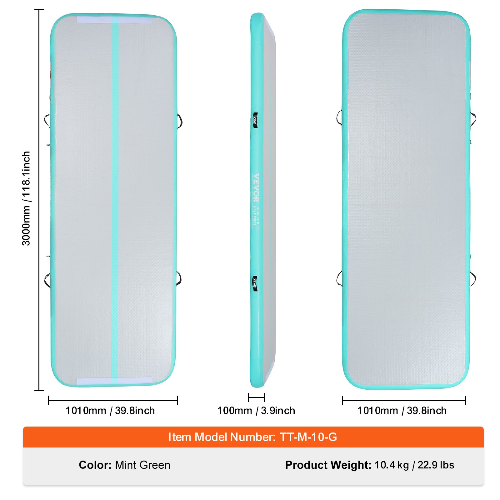 PRODUCT DESCRIPTION VEVOR Gymnastics Air Mat, 4 inch Thickness Inflatable Gymnastics Tumbling Mat, Tumble Track with Electric Pump, Training Mats for Home Use/Gym/Yoga/Cheerleading/Beach/Park/Water, 10 ft, Mint Green
