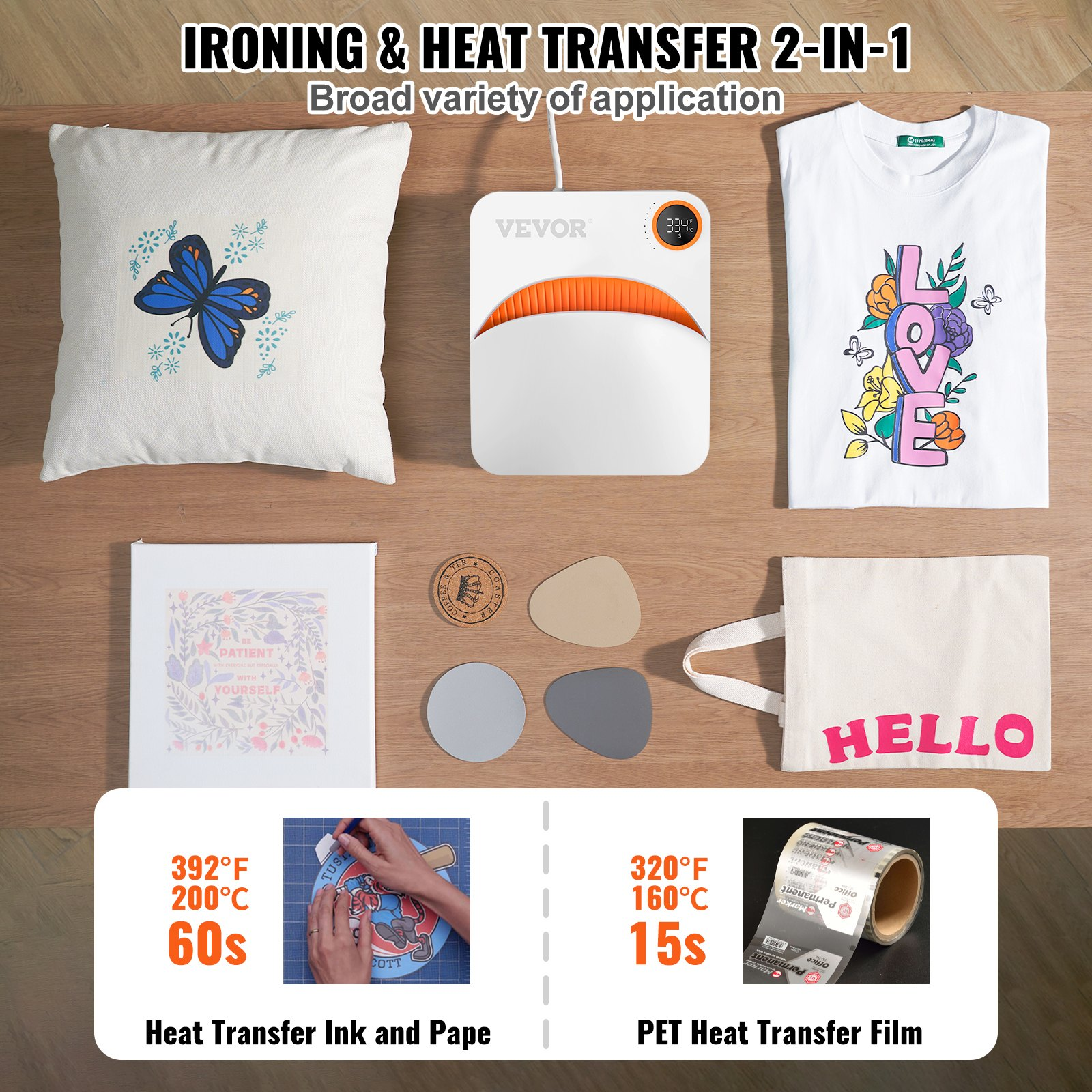 PRODUCT DESCRIPTION VEVOR Heat Press Machine, 7x6 inches Portable Shirt Printing Multifunctional Sublimation Transfer Heat Press Machine Teflon Coated, Easy Iron-on Press for T-shirts/Bags/HTV/Pillows Vinyl Projects