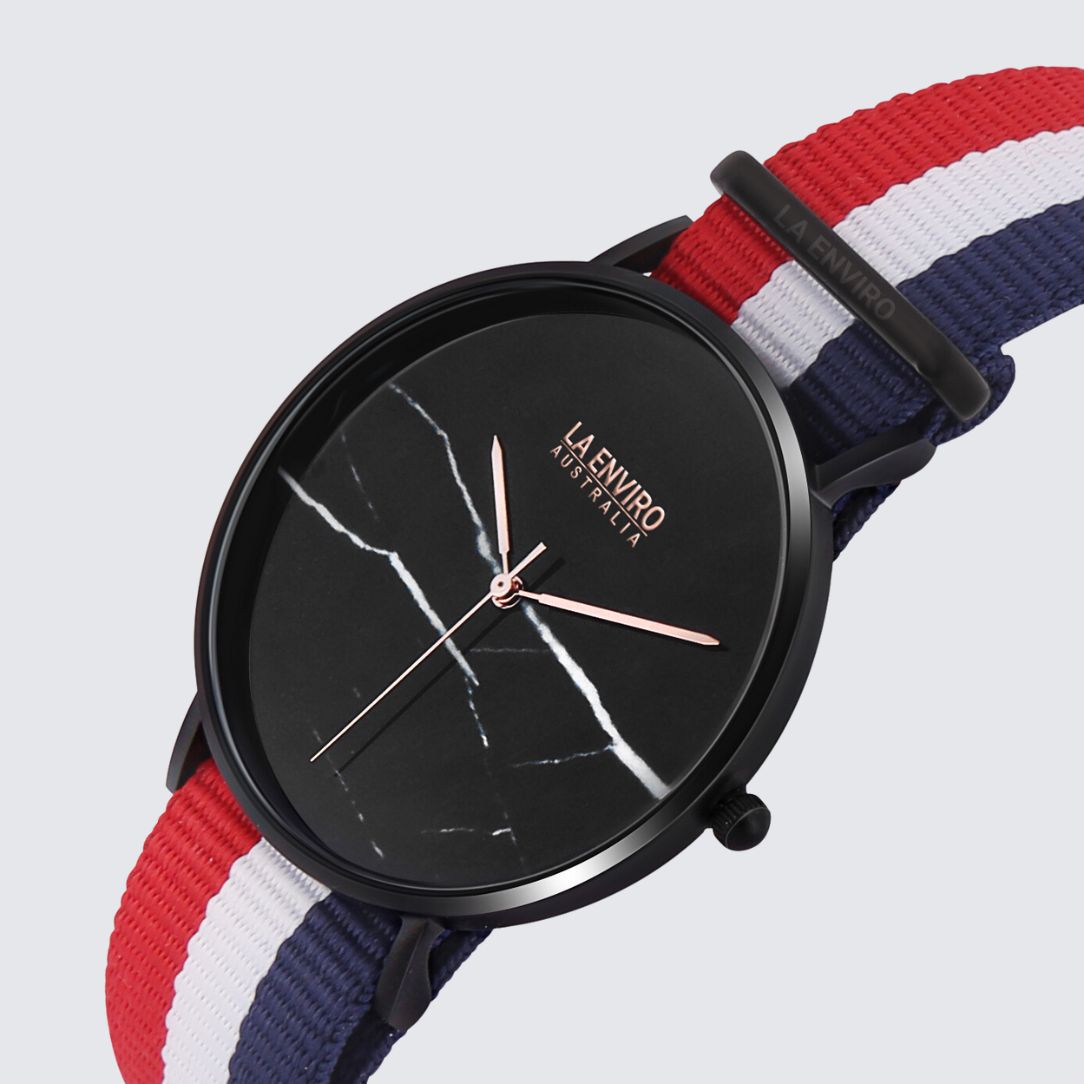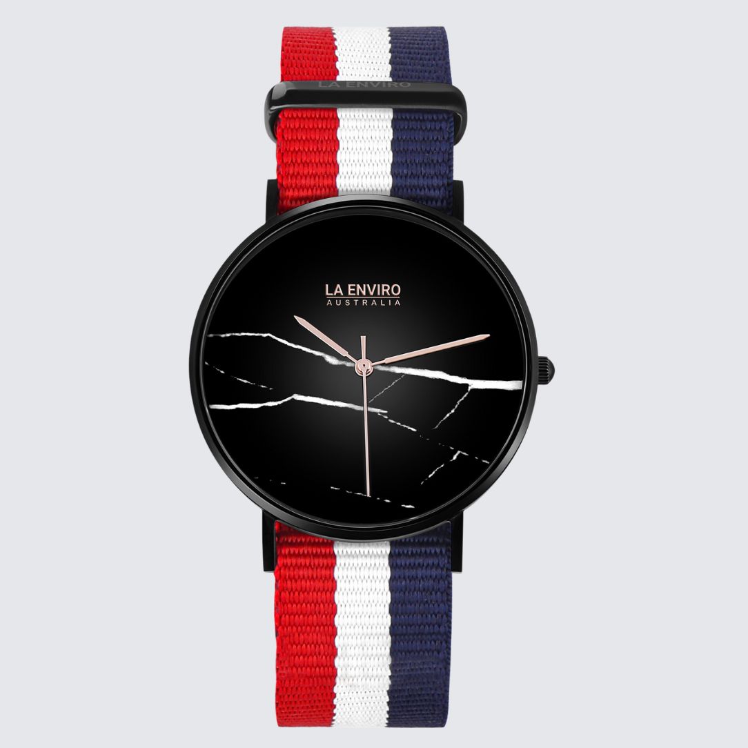 Black Marble Watch With Red, Blue & White Nato Strap I 40 MM
