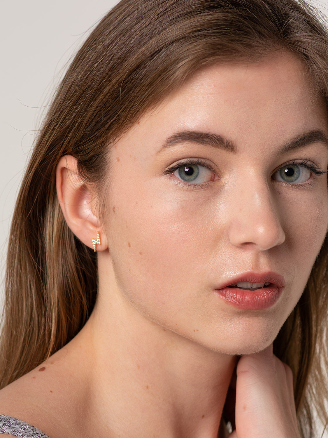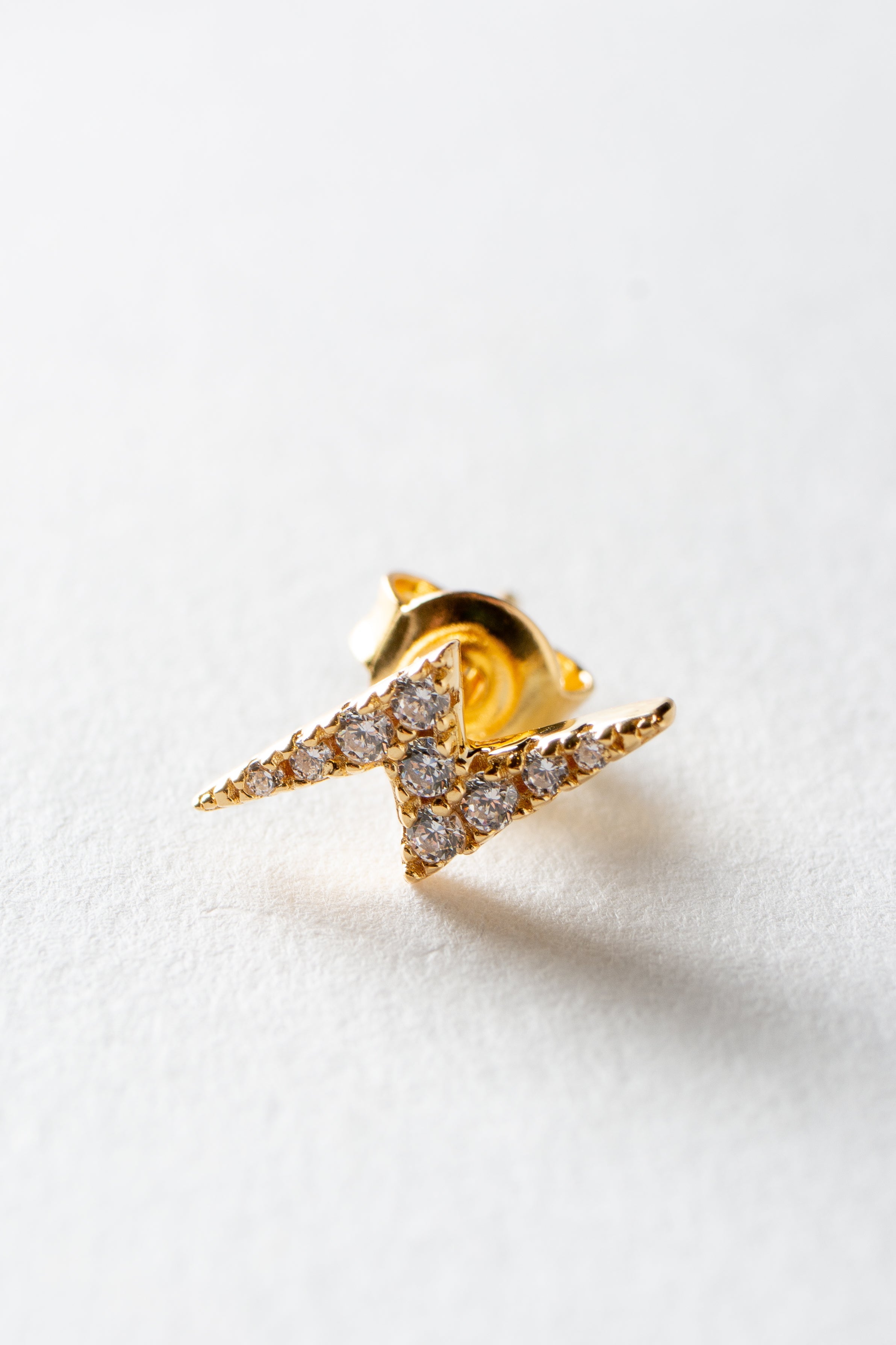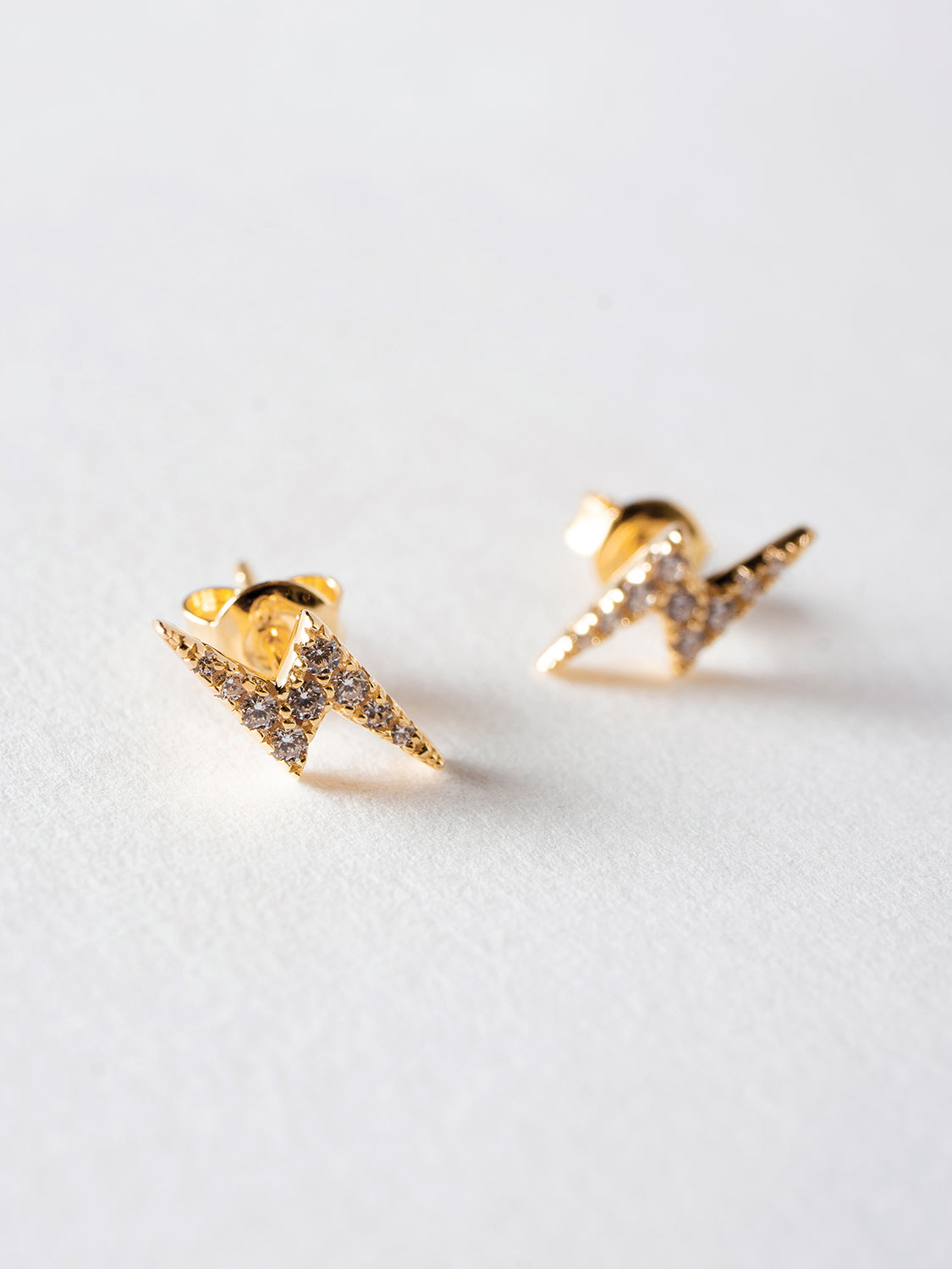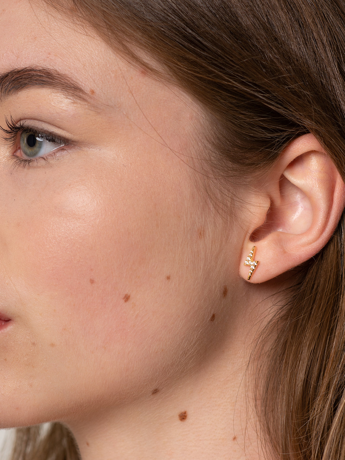 Infuse your outfit with a touch of fun and sparkle with our gold lightning bolt earrings. Featuring delicate cubic zirconia embellishments, these earrings offer a subtle yet eye-catching dazzle that shines both day and night. Perfect for adding a playful twist to any ensemble, they effortlessly elevate your style with a hint of glamour. Make a statement with these striking earrings that combine elegance with a dash of excitement.