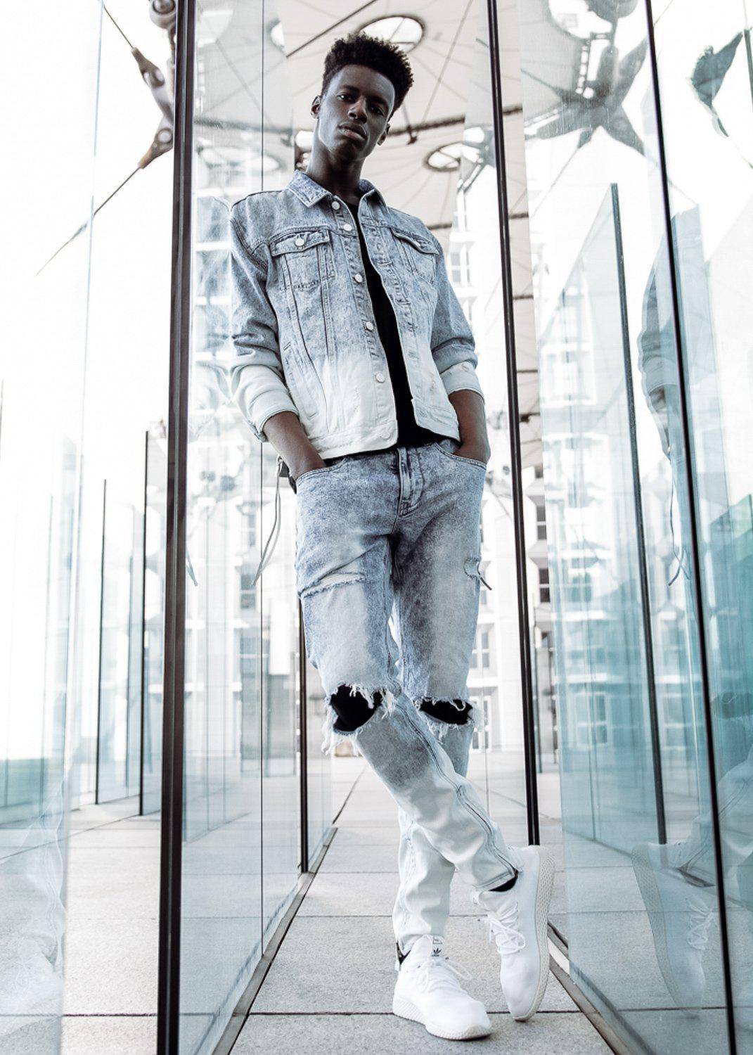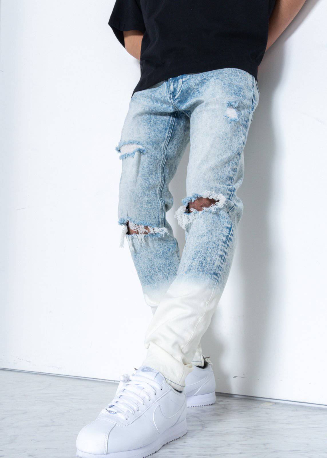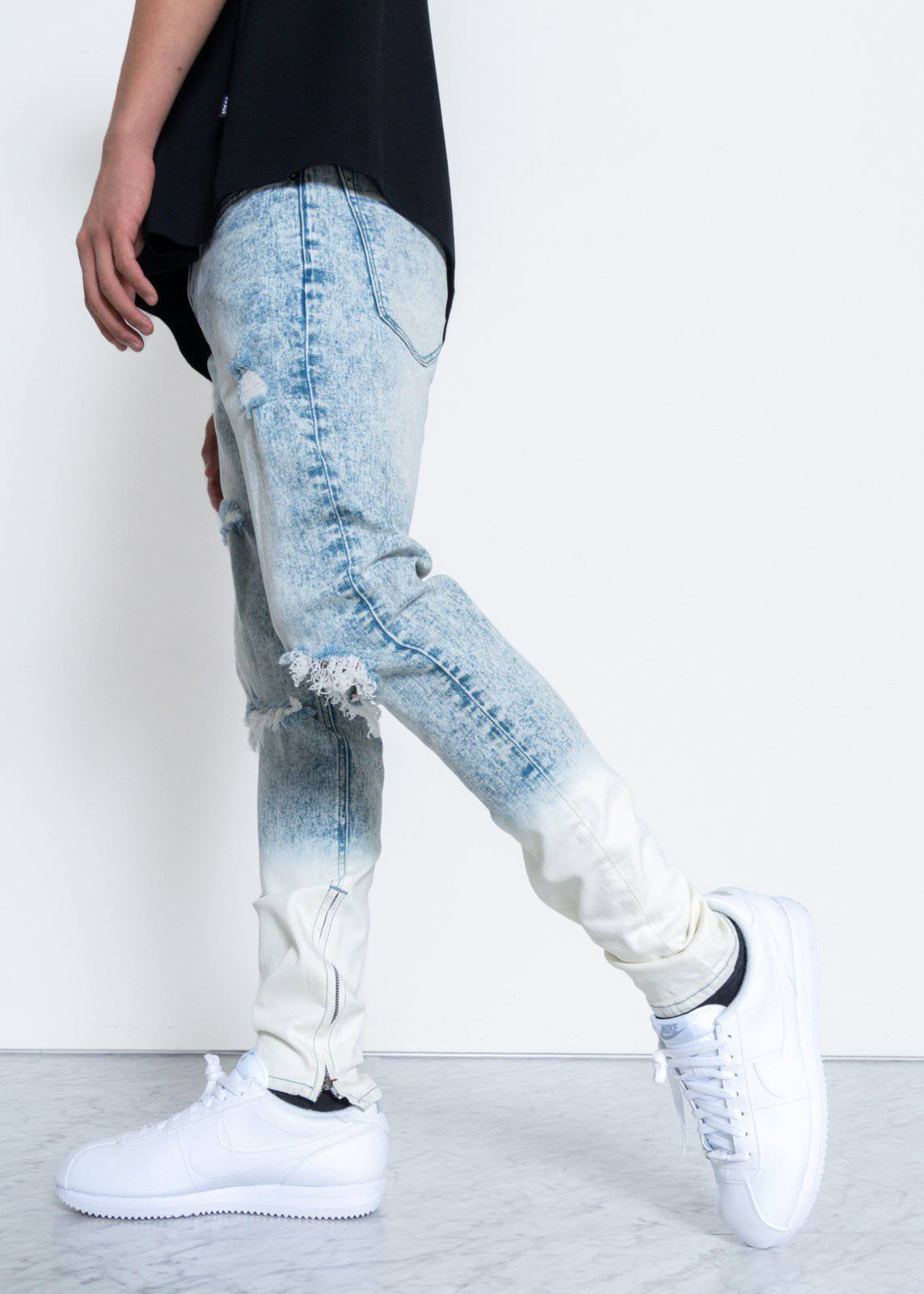 Slim tapered blue denim with acid wash and ombre bleaching at the bottom features zippers at inseams and rips on thighs and knees