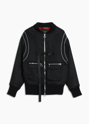 Light-filled oversize bomber jacket with full metal zipper front comes with bellow pockets with flap, reflective piping detail around armholes and nylon tape, and metal buckle closure on front.