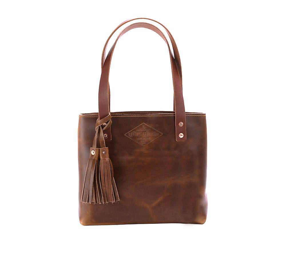 The small version of our best selling leather tote, "Lifetime Tote". This women's tote bag is handmade with the finest American full grain leather and craftsmanship. It comes with the option of a front pocket, zippered tote, and tassel accessory. The Mini Tote is a perfect and lightweight everyday bag.