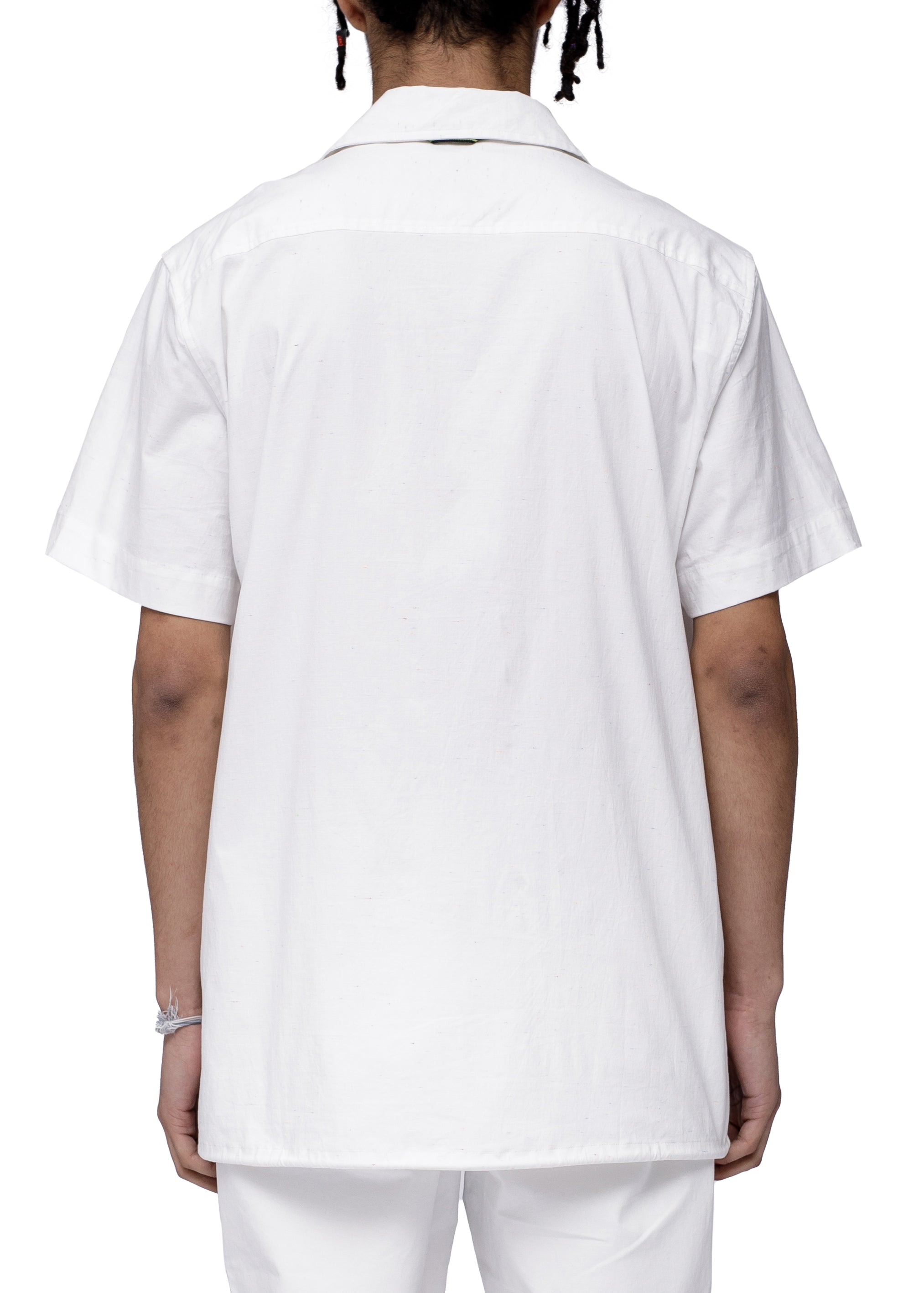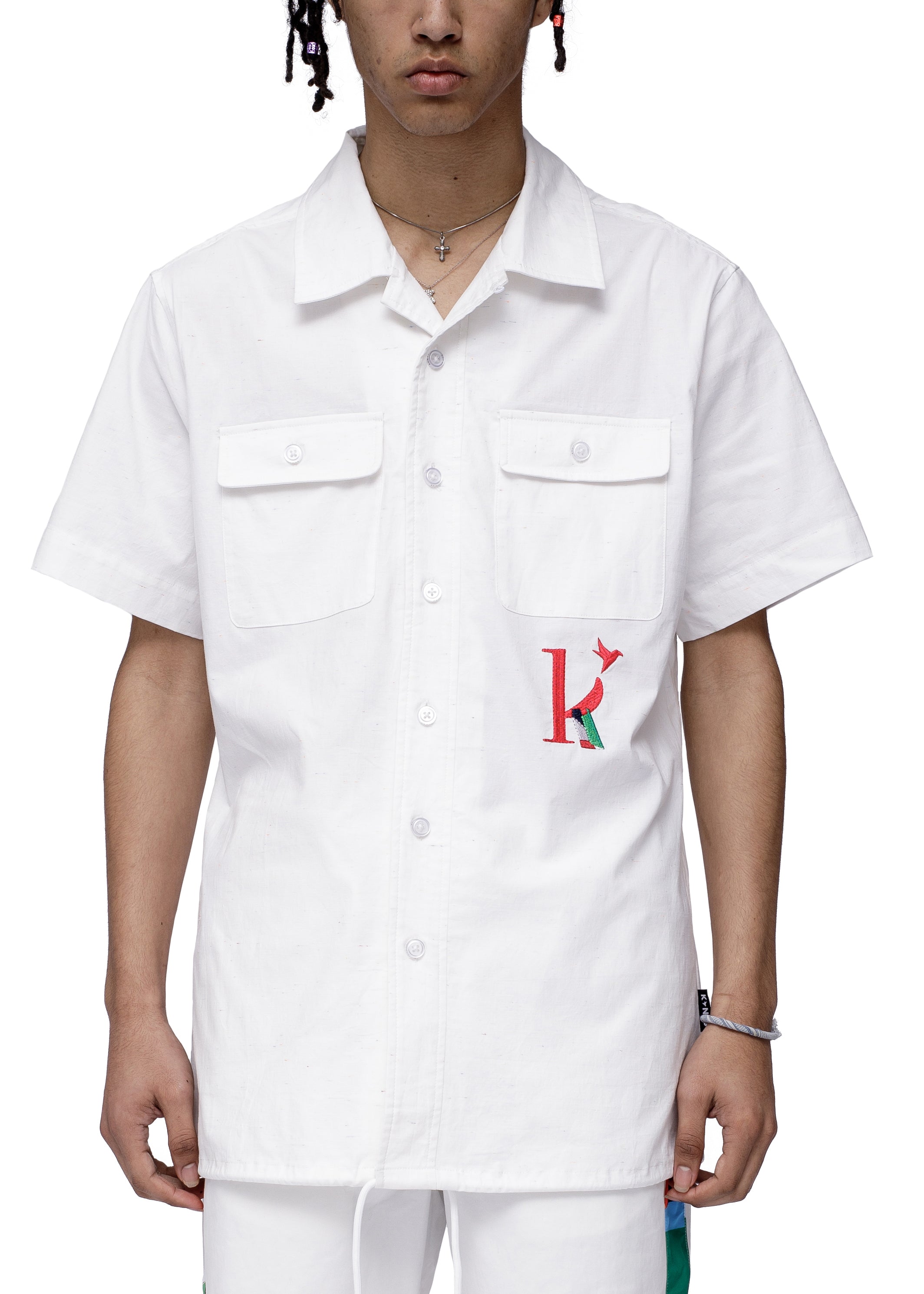 Open collar short sleeve shirt with chest pockets with flaps and embroidery below left chest pocket and drawcord on hem.