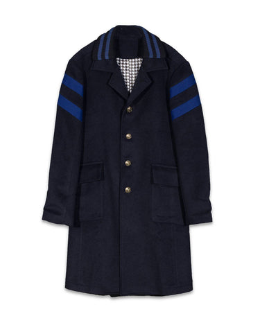 Wool blend single-breasted coat with contrast color stripes over sleeves and back. Also features a striped sweater rib on collar