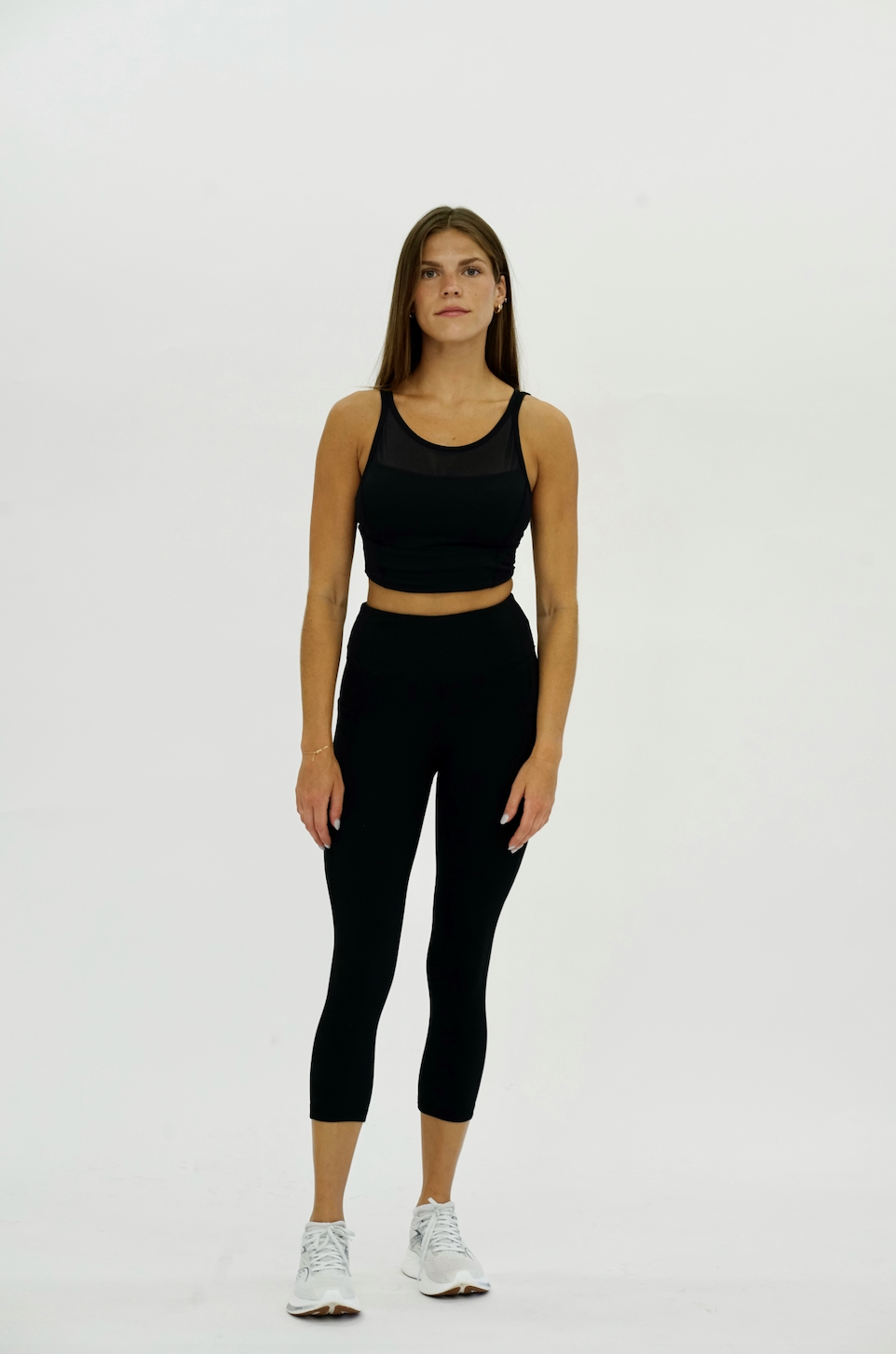 Featuring a unique criss cross back, mesh detailing, and pockets for optional, removable cups. This bra-top also has a built-in shelf bra for added support and coverage!