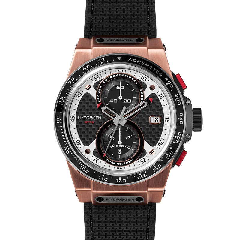 Edgy sport design inspired by the pursuit of the thrill is represented in this Otto Chrono style with a rose gold plated solid steel case in 44mm, and black carbon fiber dial, a Tachymeter and 10 ATM water resistance. A black silicone strap adds to the superior componentry offered in this Hydrogen Watch.