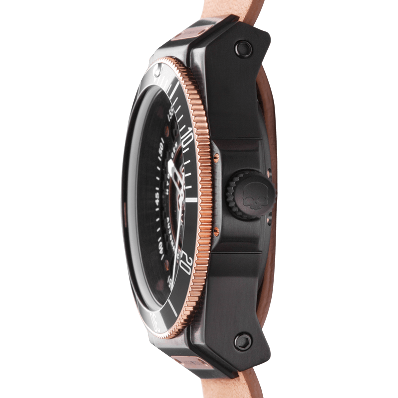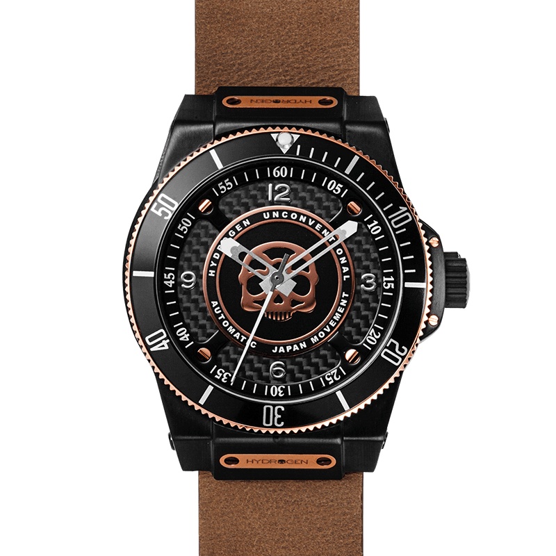 Built on precision, this Sportivo model fuses a high fashion luxury coloration of black and rose gold watchcase in 42mm, paired with artisanal brown leather strap. The iconic Hydrogen brand skull logo is electroplated in rose gold centrally positioned on the dial to make a bold statement on this automatic movement Watch.