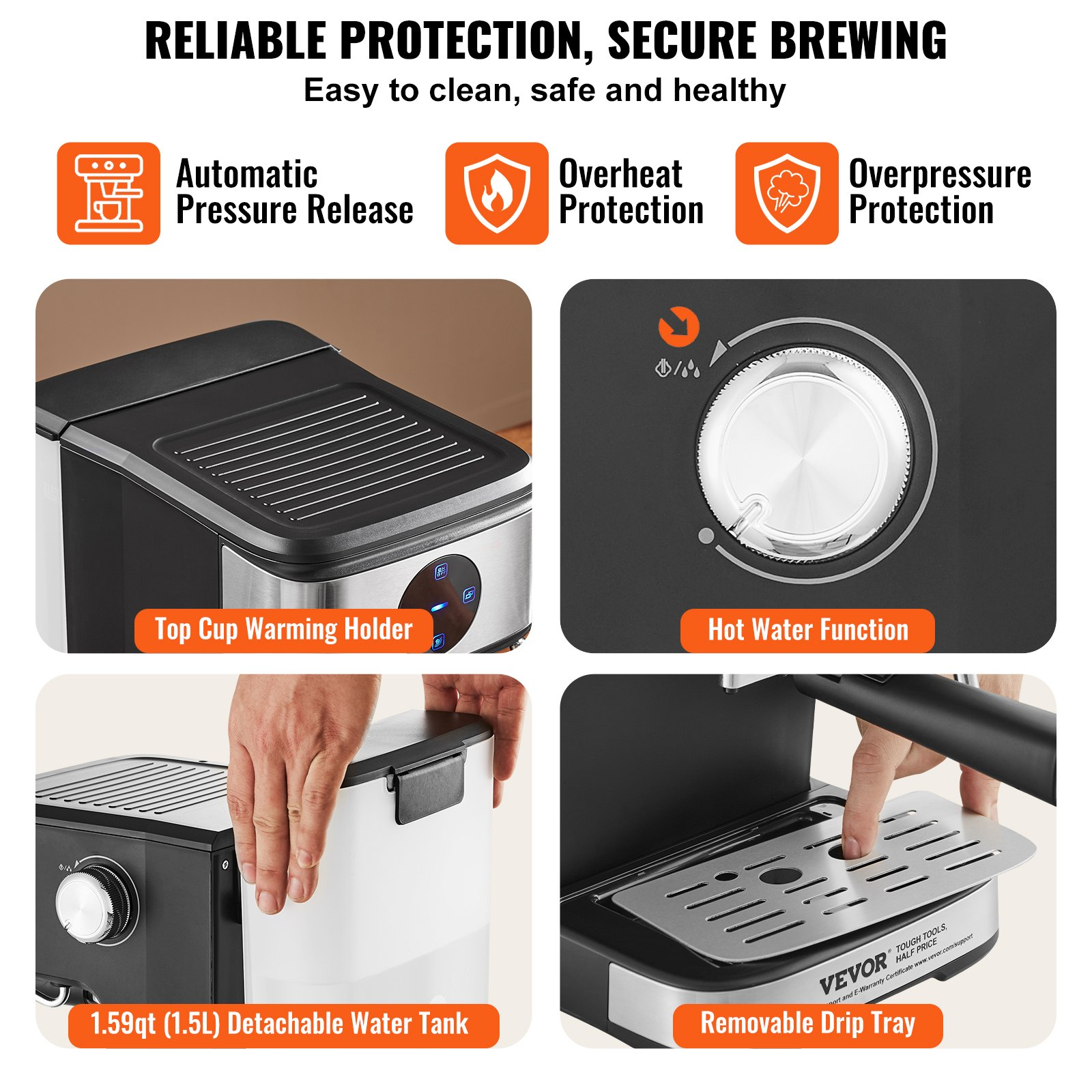 (FINAL PRICES ARE LOWER ON OUR SITE!) VEVOR Espresso Machine, 15 Bar Coffee and Espresso Maker with Milk Frother Steam Wand, Professional Semi-Automatic Cappuccino Latte Machine with Touch Screen & Removable Water Tank, NTC Control System