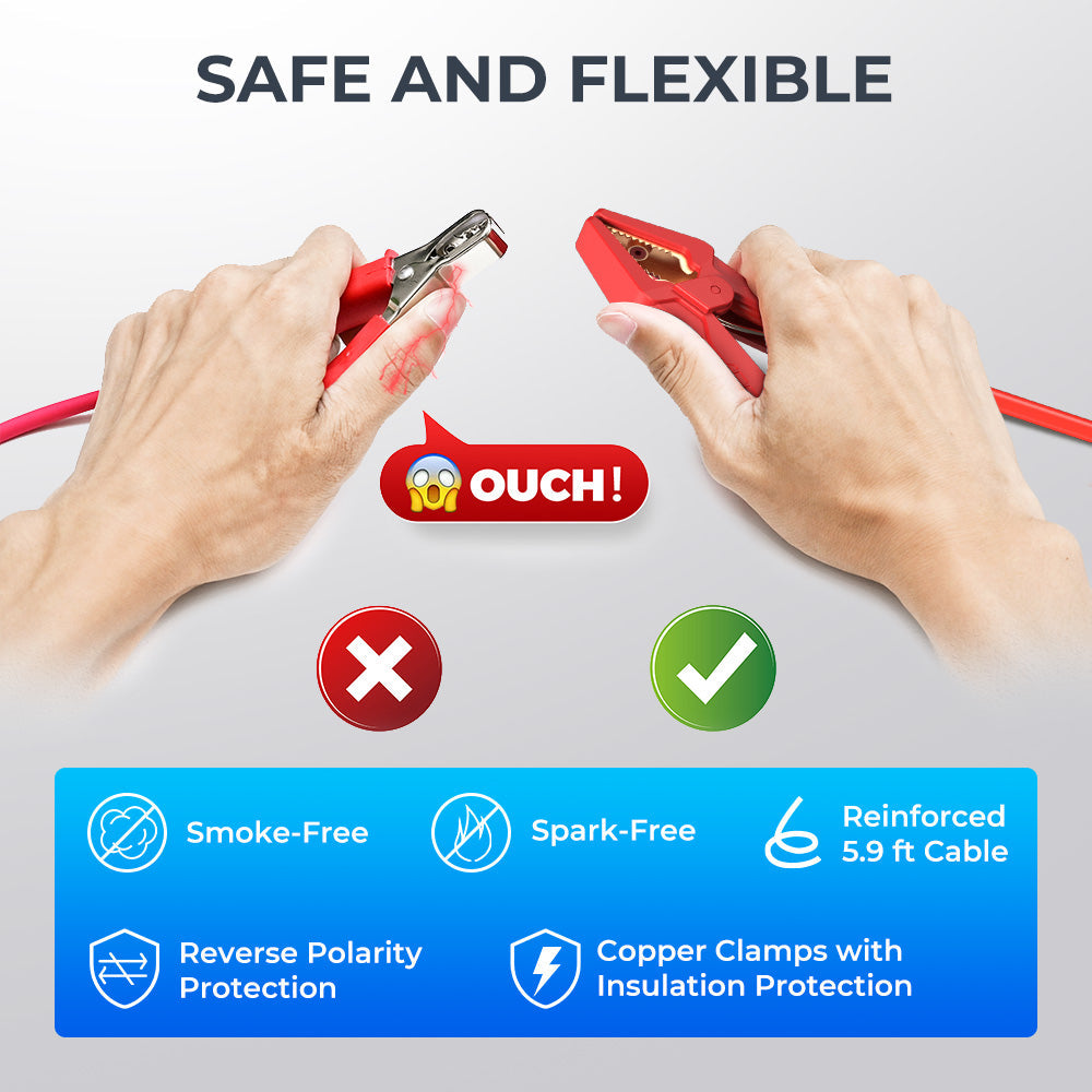 • The device come with premium large, reinforced, smoke-free, spark-free copper clamps. Its reverse polarity protection will prevent battery damage, saving you money from repair and replacement.