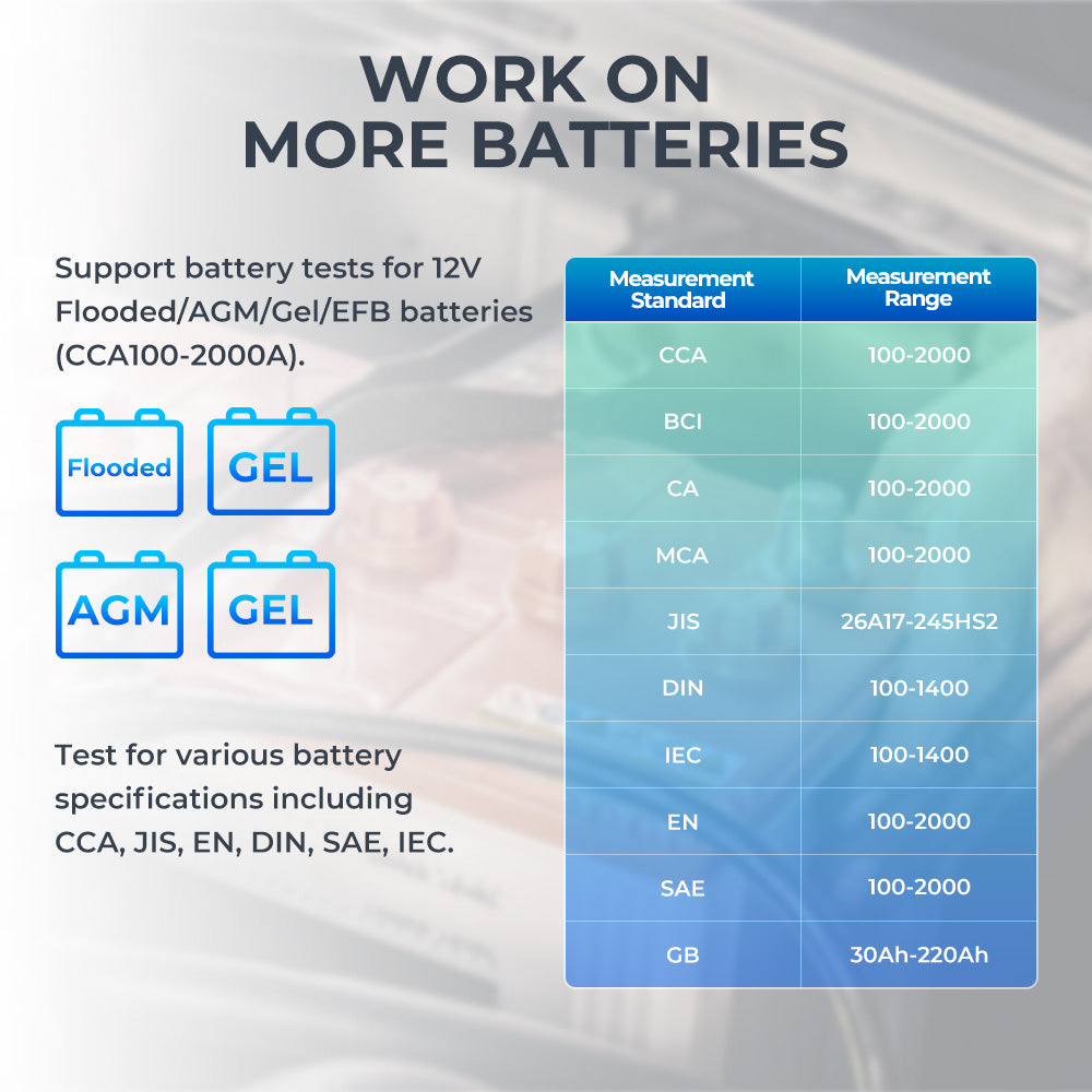 The BT600 is an advanced battery tester for 12V and 24V systems. With a 3.5 inches color screen and a built-in thermal printer, this tool offers the ultimate solution for accurate, fast, and convenient testing. It allows you to easily view the battery's condition and print test reports in real-time.