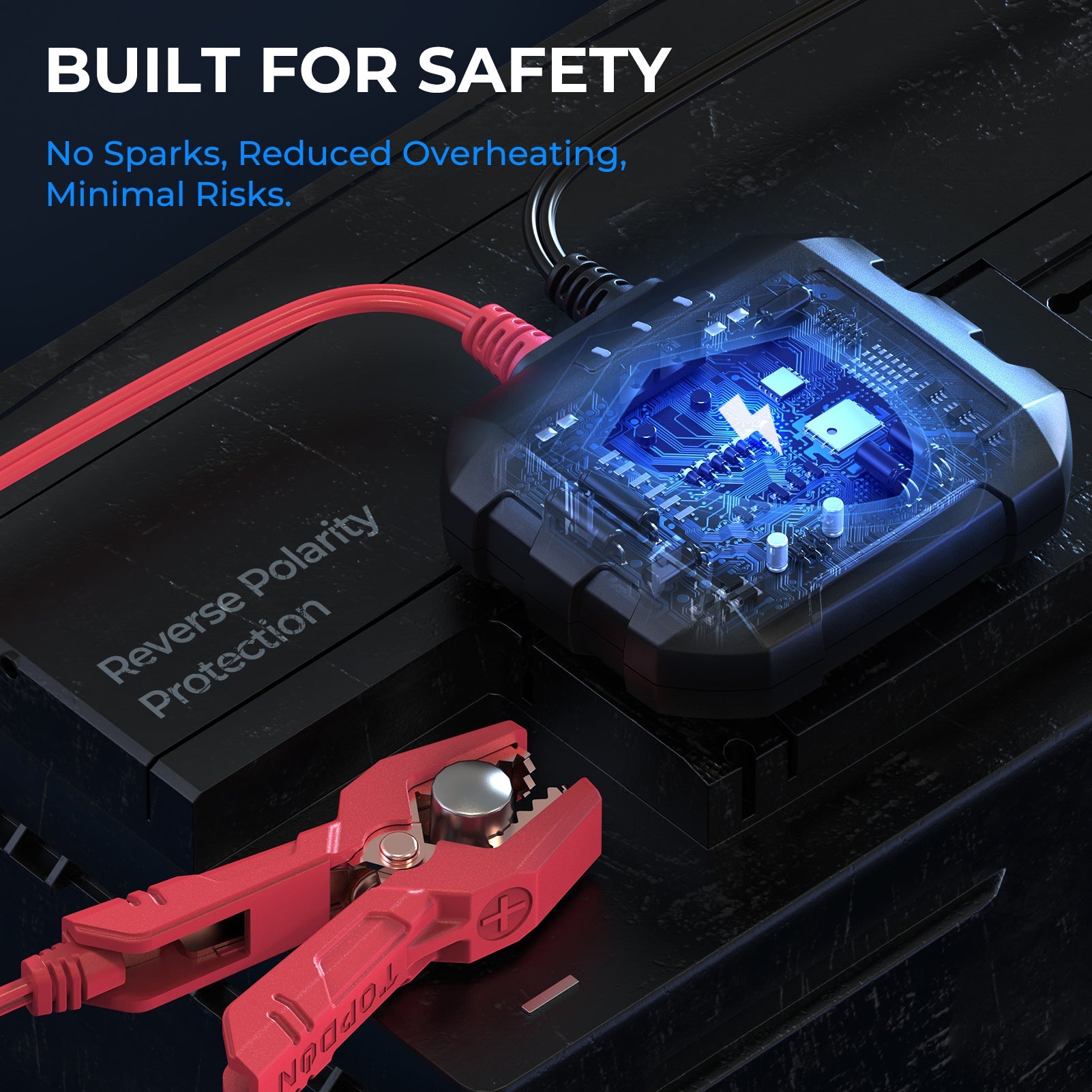 Safety is built into every feature. The spark-free battery clamps provide added protection along the entire test procedure. Reverse polarity protection saves batteries and battery testers from being damaged by high-power currents.