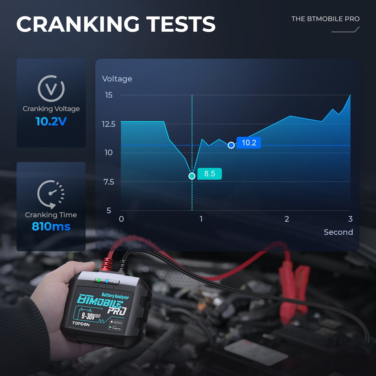 Shows the State of Charge (SOC), State of Health (SOH), Battery Voltage, and Cold Cranking Amps (CCA).Cranking Tests: