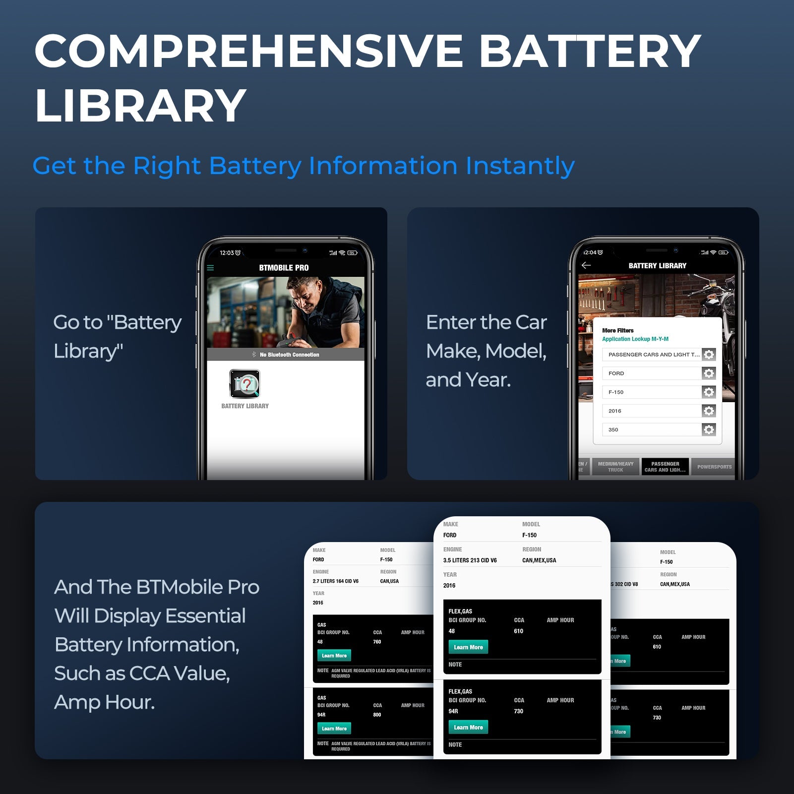 Comprehensive Battery Library: Even if a battery label is unrecognizable, the BTMobile Pro's battery library has extensive coverage to find your battery's most important information.