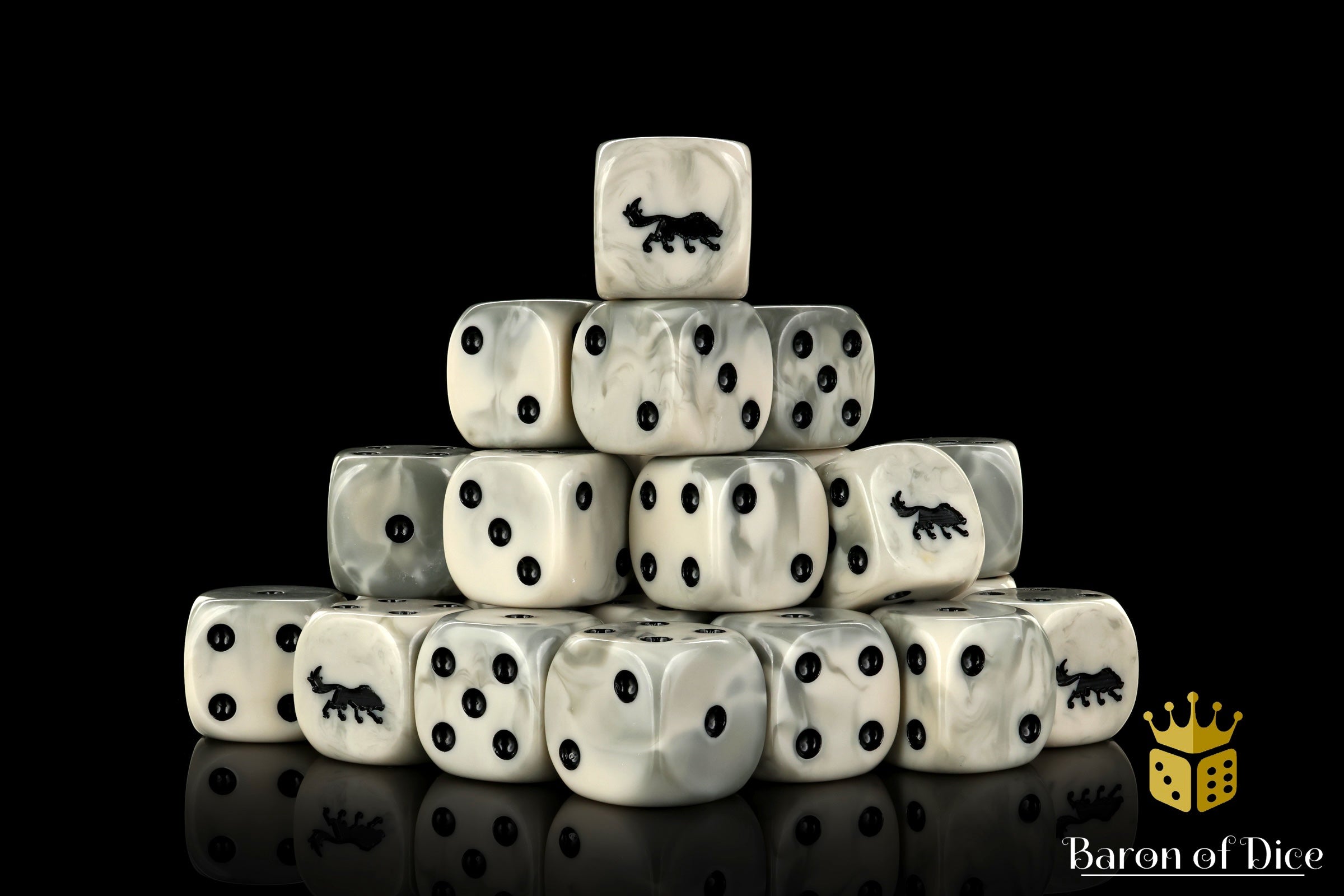 Snow is falling, winter is surely coming. These contain a mix of freshly laid snow with veins of light greys swirled and inlaid with a flawless black; hand mixed resin 16mm dice. The symbols are on the 6 side. Our premium dice come in unique reusable tins when purchased in x25 and x50 count quantities.