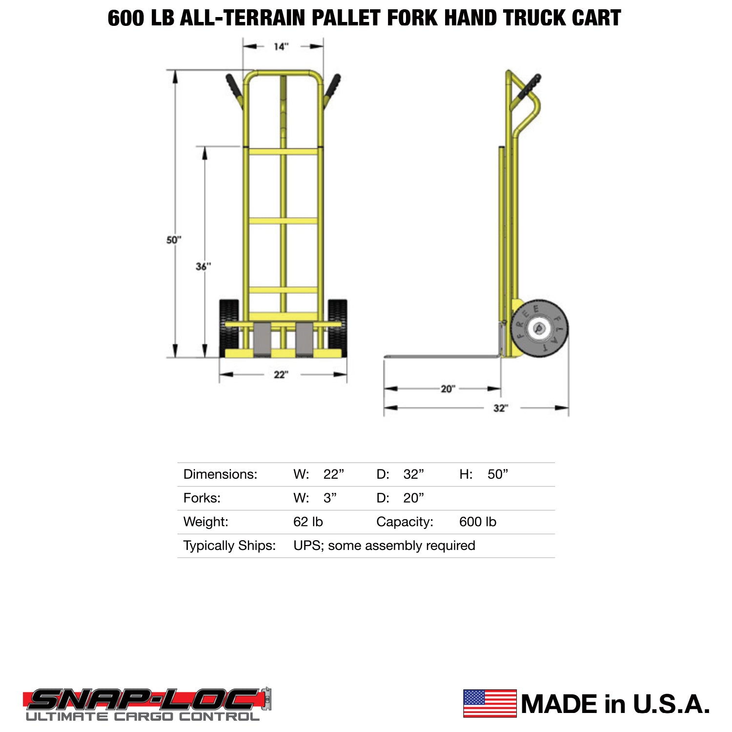 - SPECIFICATIONS: Easily handles 600 lb capacity on 2 wheels. Assembled upright 22x32x50 in height. 62 lbs. Snap-Loc tie-down straps sold separately.