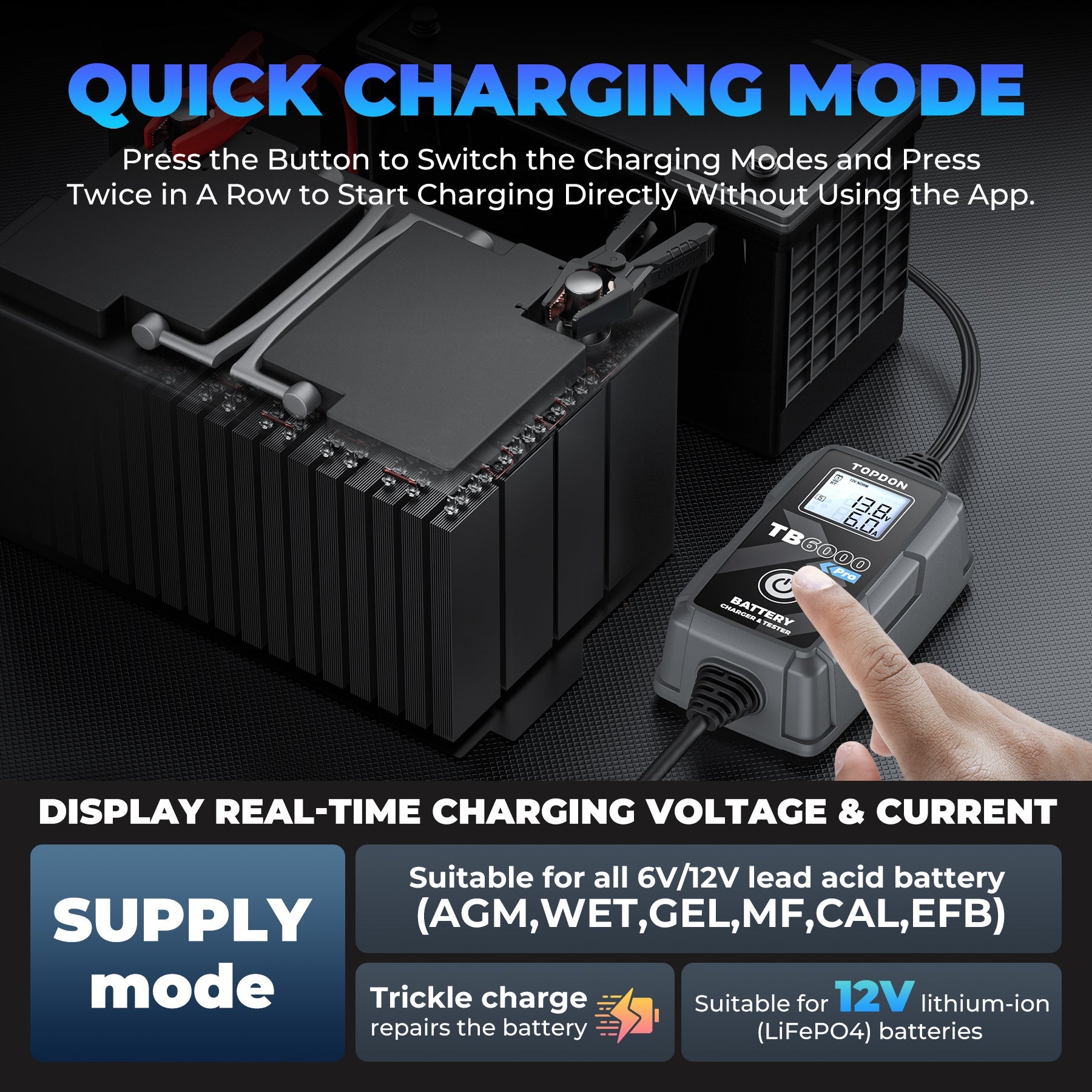 • TOPDON’s patented 9-step smart charging gives your lead-acid battery an optimized, maintained, and integrated charging process. When connected, not only will the TB6000Pro charge the battery, but it will desulfate and act a battery maintainer to truly repair your car battery. Moreover, the TB6000Pro specializes in offering a specialized smart charging mode for lithium batteries.