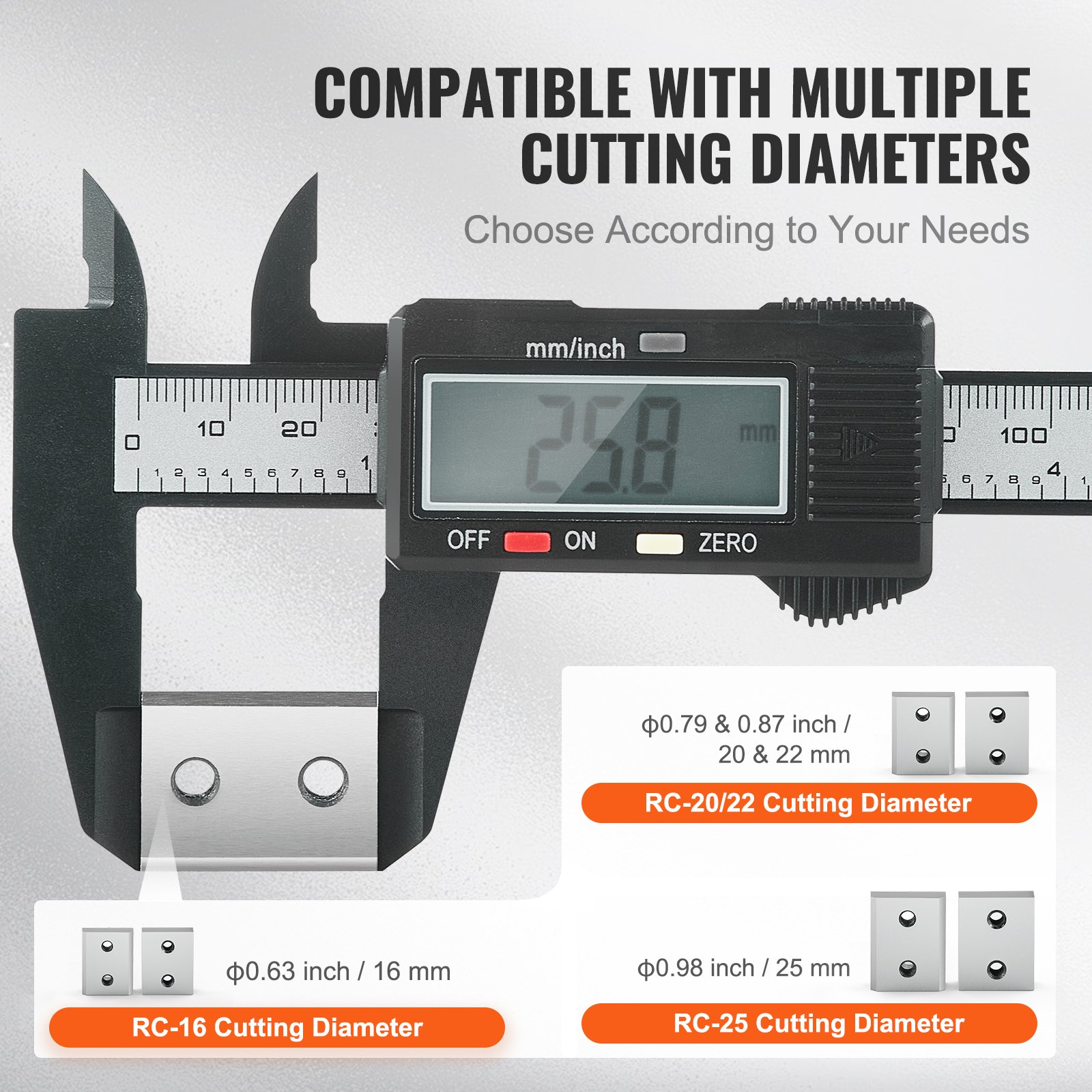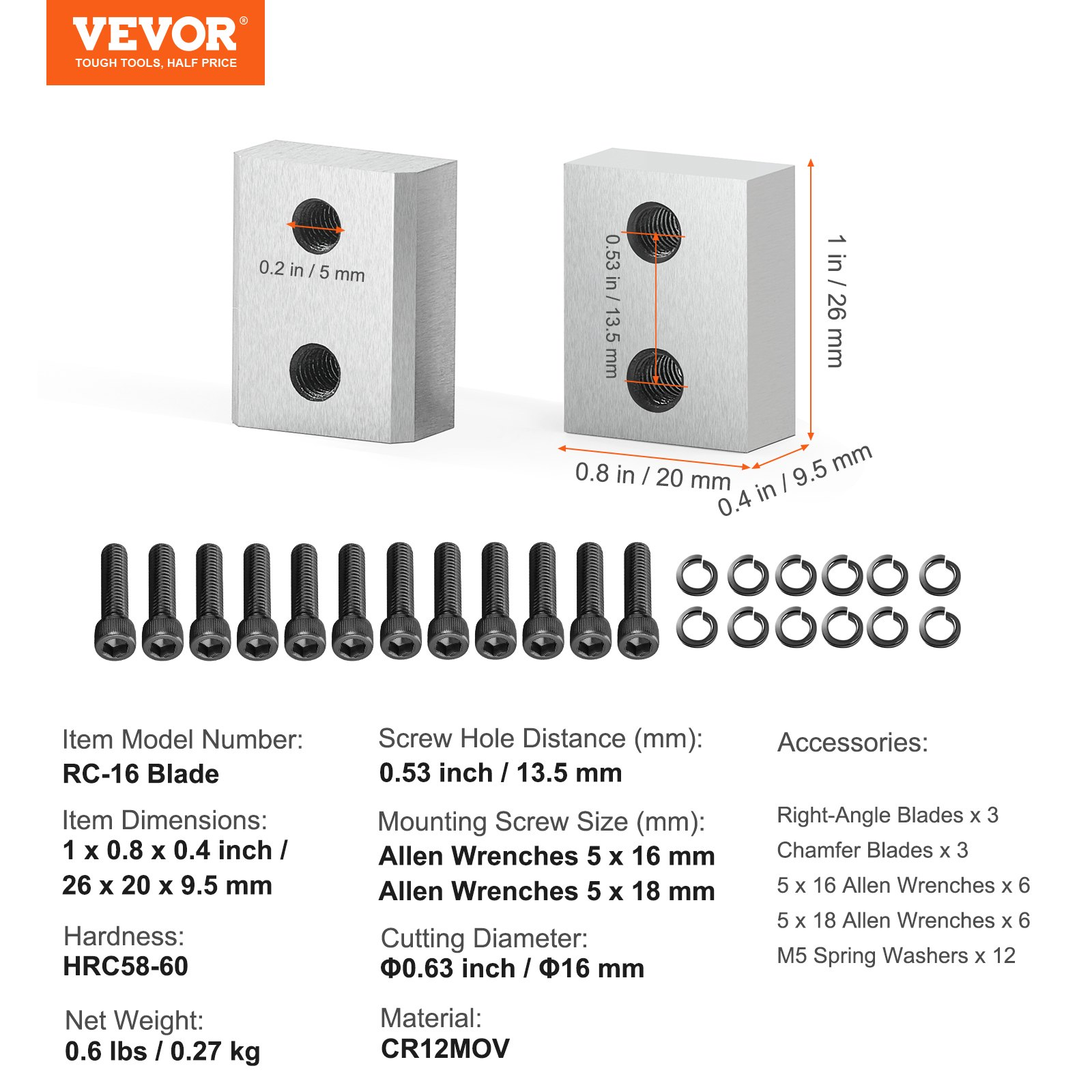 Item Model Number: RC-16 Blade,Mounting Screw Size (mm): Allen Wrenches 5 x 16 mm, Allen Wrenches 5 x 18 mm,Item Dimensions: 1 x 0.8 x 0.4 inch / 26 x 20 x 9.5 mm,Material: CR12MOV,Hardness: HRC58-60,Net Weight: 0.6 lbs / 0.27 kg,Screw Hole Distance (mm): 0.53 inch / 13.5 mm,Cutting Diameter: Φ0.63 inch / Φ16 mm