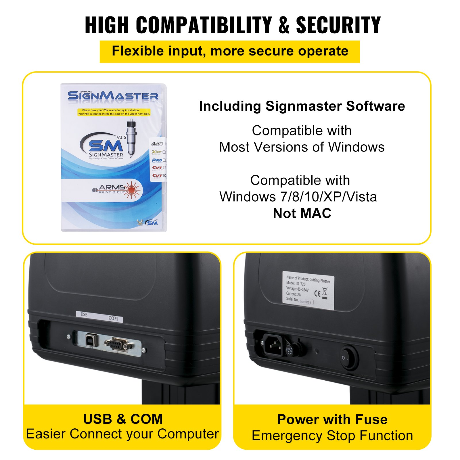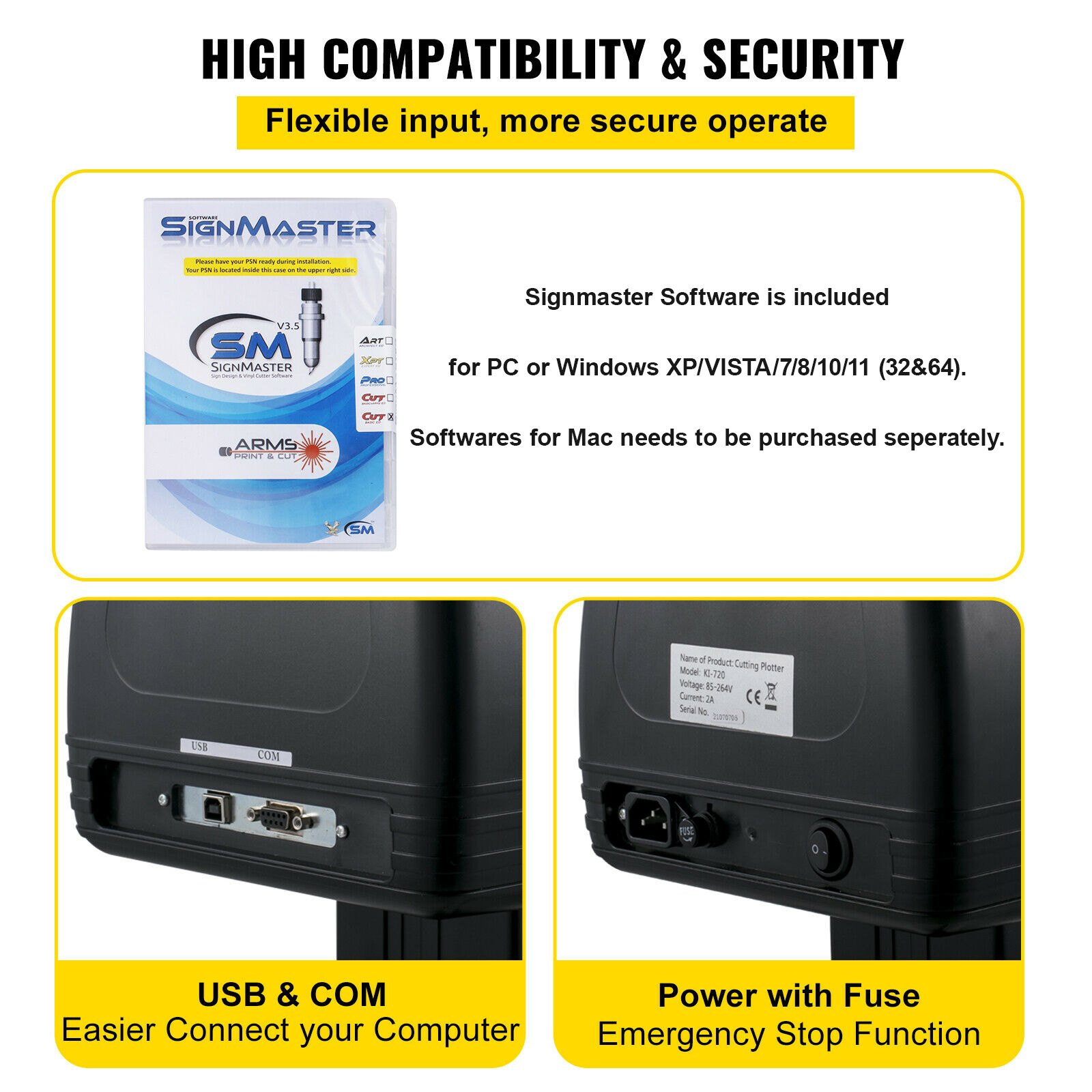 Blade Material: Tungsten Steel,Max. Cutting Force: 1.1 lbs / 500 g,Max . Cutting Thickness: 0.12in / 3 mm,Included Software: SignMaster,Weight: 21.4 lbs / 9.7 kg,Supported Software: SignMaster / Signcut / Flexi,Product Size: 37.8 x 13 x 16.5 in / 96 x 33 x 42 cm,Max. Cutting Width: 24.8 in / 630 mm,Body Material: Aluminum,Cutting Precision: ±0.004 in / ±0.01 mm,Motor Type: Stepper,Model: KI-720,OS Compatibility: Windows XP, Vista, 7, 8, 10,Pinch Rollers: 3,On-Line Mode: USB / COM,Max. Feed Width: 28.3 in / 720 mm,Max. Cutting Speed: 31.5 ips / 800 mm / s,Power: AC 90-264V