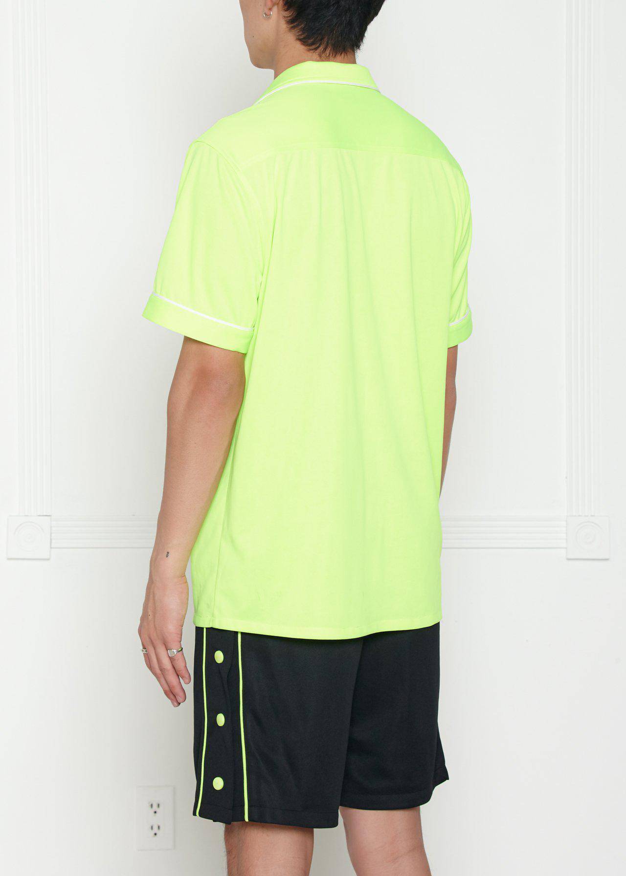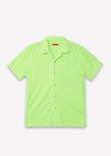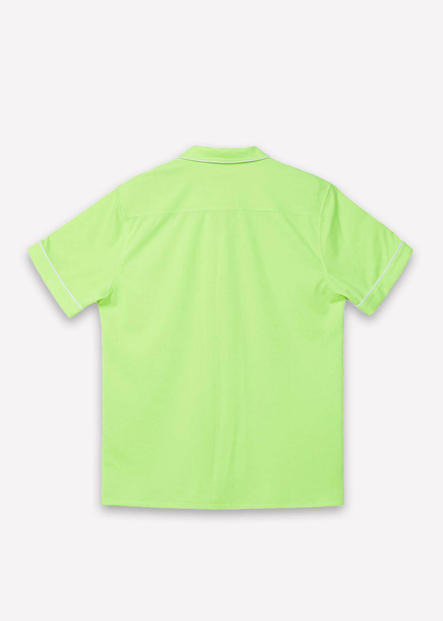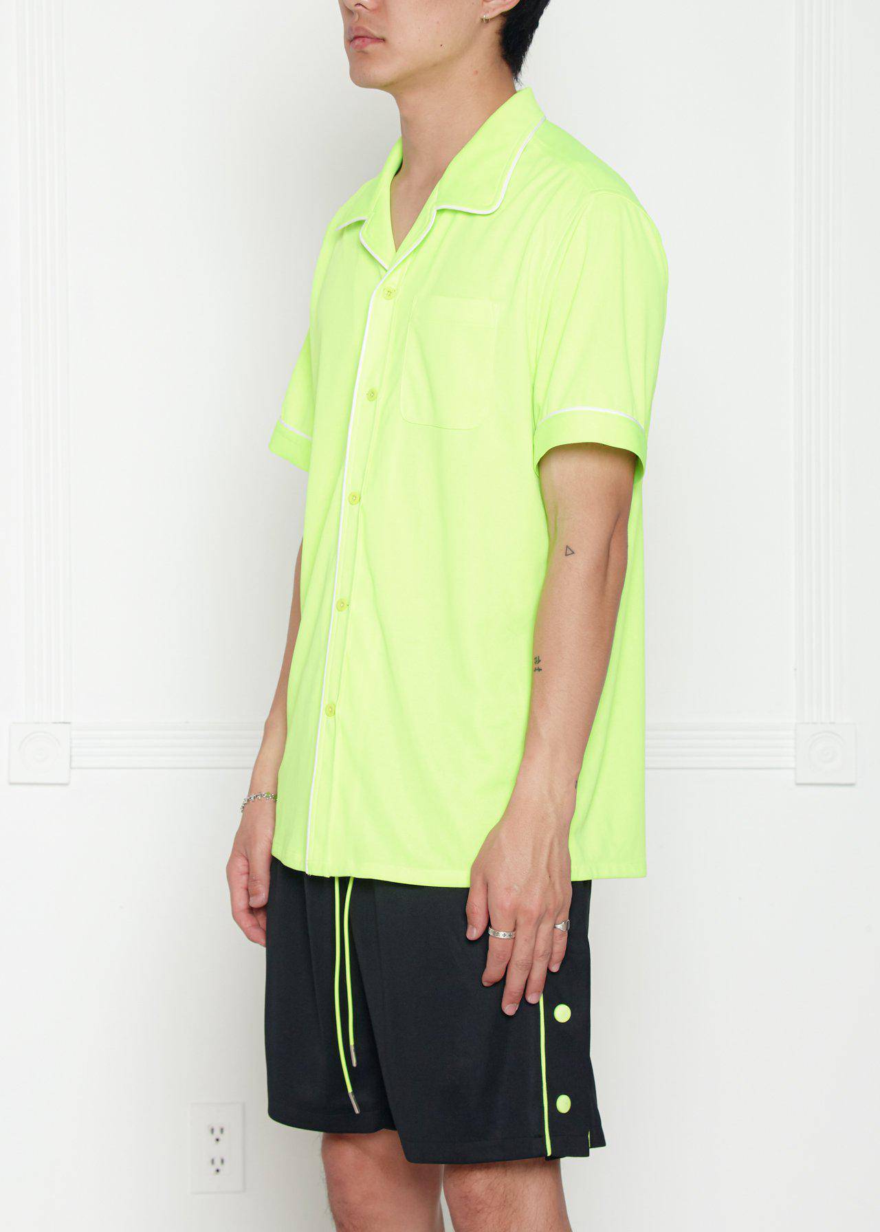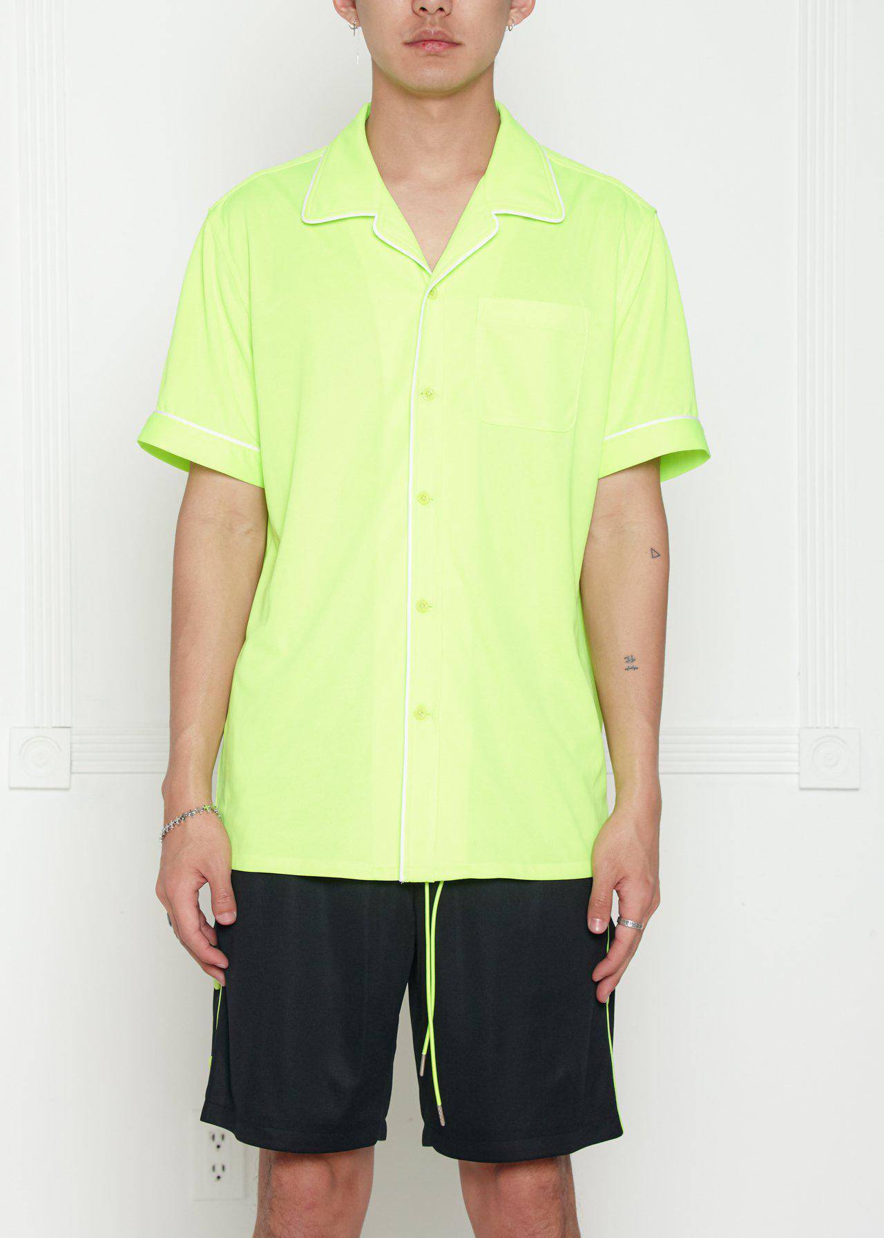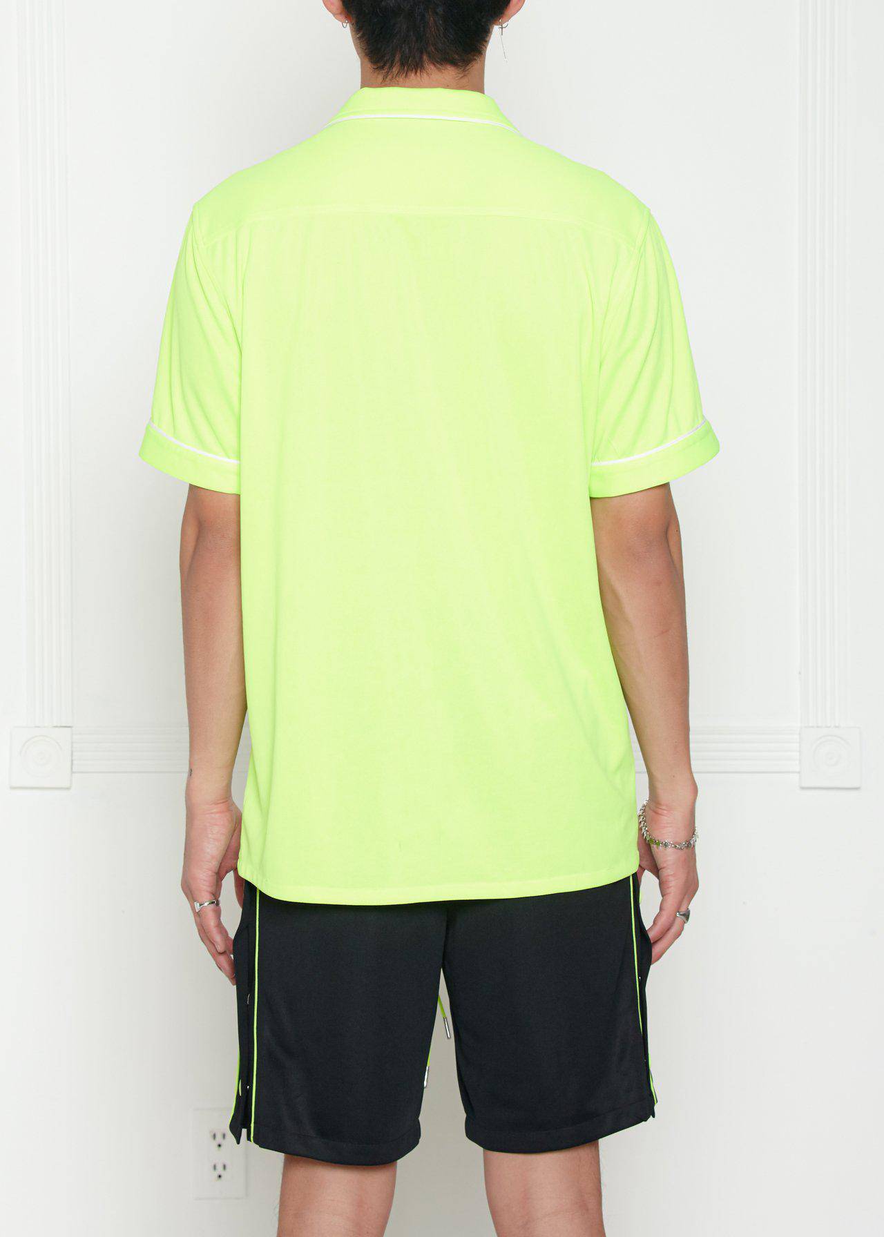 Short sleeve revere collar button-up shirt in tightly knitted mesh features white piping around the collar, placket, and sleeves.